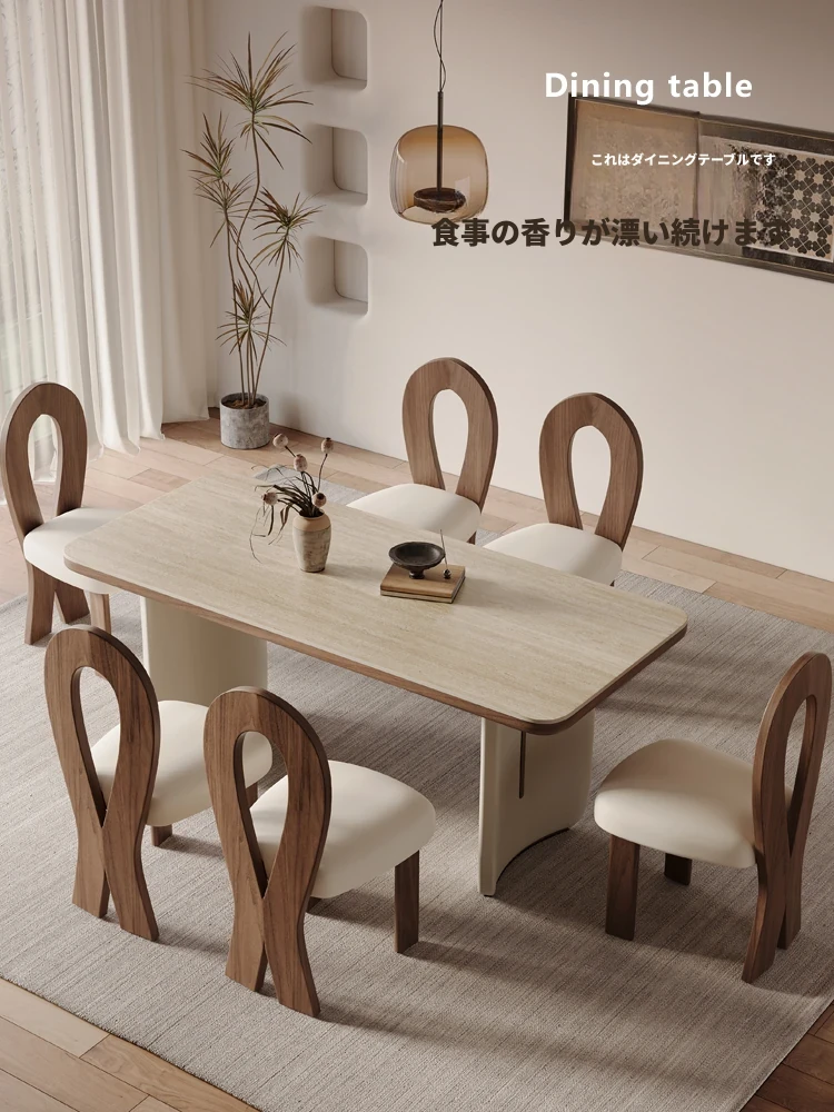 クリーム風の無垢材洞石岩板ダイニングテーブルと椅子のセット - 小型住宅に最適なフレンチヴィンテージスタイルの長方形テーブル、新登場!おしゃれなインテリアで食事の時間を特別に演出します。