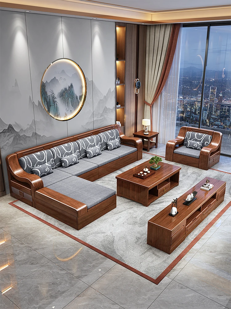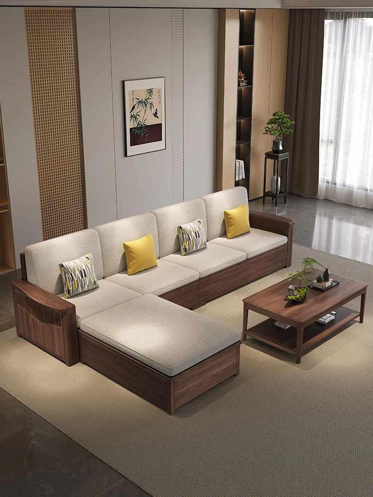 Modern Chinese Solid Black Walnut Sofa Set - All Solid Wood Living Room Furniture for Small Spaces, Natural Finish, Perfect for Cozy Homes