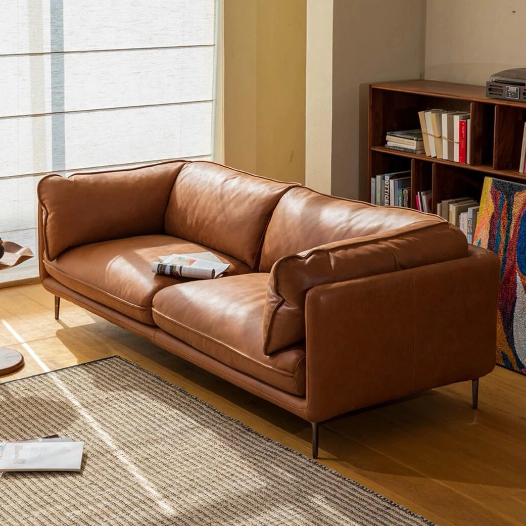 Nordic Minimalist Retro Genuine Top Layer Leather Sofa - Modern Industrial Style Three-Seat Couch for Small Spaces, Perfect for Your Living Room