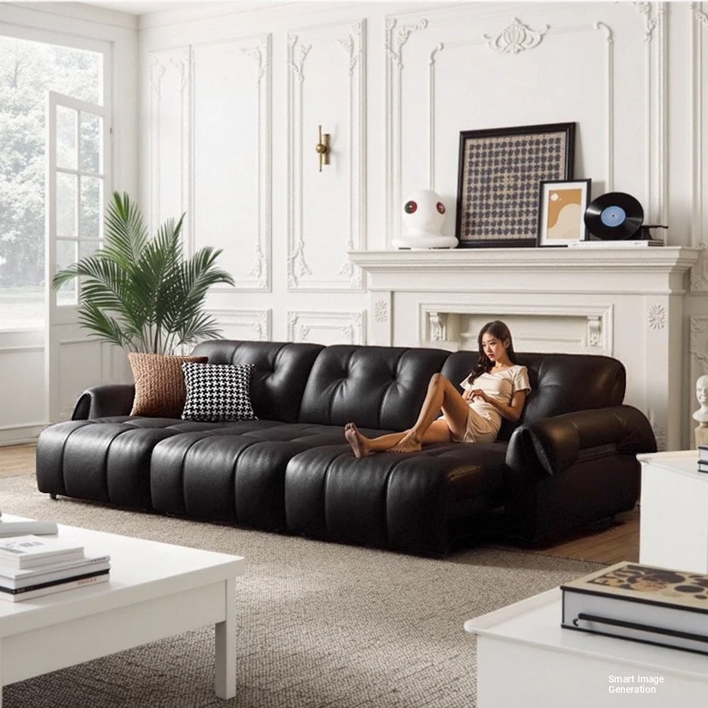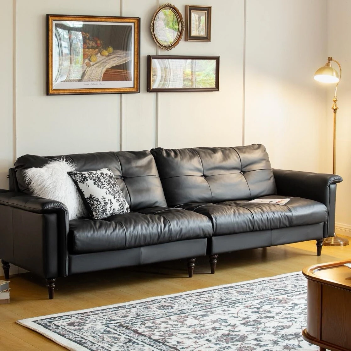 Vintage-Inspired Nebula Sofa - Black Top-Grain Leather, American Retro Style, Luxurious Yet Casual Living Room Sofa for Home Comfort