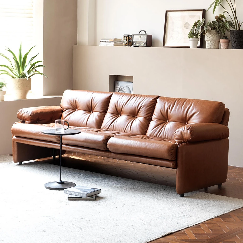 Vintage American Leather Sofa - Premium Top-Grain Waxed Cowhide Couch for Small Living Rooms, Ideal for Villas - Stylish Modular Design