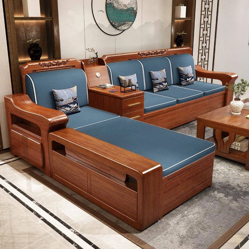 New Chinese Style Solid Walnut Wood Sofa Set - Versatile Winter-Summer Use, Ideal for Small Living Rooms, Featuring Storage and Corner Design.
