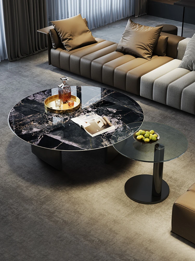 Modern Minimalist Round Coffee Table with Expandable Storage - TV Cabinet Featuring Rock Plate Finish and Carbon Steel Legs - Chic and Elegant Design