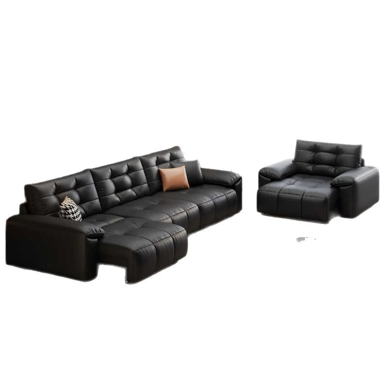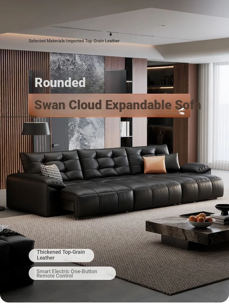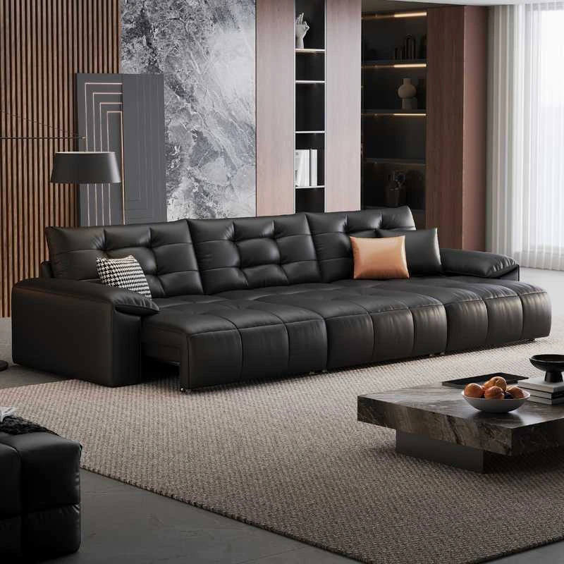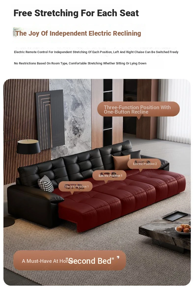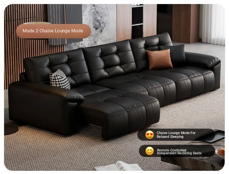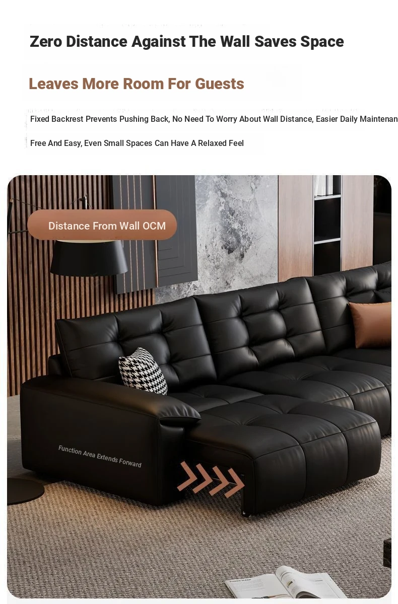 2025 New Wall-Hugging Electric Reclining Sofa with Extendable Headrest - Sleek Black Genuine Leather Bed Combo with Top-Grain Cowhide