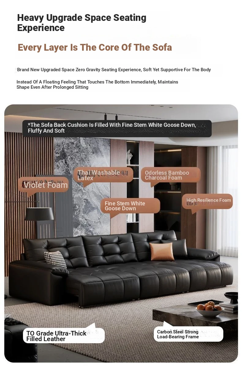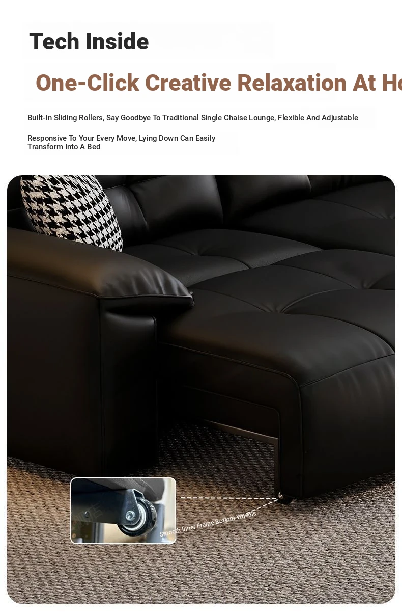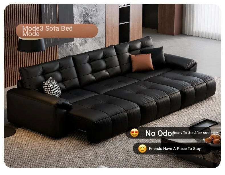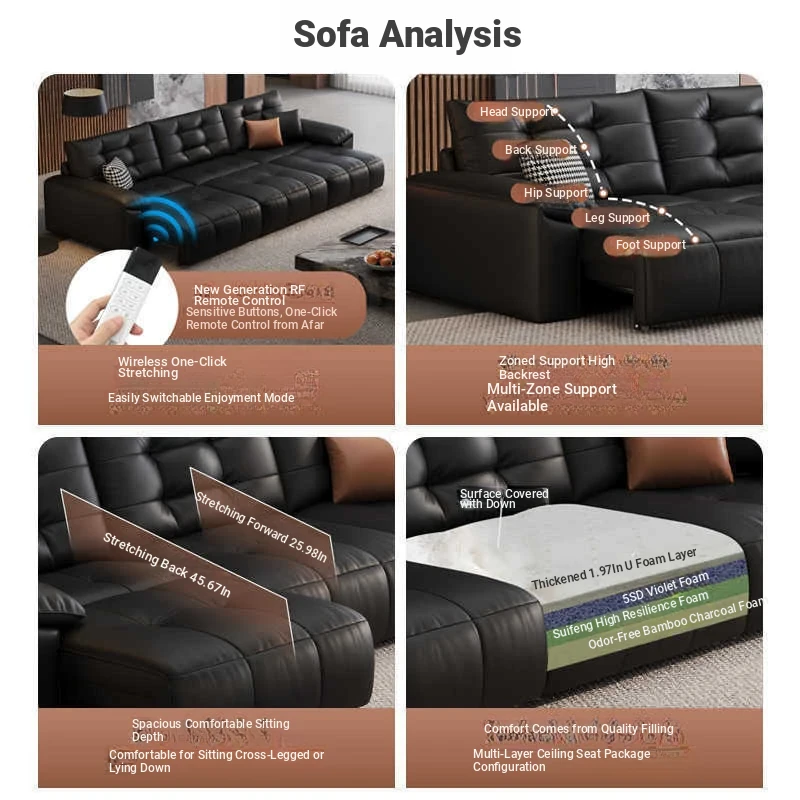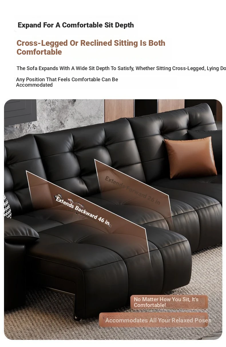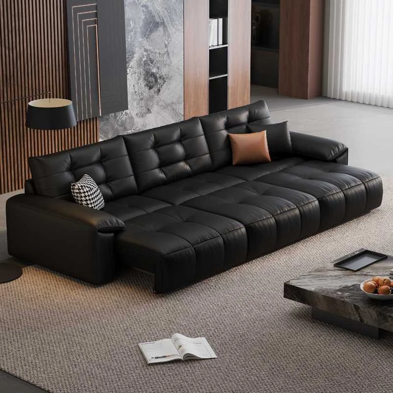 2025 New Wall-Hugging Electric Reclining Sofa with Extendable Headrest - Sleek Black Genuine Leather Bed Combo with Top-Grain Cowhide