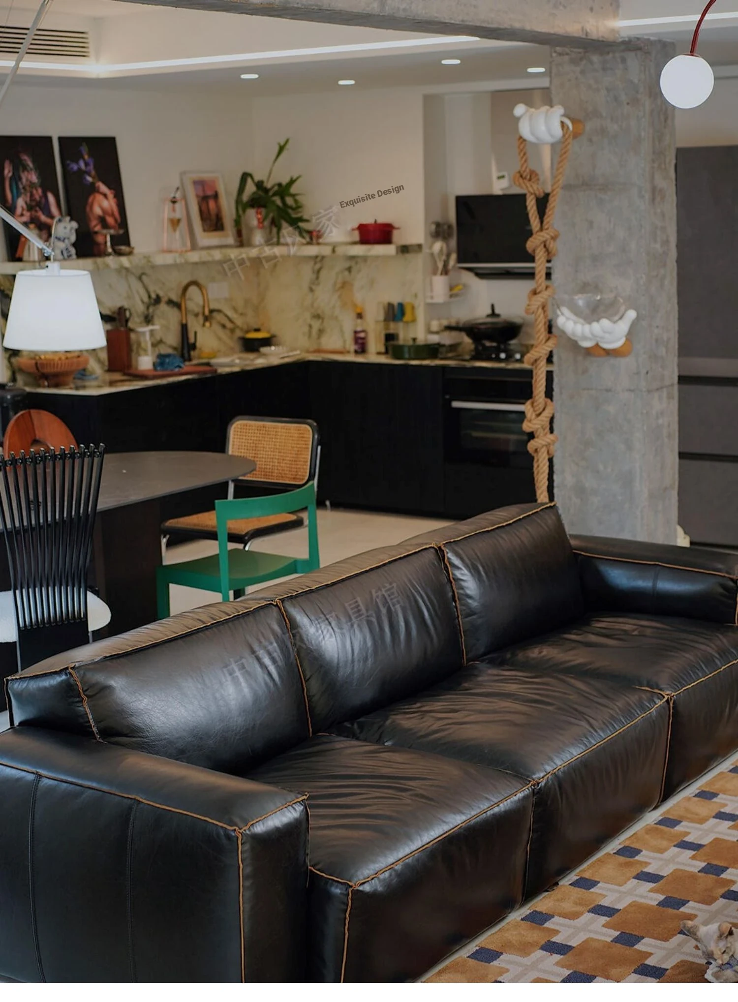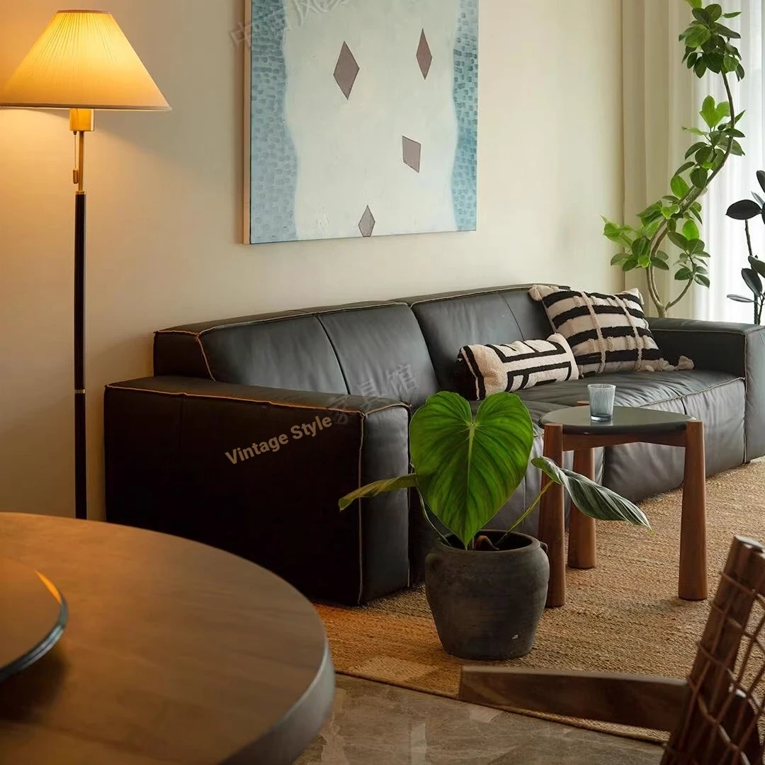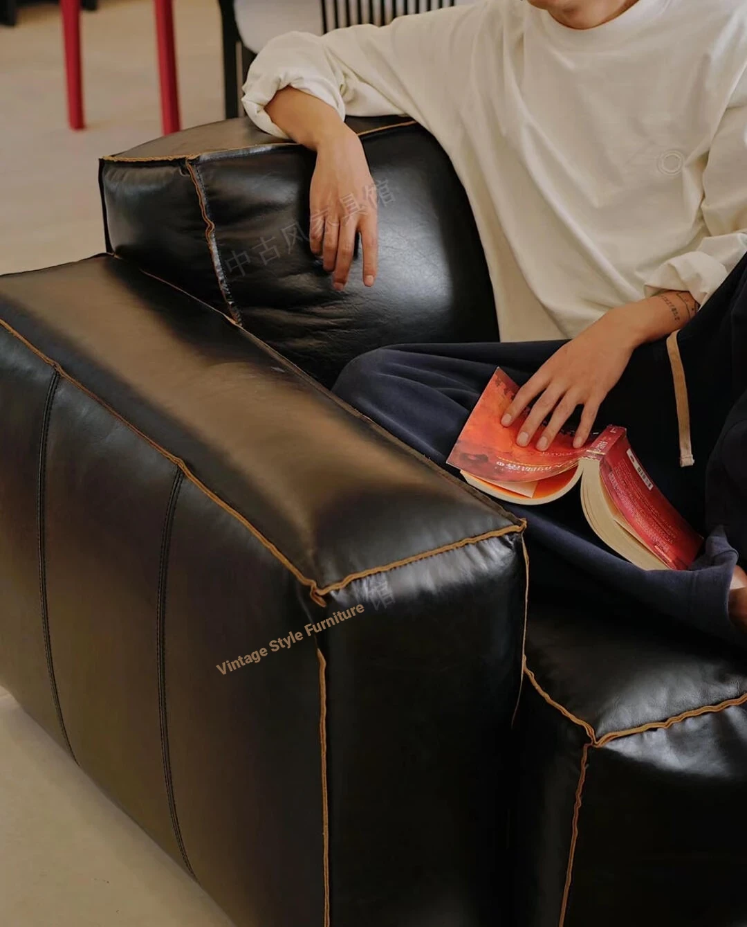 Designer Black Tofu Block Modular Sofa - Modern Minimalist Retro Oil Wax Three-Seater for Spacious Living Rooms