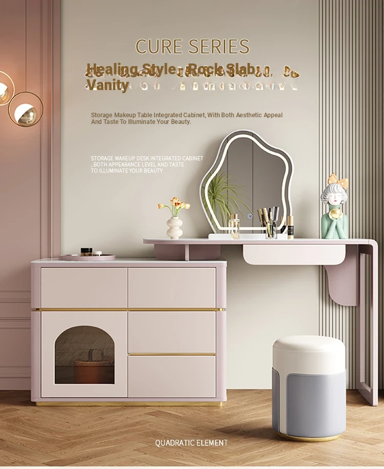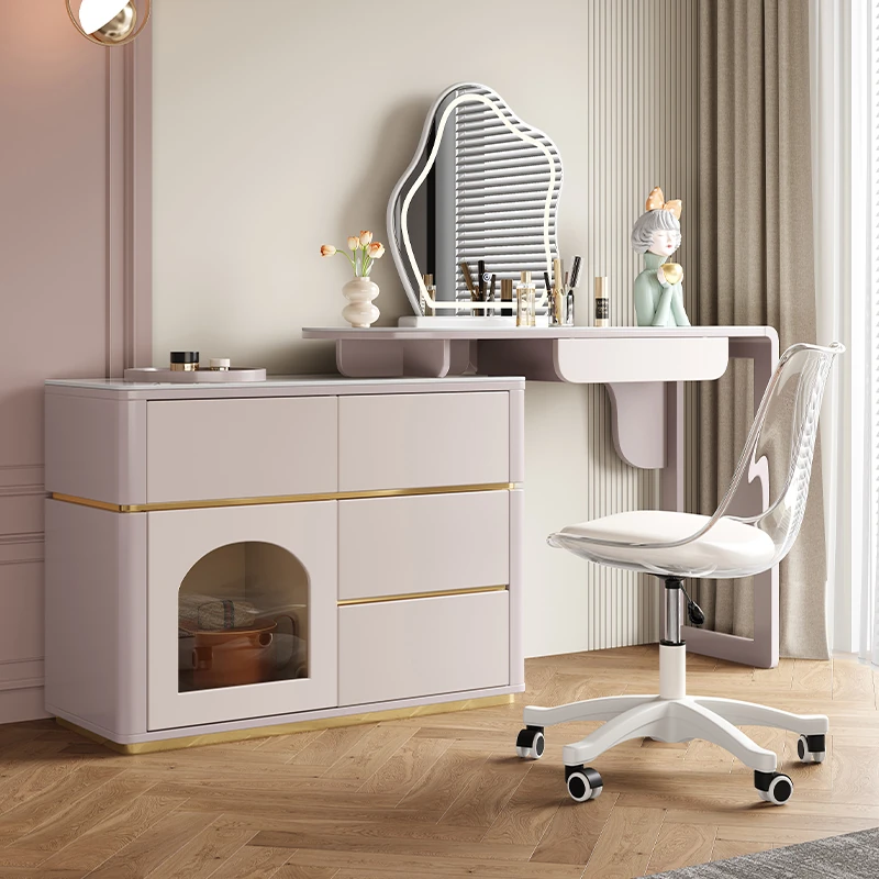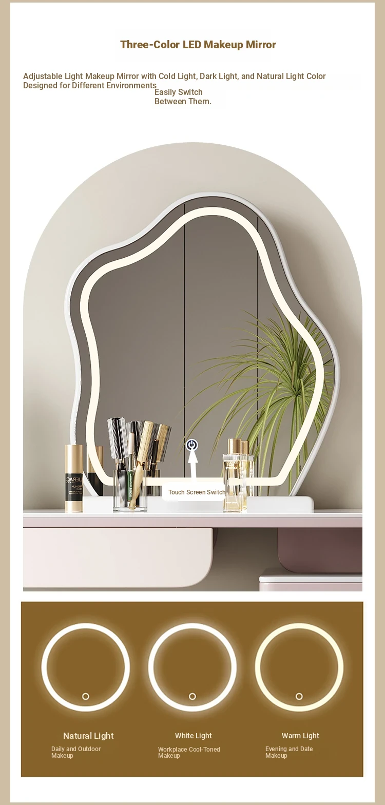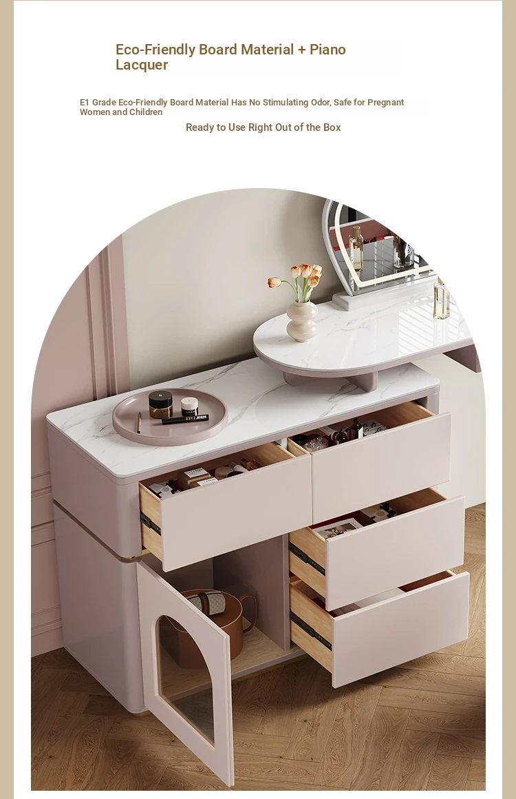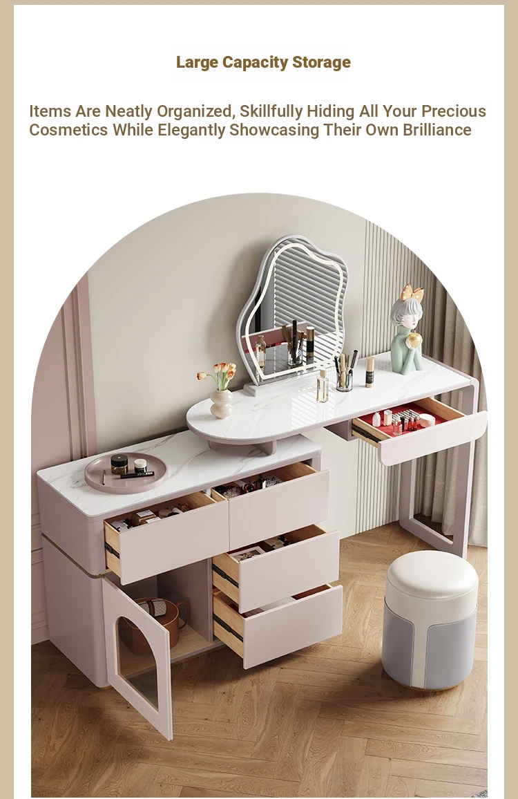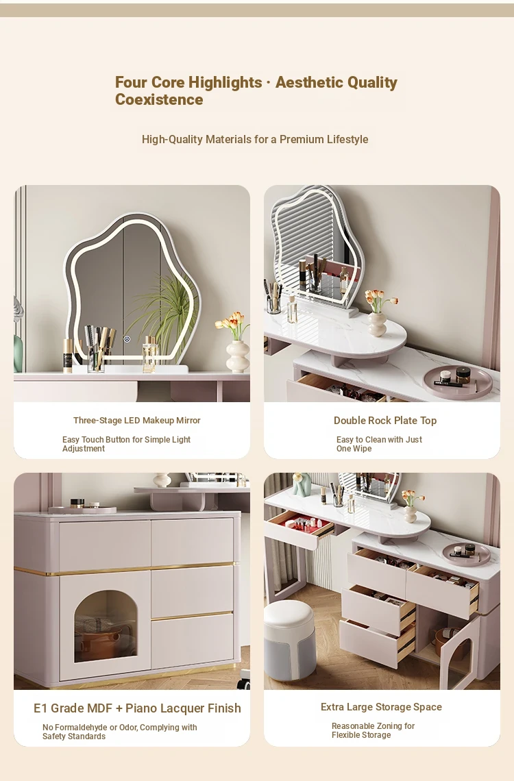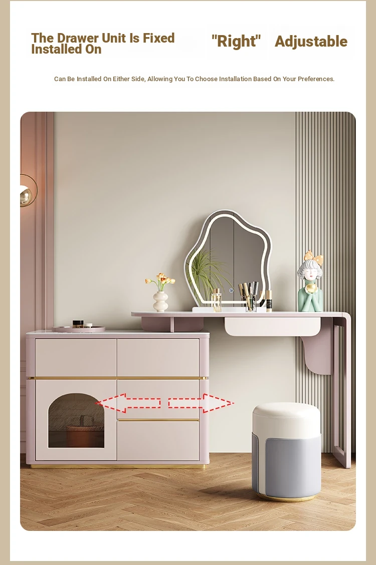 French Cream Vanity Makeup Table - Modern Minimalist Design with Expandable Storage - Elegant Small-Space Solution for Chic Homes