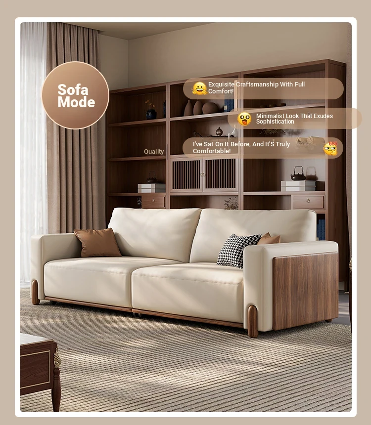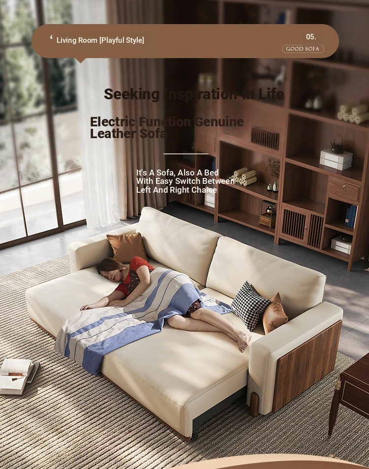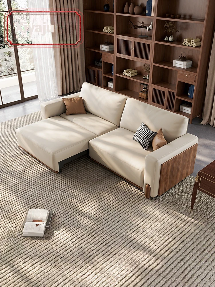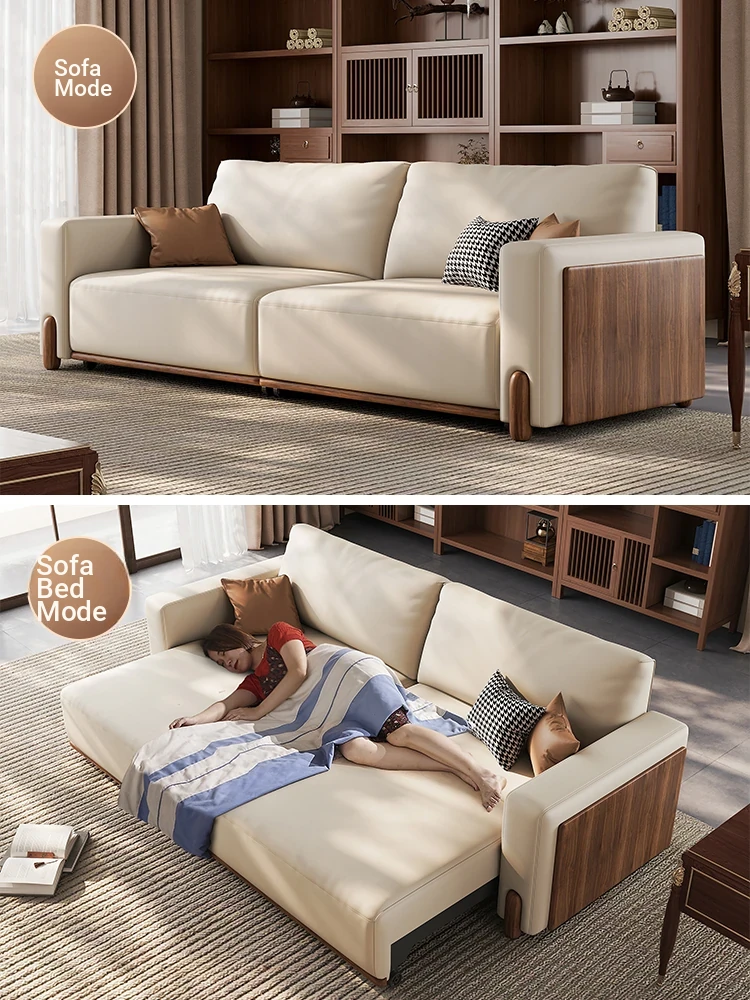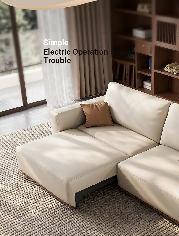 Modern Chinese Style Convertible Electric Sofa Bed - Smart Multifunctional Solid Wood & Genuine Leather Design for Living Room - Space-Saving & Stylish