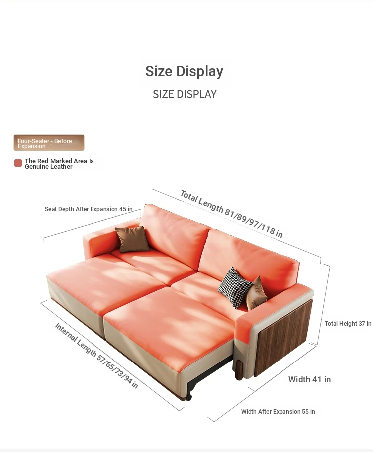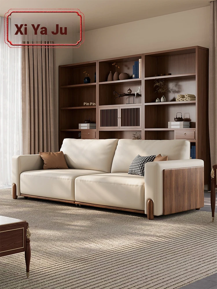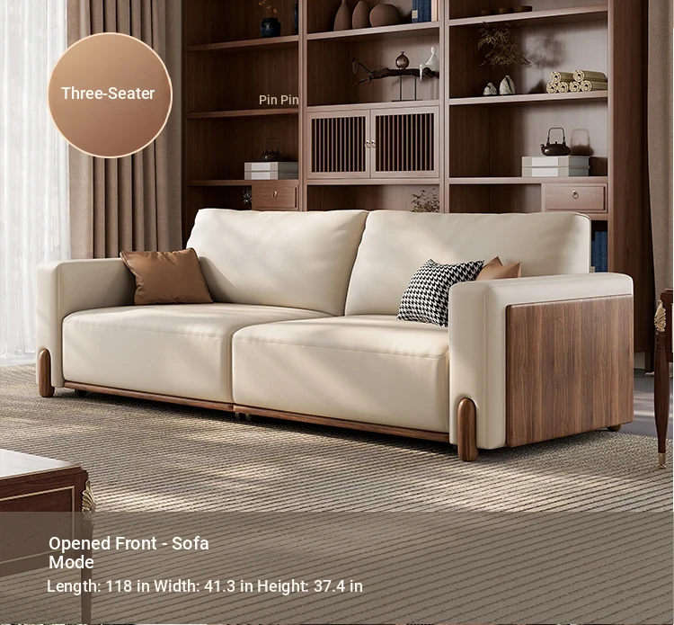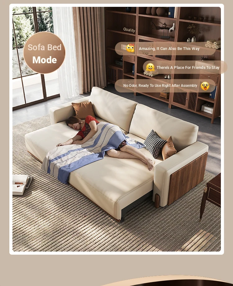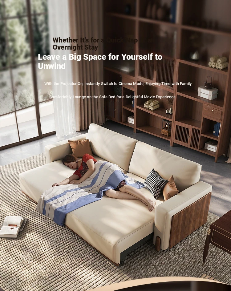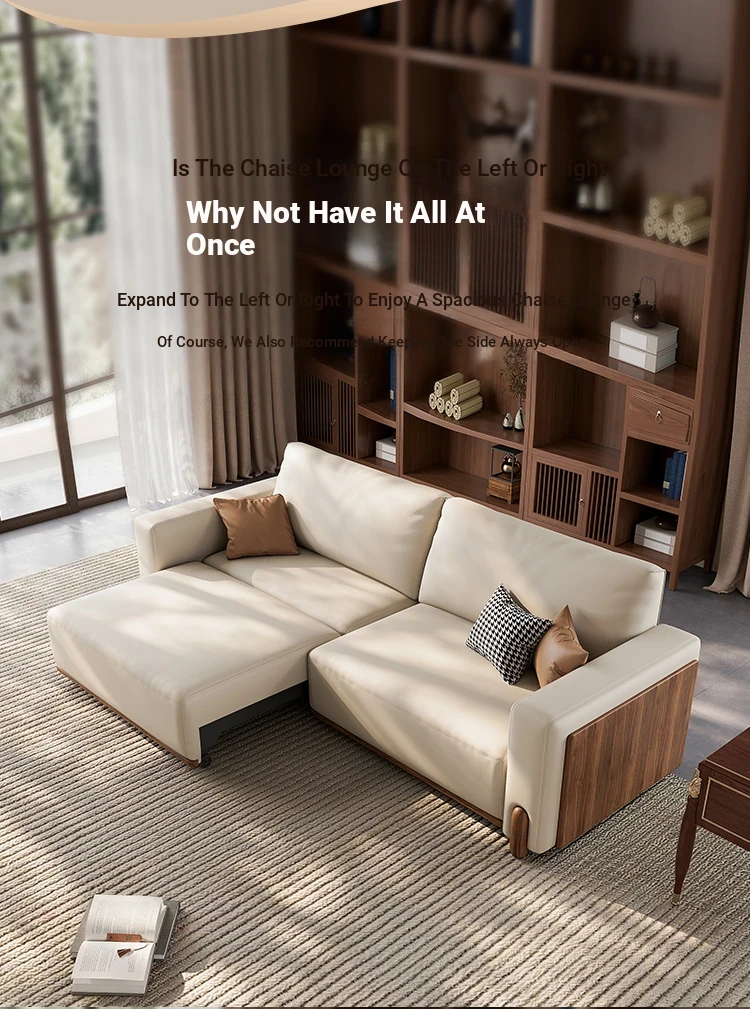Modern Chinese Style Convertible Electric Sofa Bed - Smart Multifunctional Solid Wood & Genuine Leather Design for Living Room - Space-Saving & Stylish
