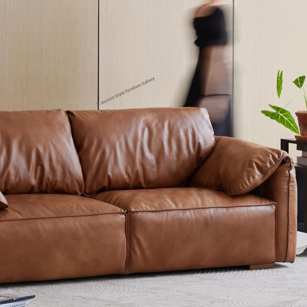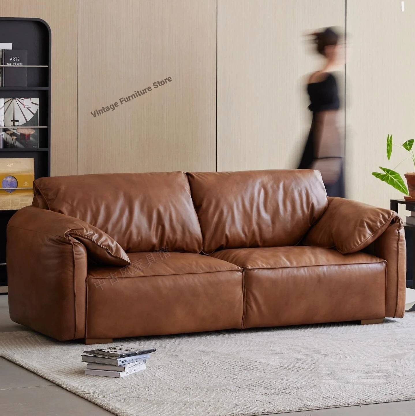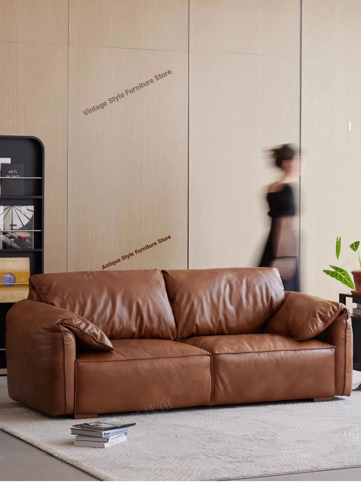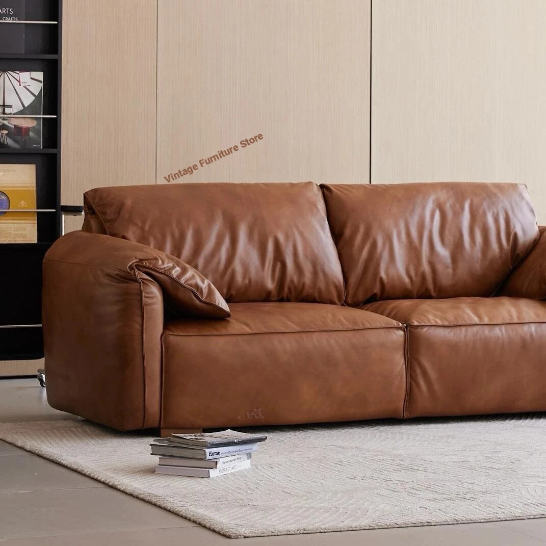 Modern French-Inspired Vintage Elephant Ear Leather Sofa - Premium Top-Grain Cowhide Upholstery for a Luxurious Living Room Experience