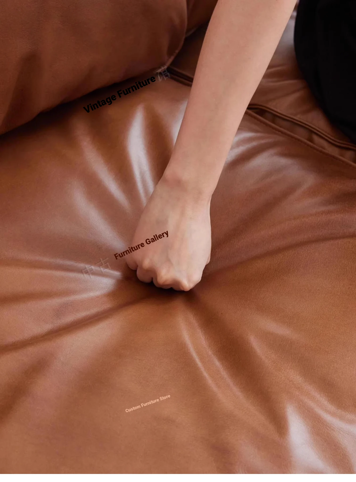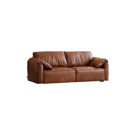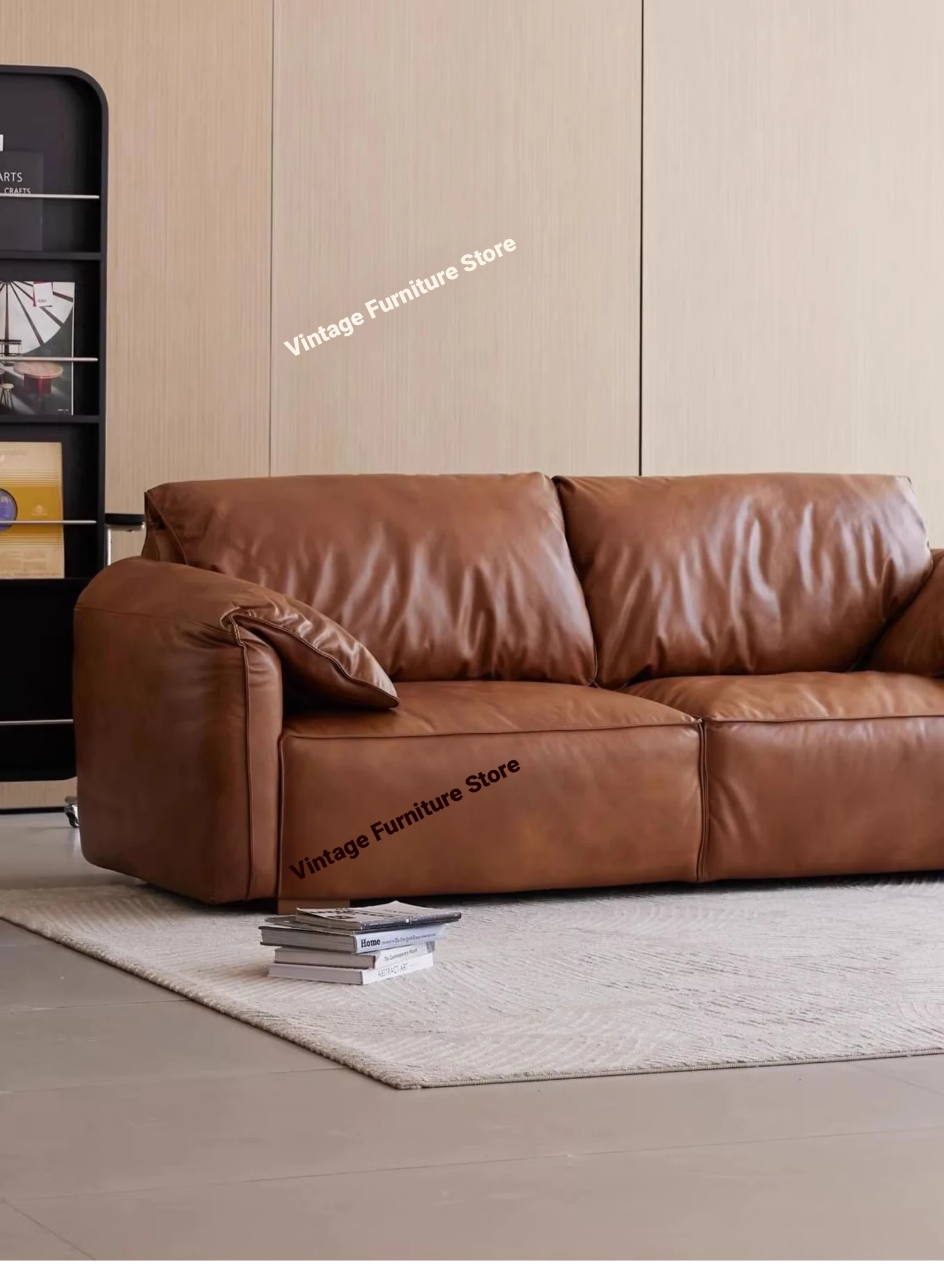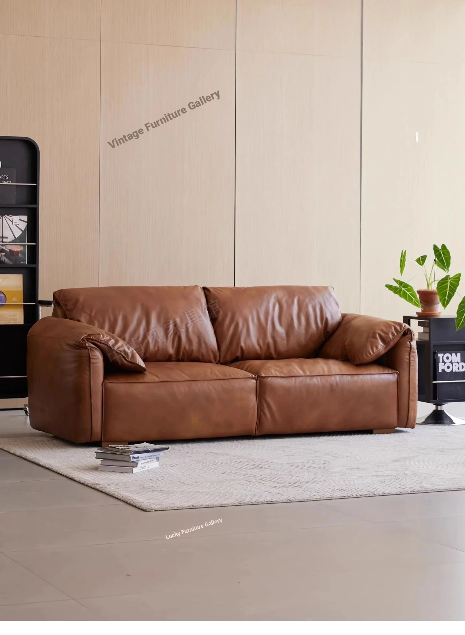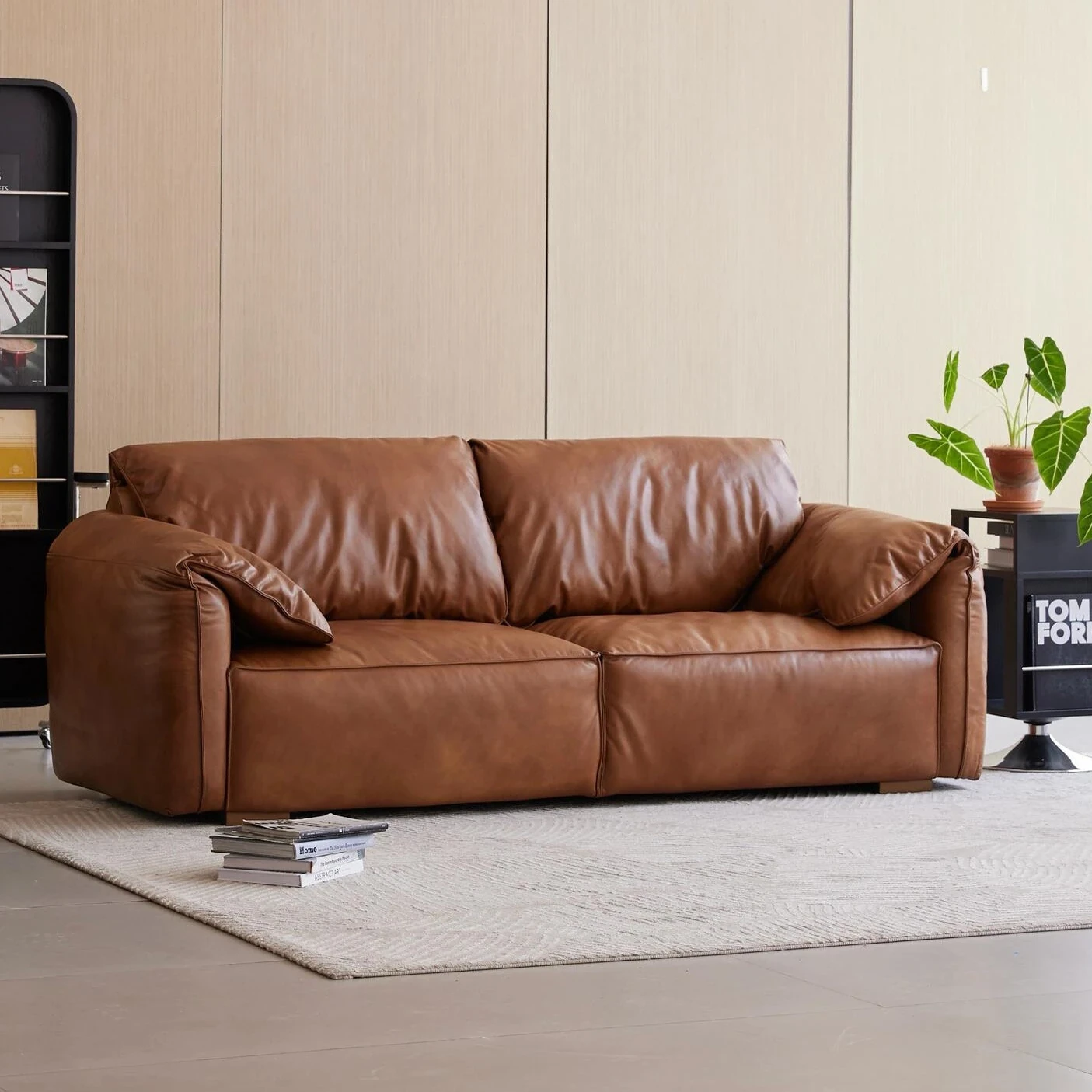 Modern French-Inspired Vintage Elephant Ear Leather Sofa - Premium Top-Grain Cowhide Upholstery for a Luxurious Living Room Experience