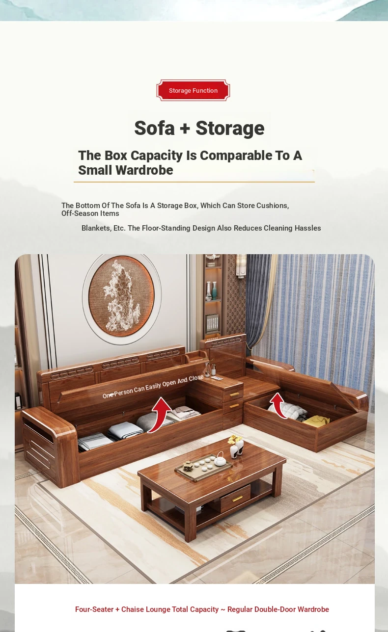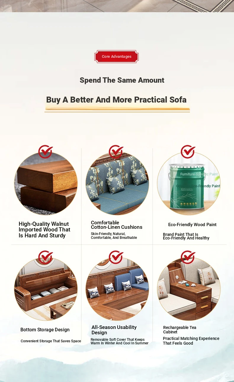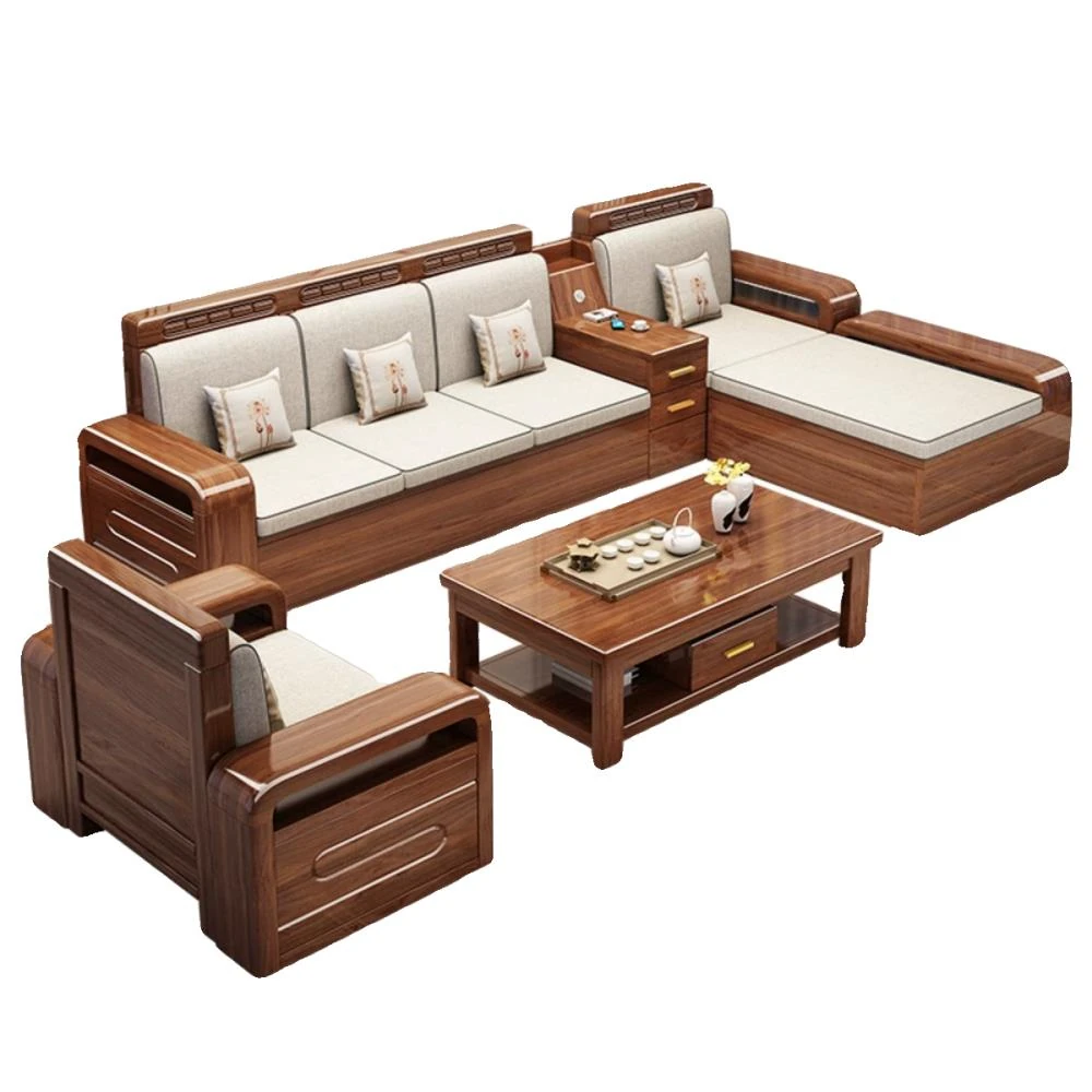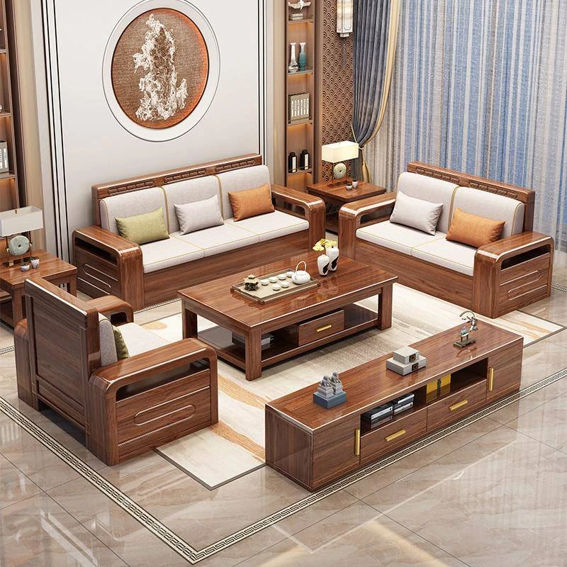 New Chinese Style Solid Walnut Wood Sofa Set - Versatile Winter-Summer Use, Ideal for Small Living Rooms, Featuring Storage and Corner Design.