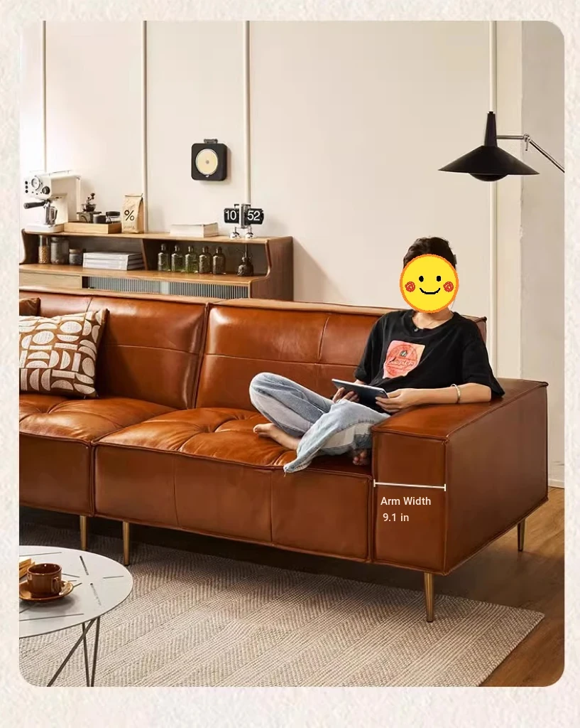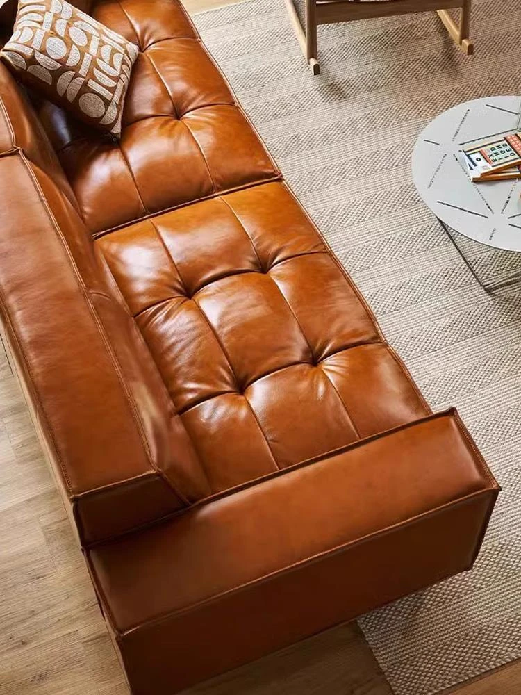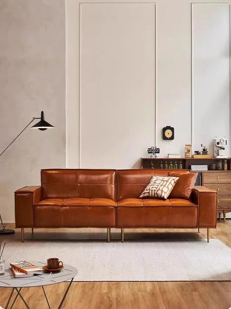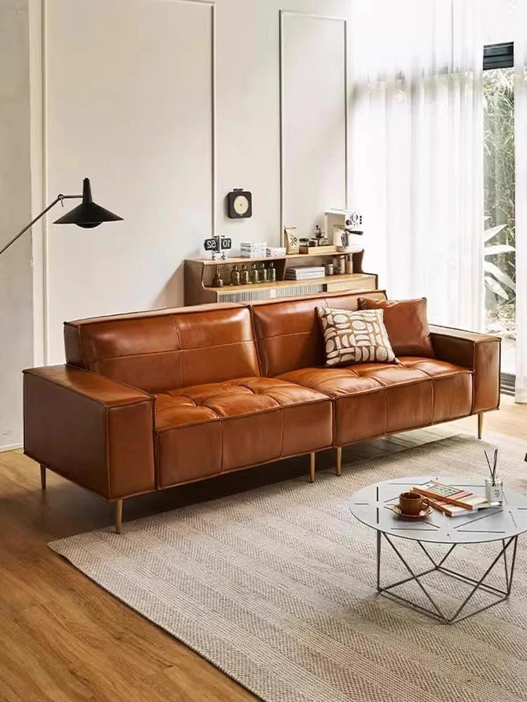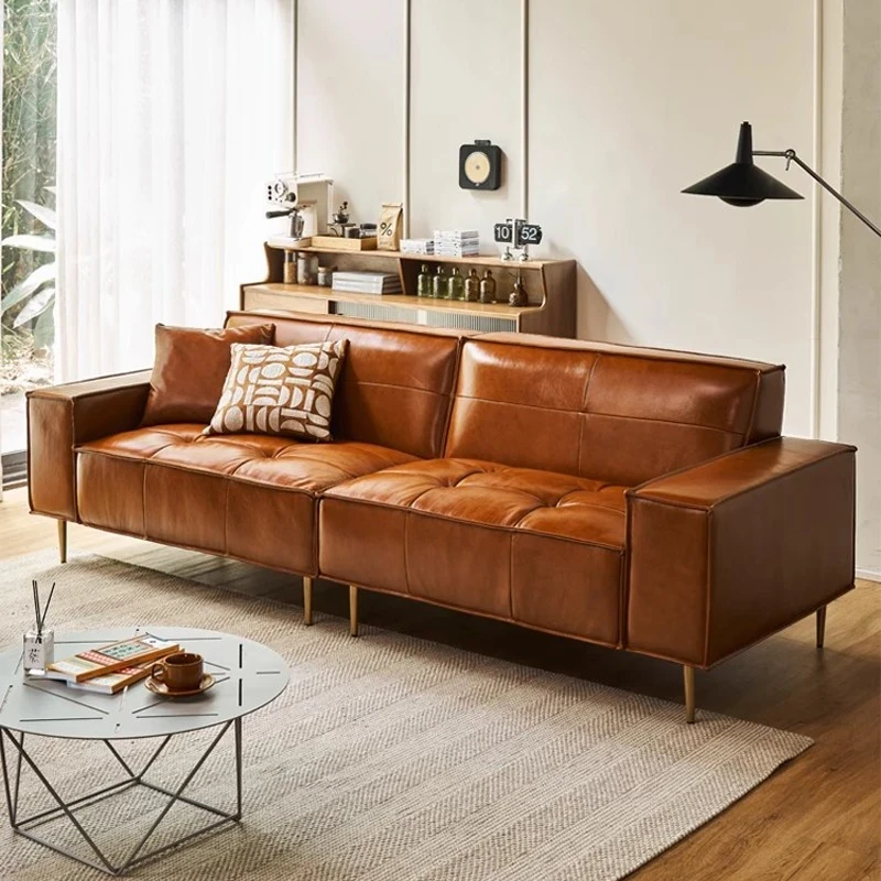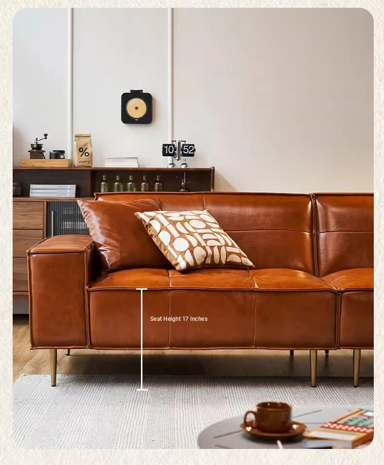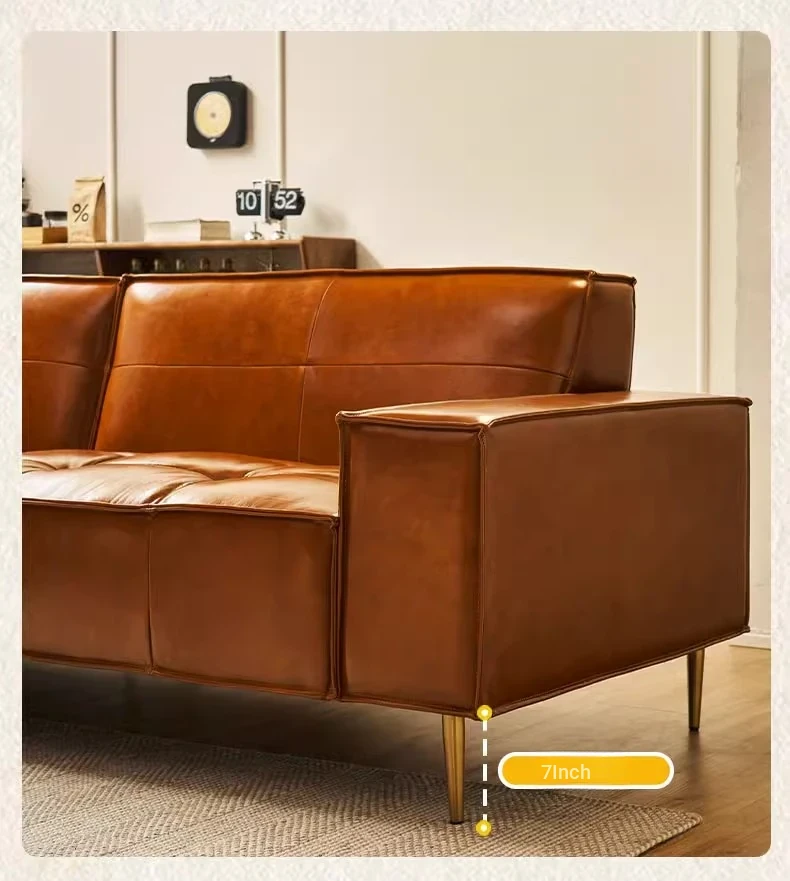 Vintage Caramel Waxed Leather Sofa - Genuine Top Grain Cowhide, Glossy Finish, Perfect for Small Living Rooms, Mid-Century Style High Legs