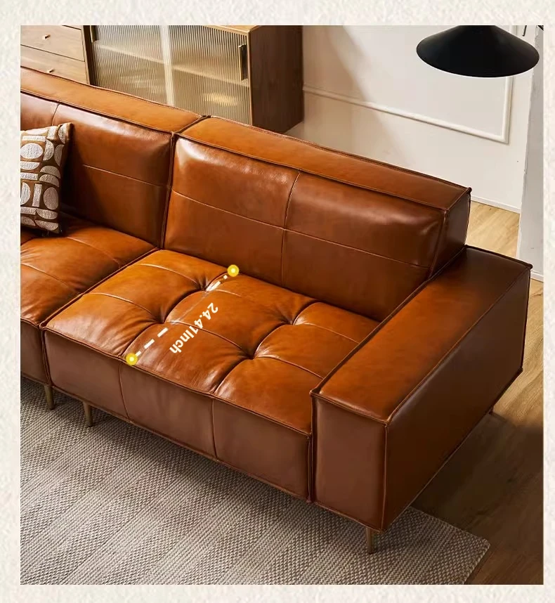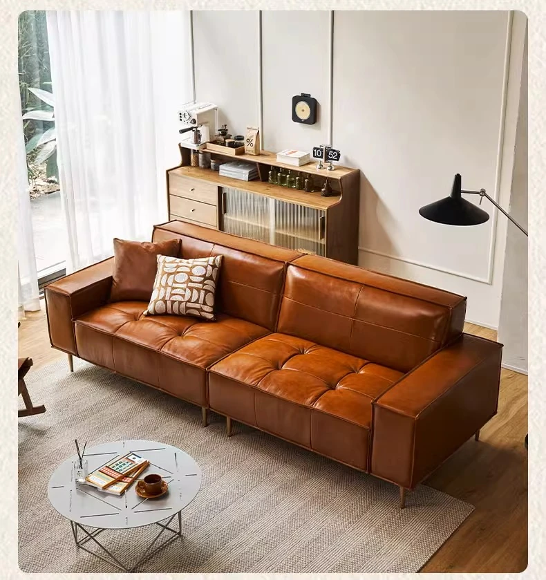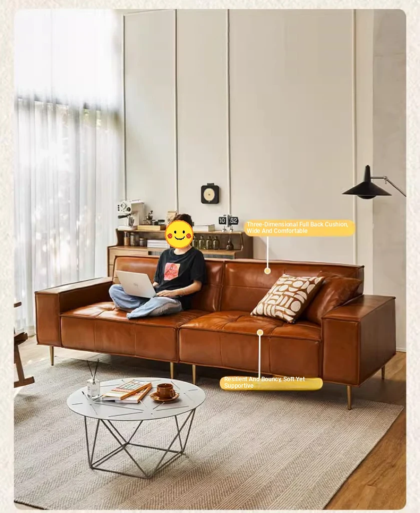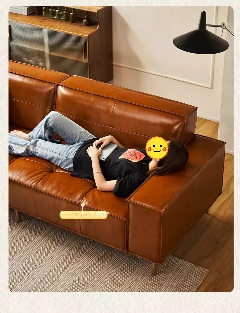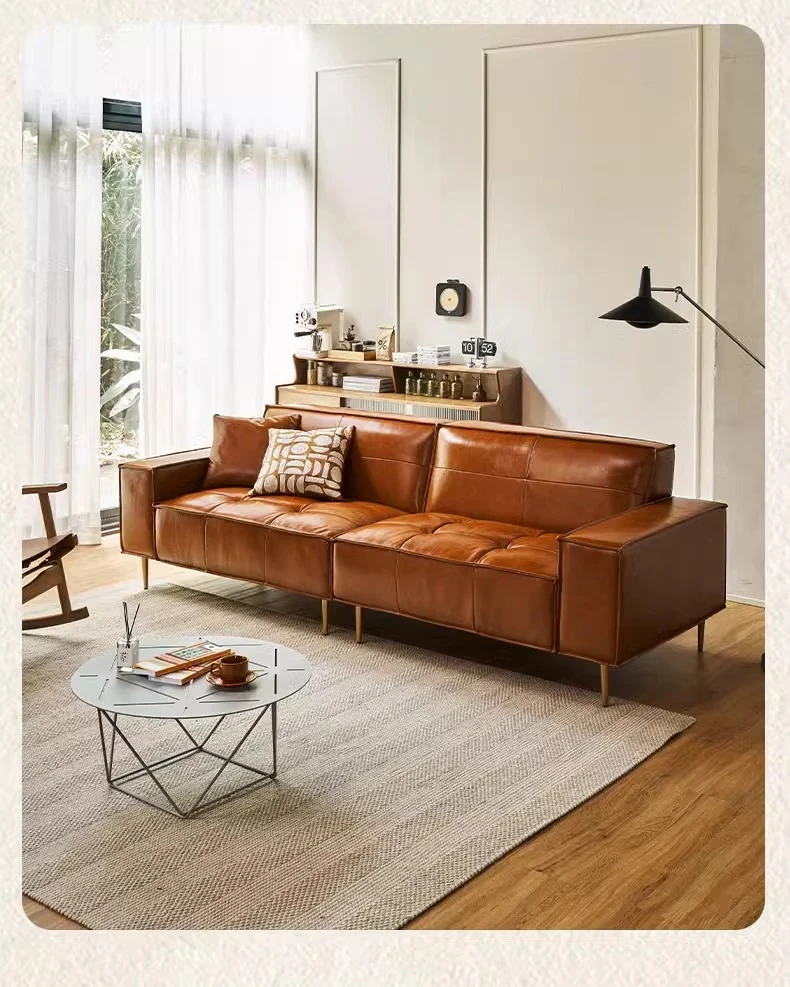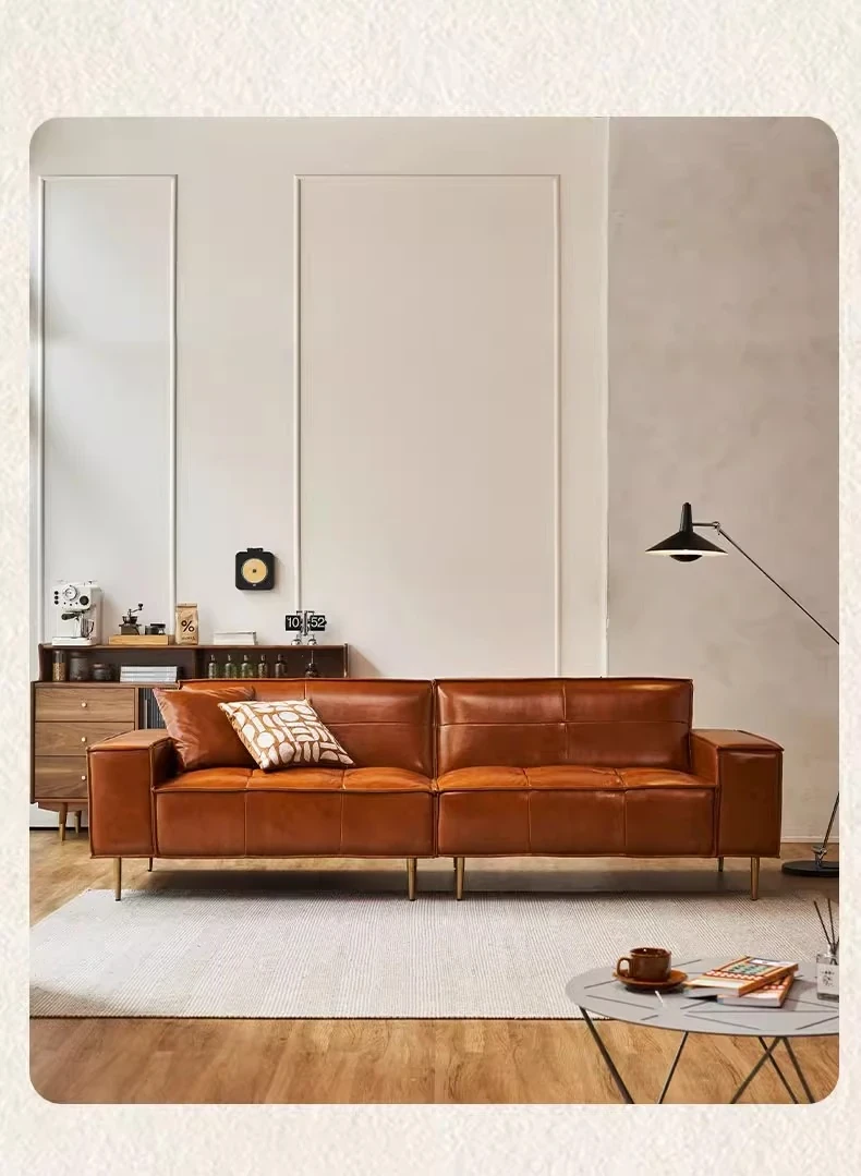 Vintage Caramel Waxed Leather Sofa - Genuine Top Grain Cowhide, Glossy Finish, Perfect for Small Living Rooms, Mid-Century Style High Legs