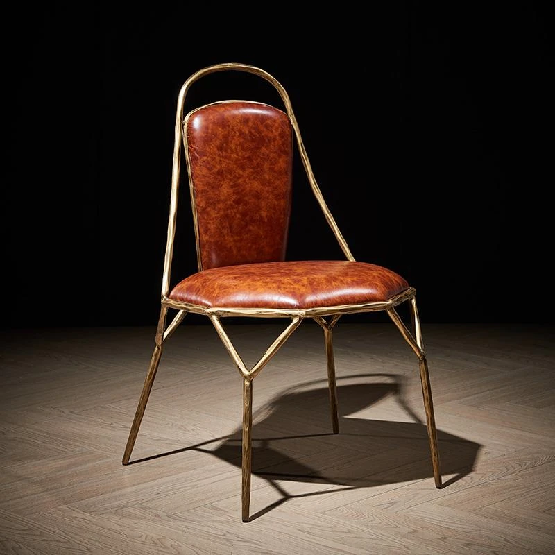 Vintage French Style Wrought Iron Copper Color Dining Chair with Oil Wax Leather - High-End Designer Dining Table and Chair Set, Perfect for Elegant Interiors