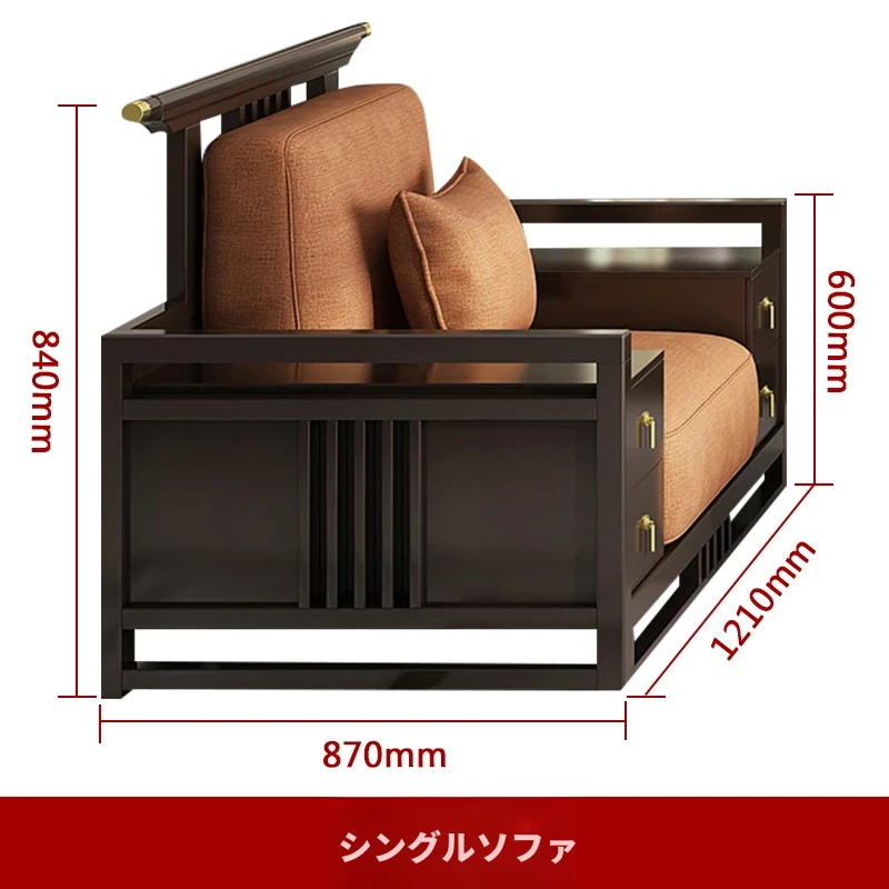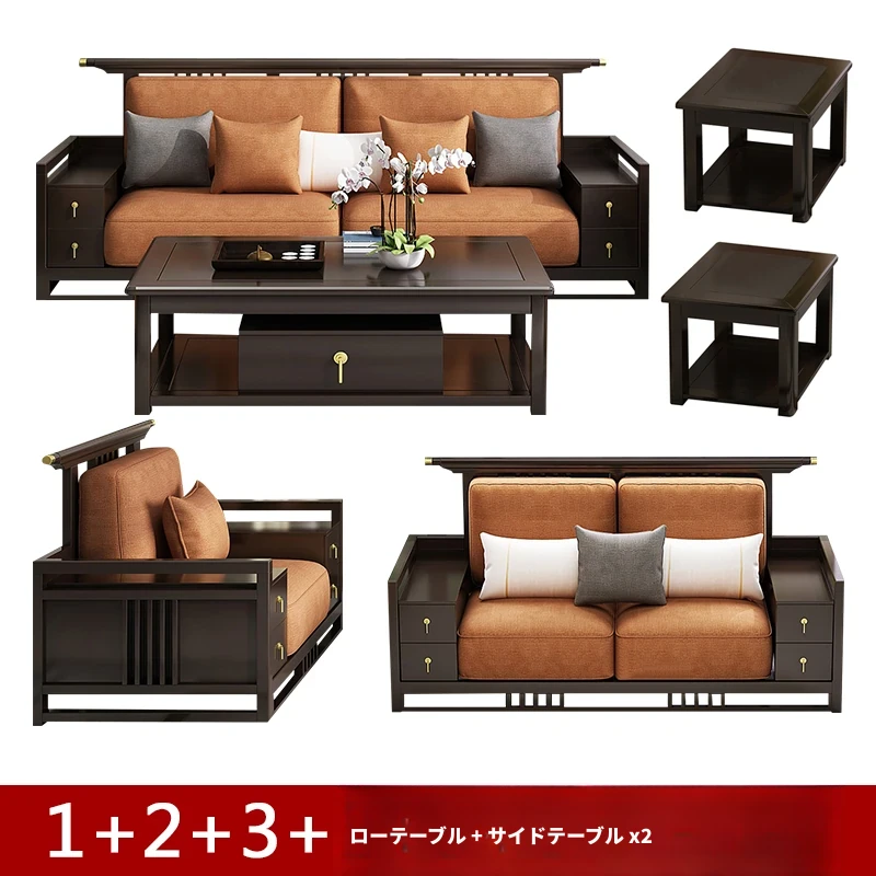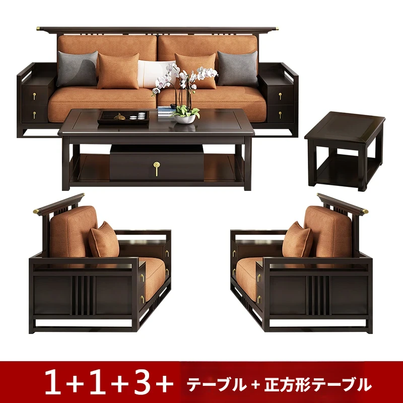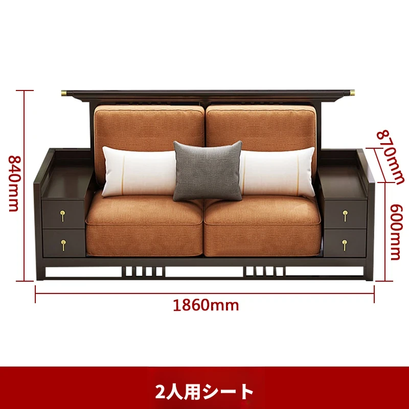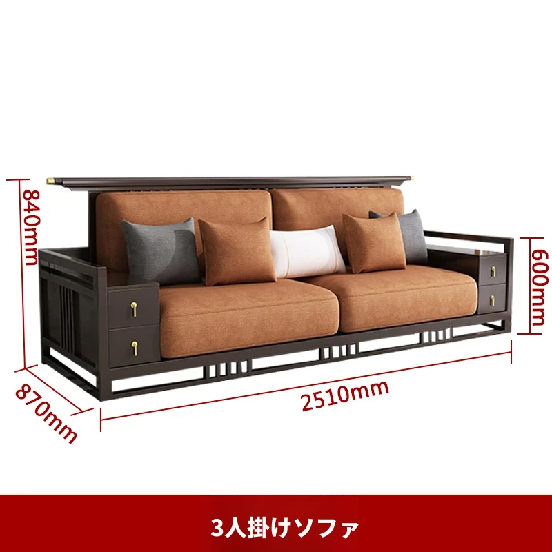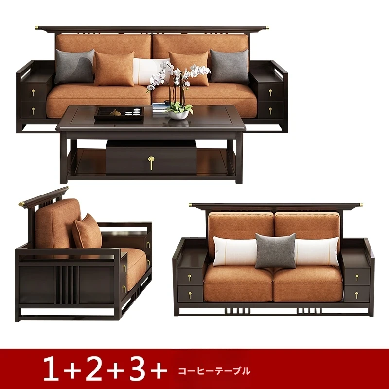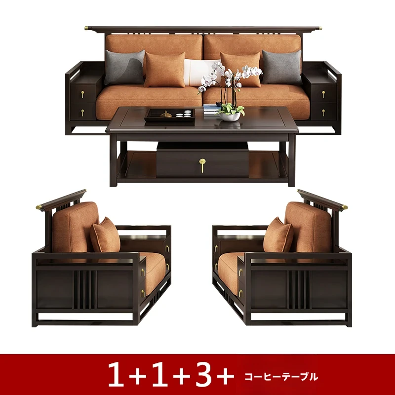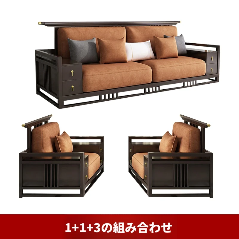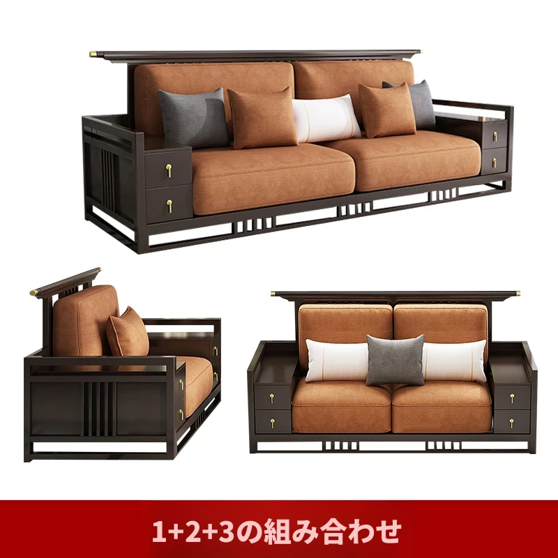 新中式デザインの実木ソファ 2024年新作!モダンでスタイリッシュなリビング向け、大小どんなお部屋にもフィット。冬も夏も快適に使え、収納機能付きでお部屋をスッキリ整理!