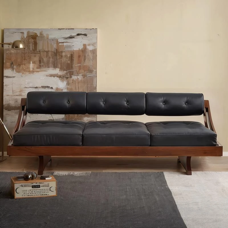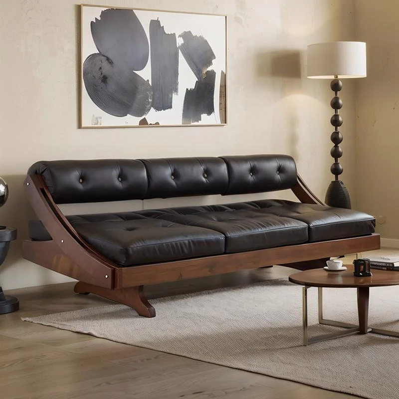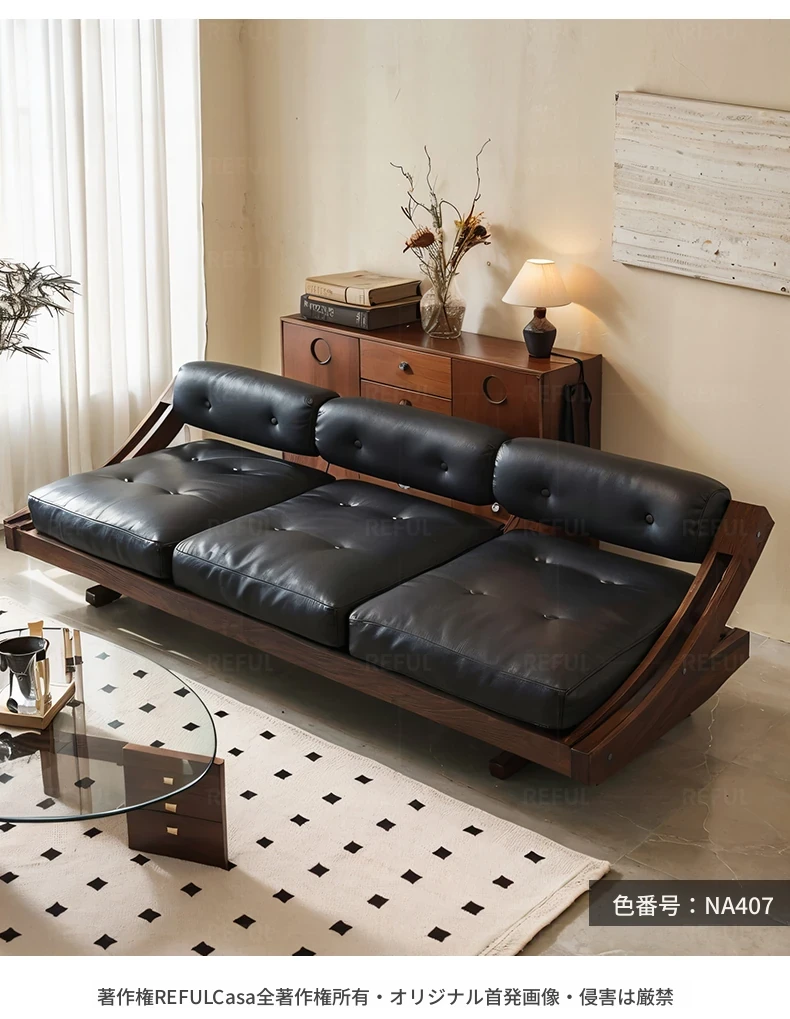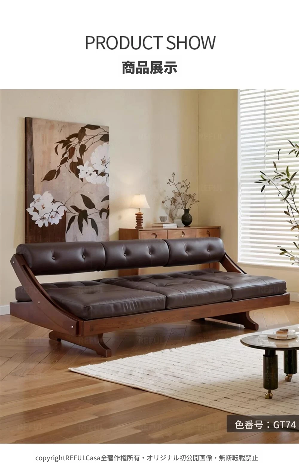 新中式スタイルの実木製レトロソファ 2024年新作 本革使用 ブラックカラー 中古風デザイン オリジナルで洗練されたリビングの雰囲気を演出!