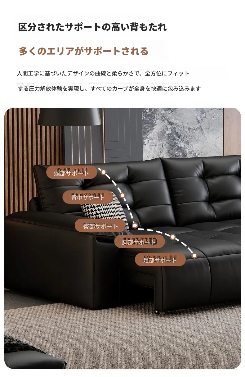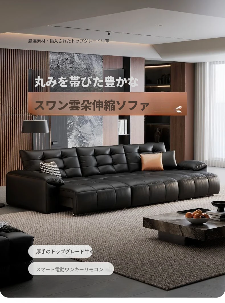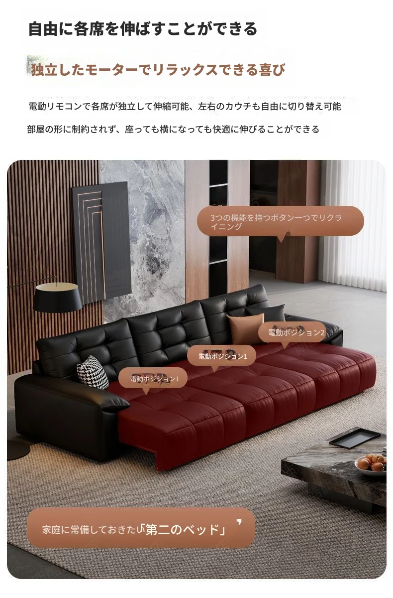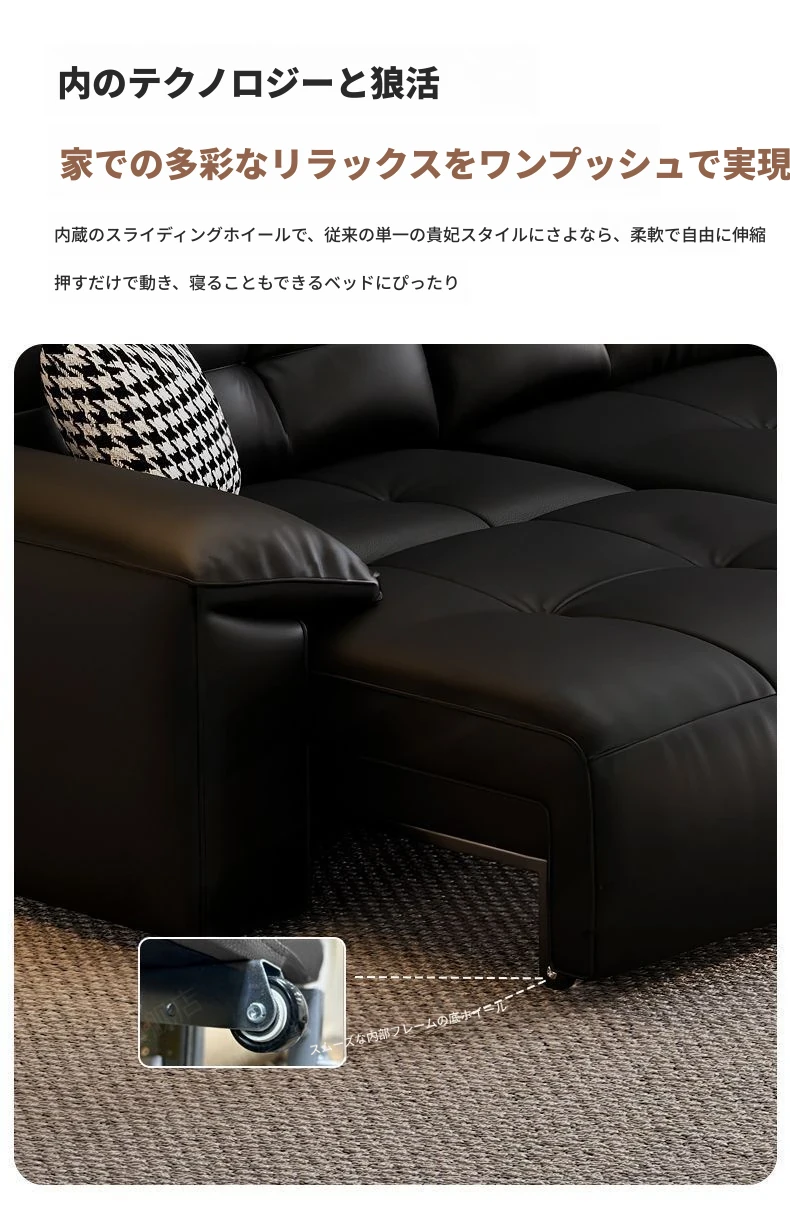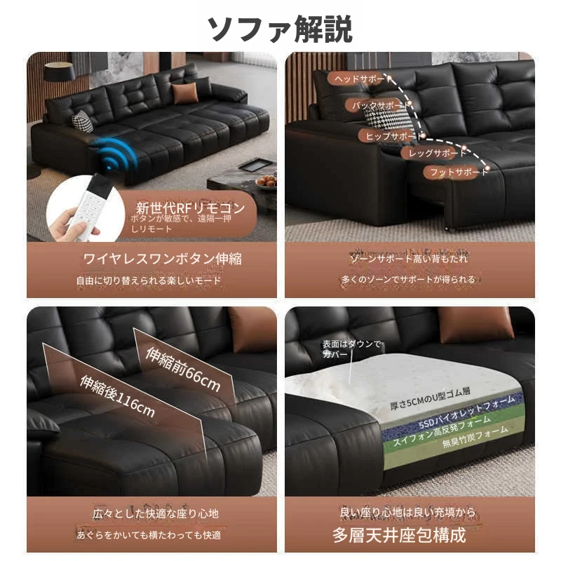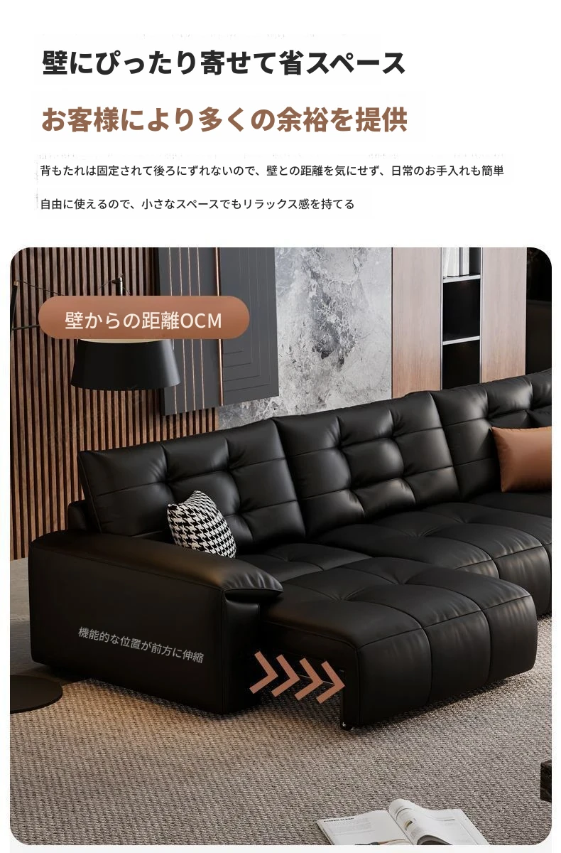 2025年新作!壁に寄せない電動スライド機能付き、ブラック本革ソファ!伸縮可能なトップグレインレザーのベッドコンビネーションで、快適さとスタイルを両立。あなたのリビングに最適な選択!