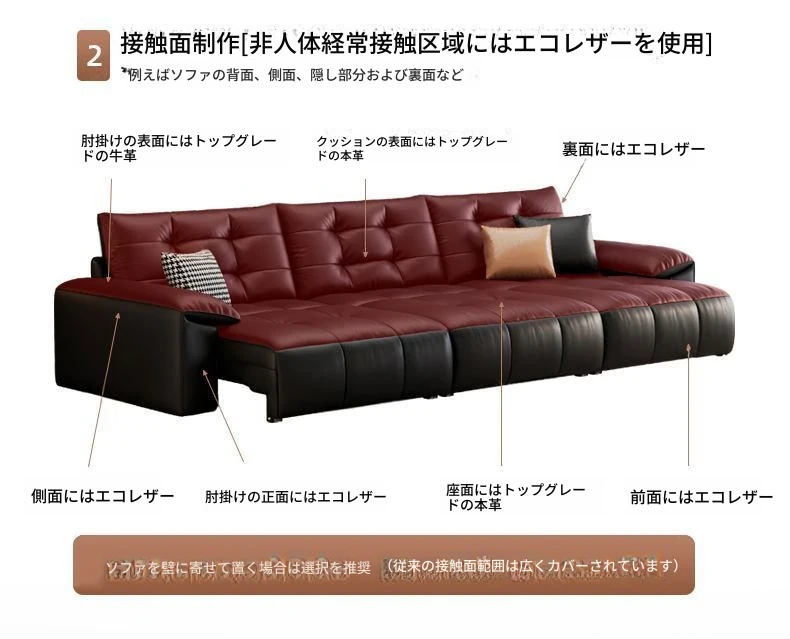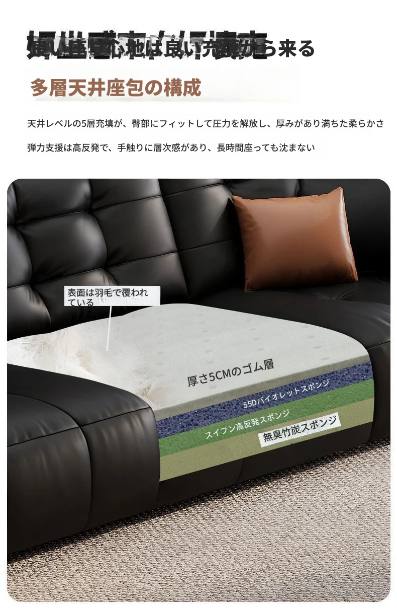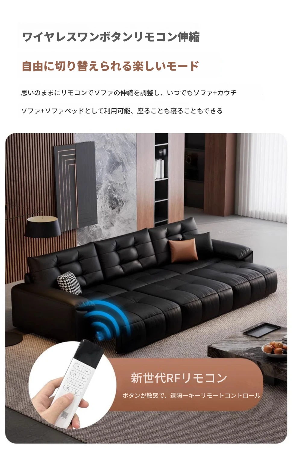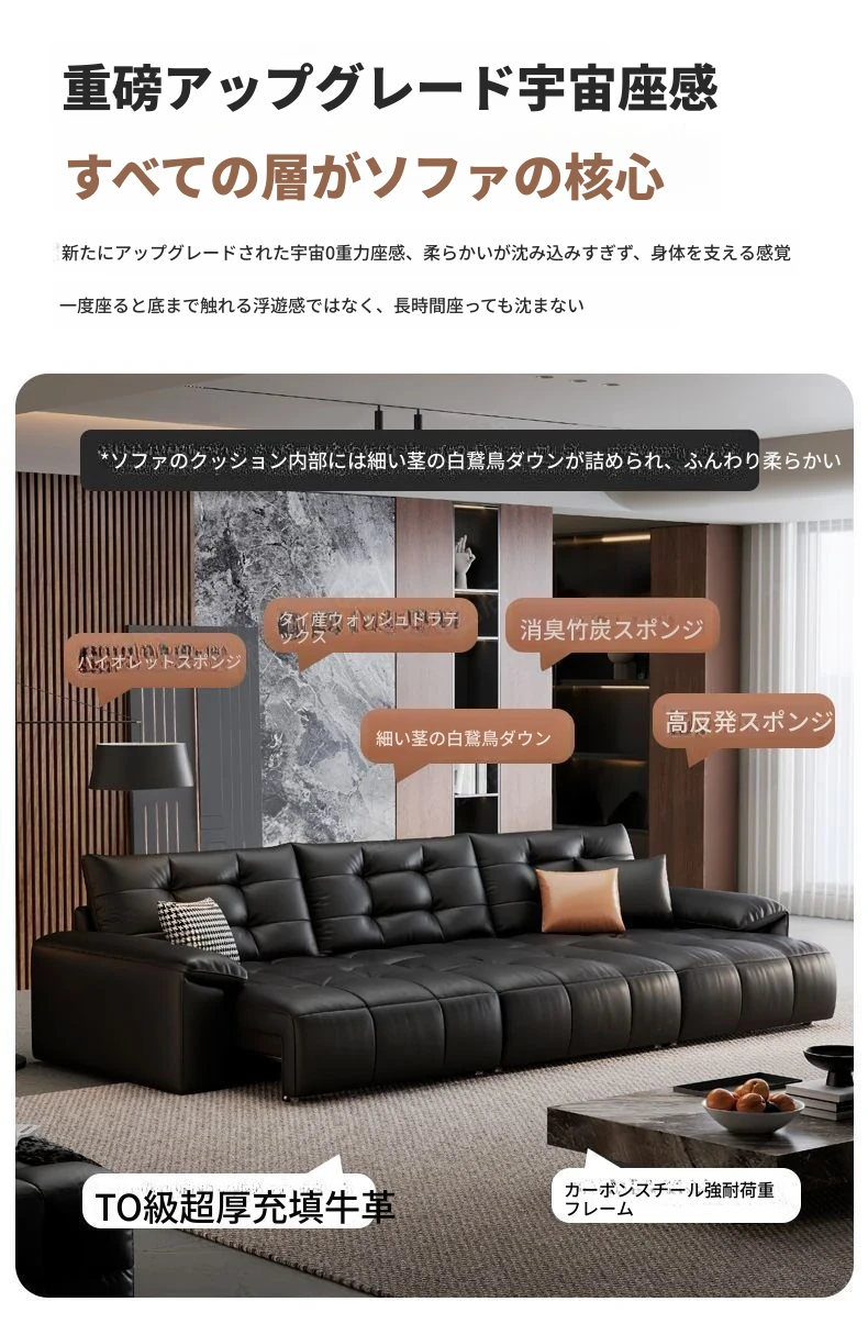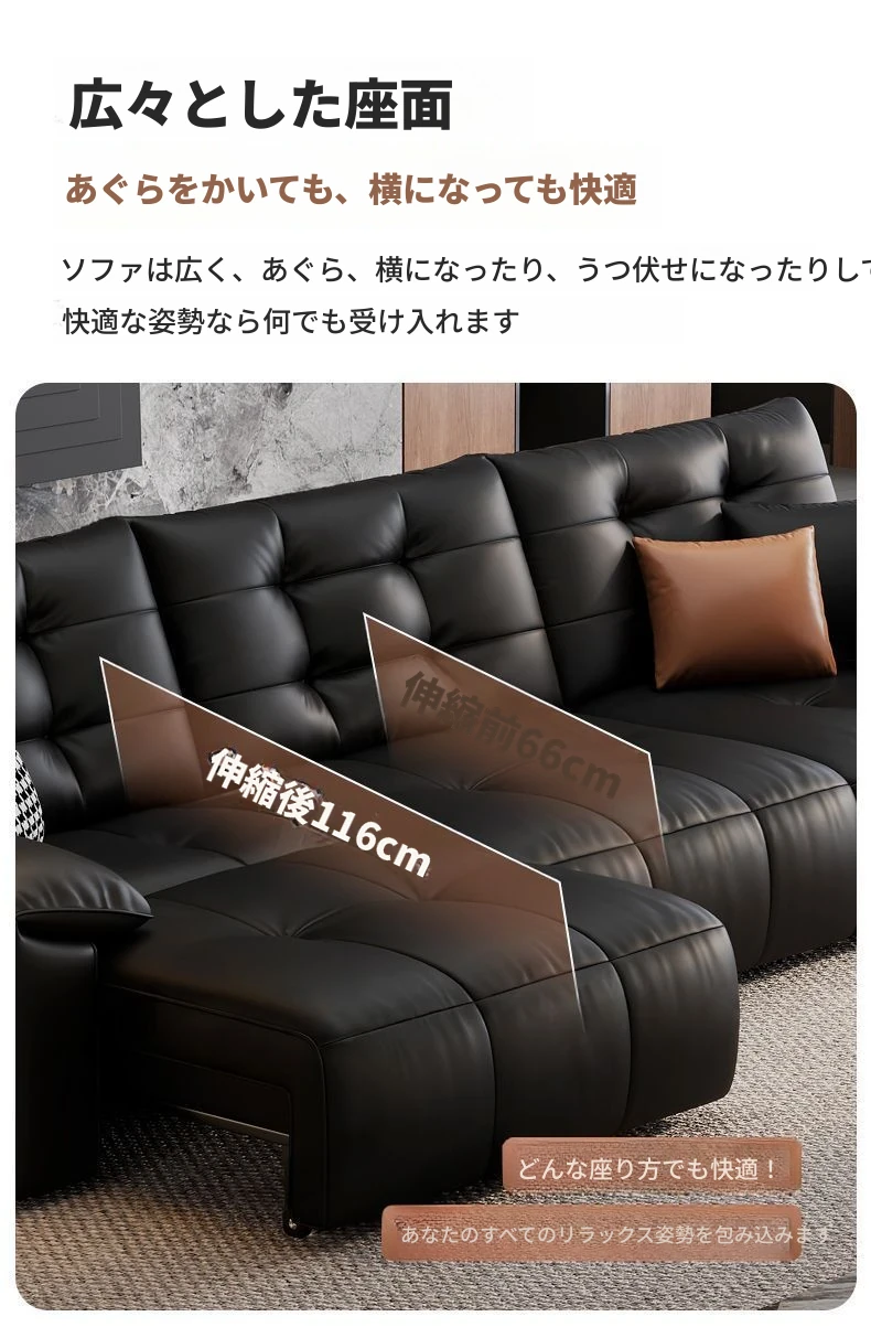 2025年新作!壁に寄せない電動スライド機能付き、ブラック本革ソファ!伸縮可能なトップグレインレザーのベッドコンビネーションで、快適さとスタイルを両立。あなたのリビングに最適な選択!