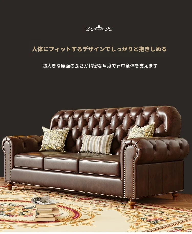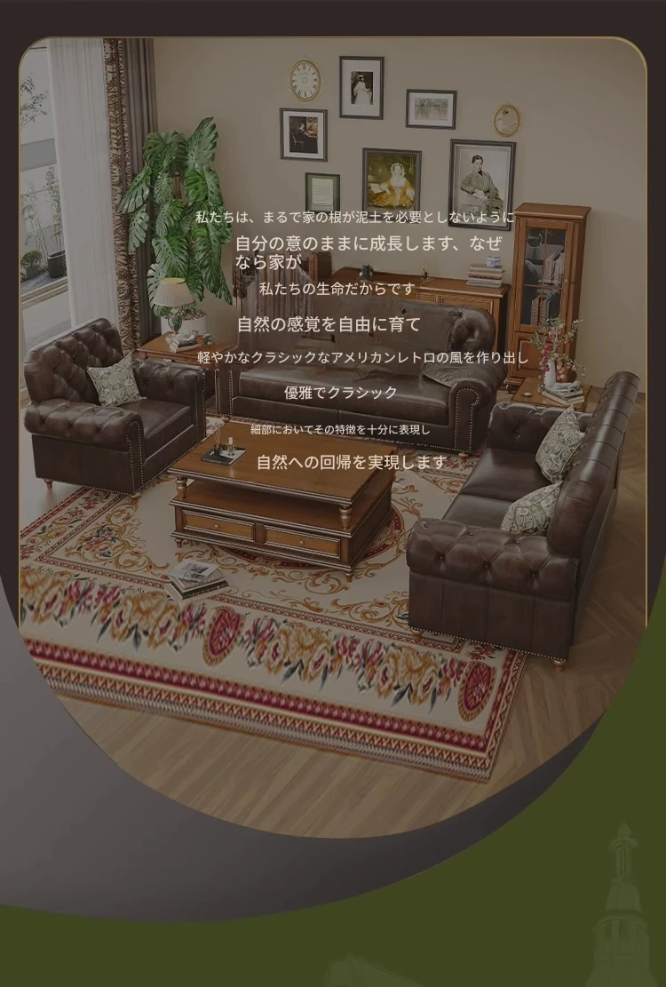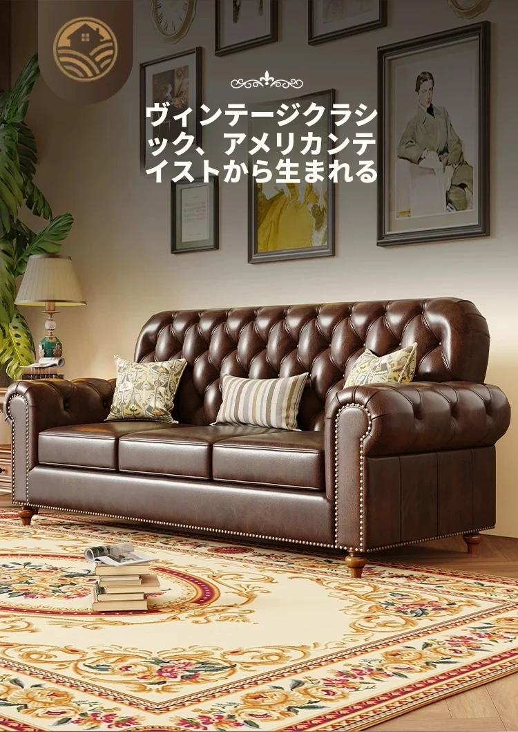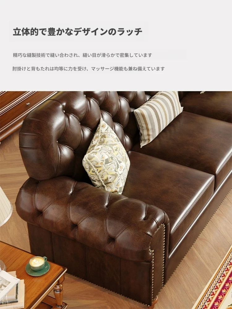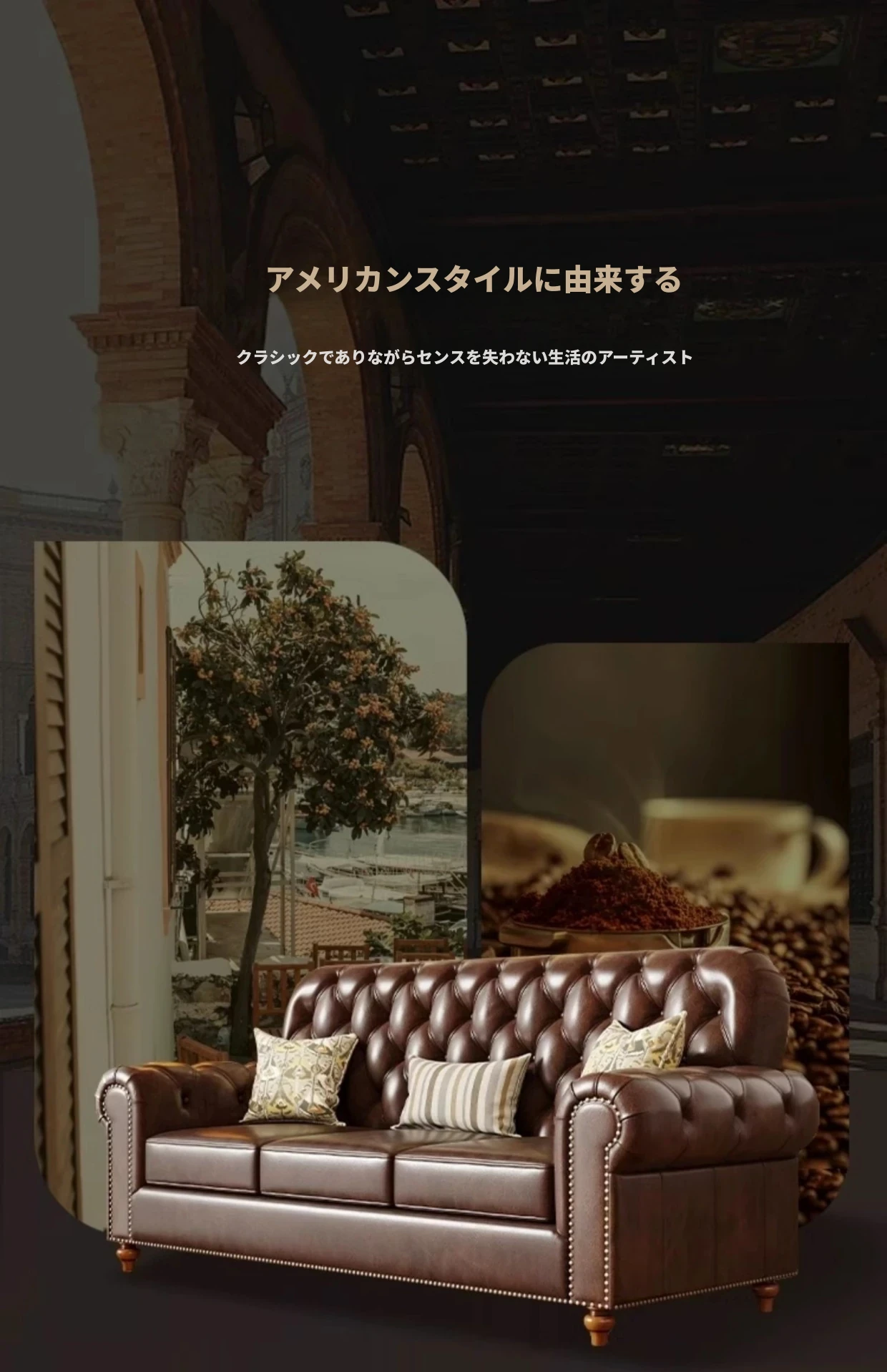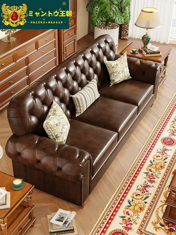 アメリカンヴィンテージスタイルのラグジュアリーソファセット123 - 田舎の別荘にぴったりな本革製、耐久性抜群!大小様々なリビングルームに最適です。