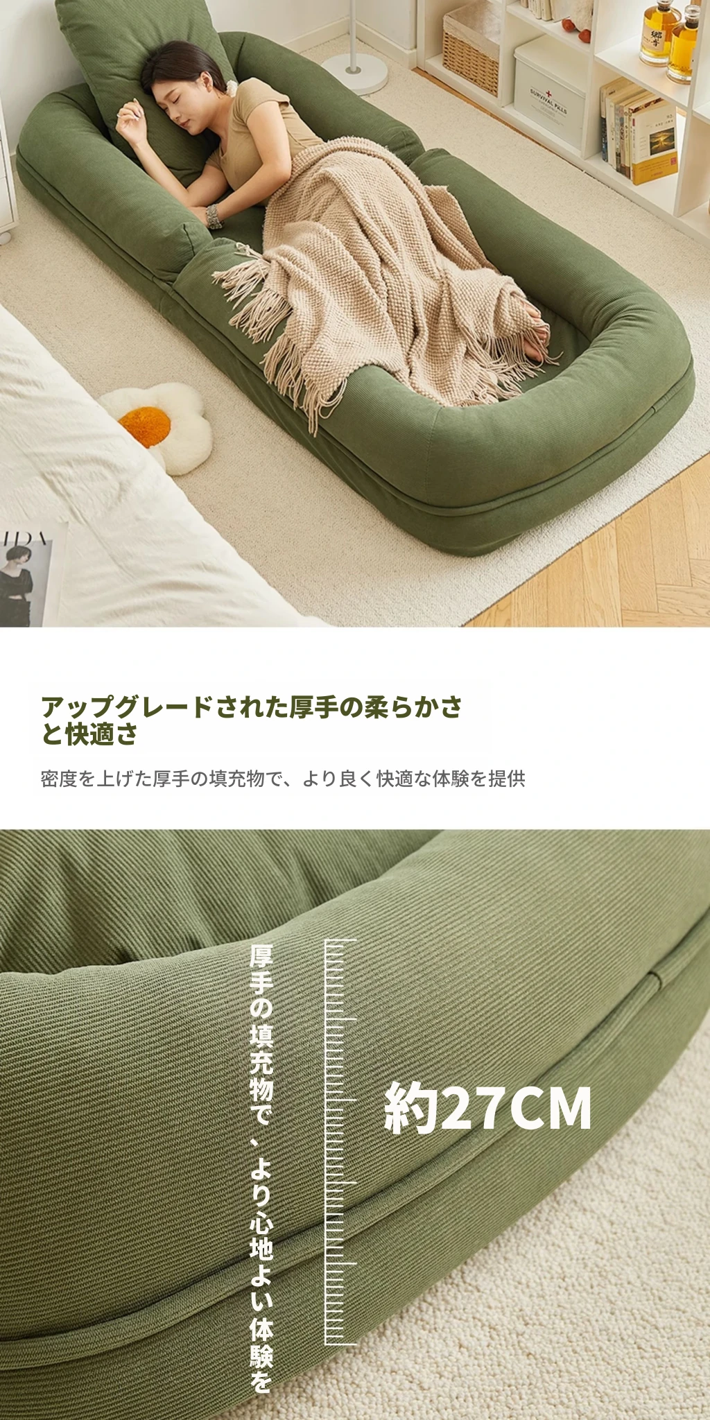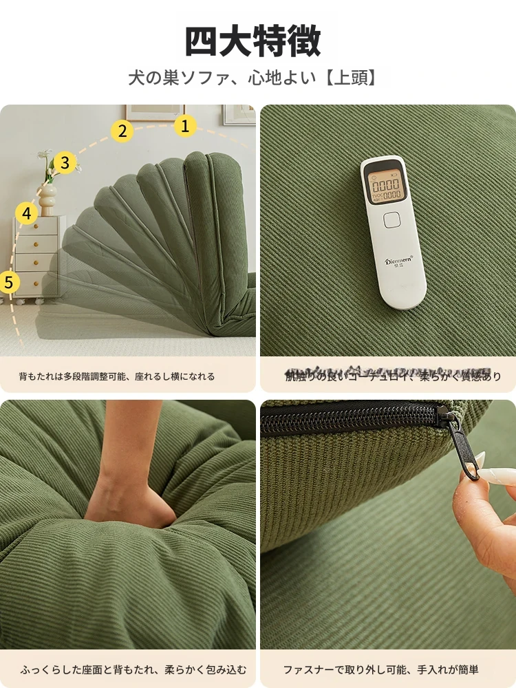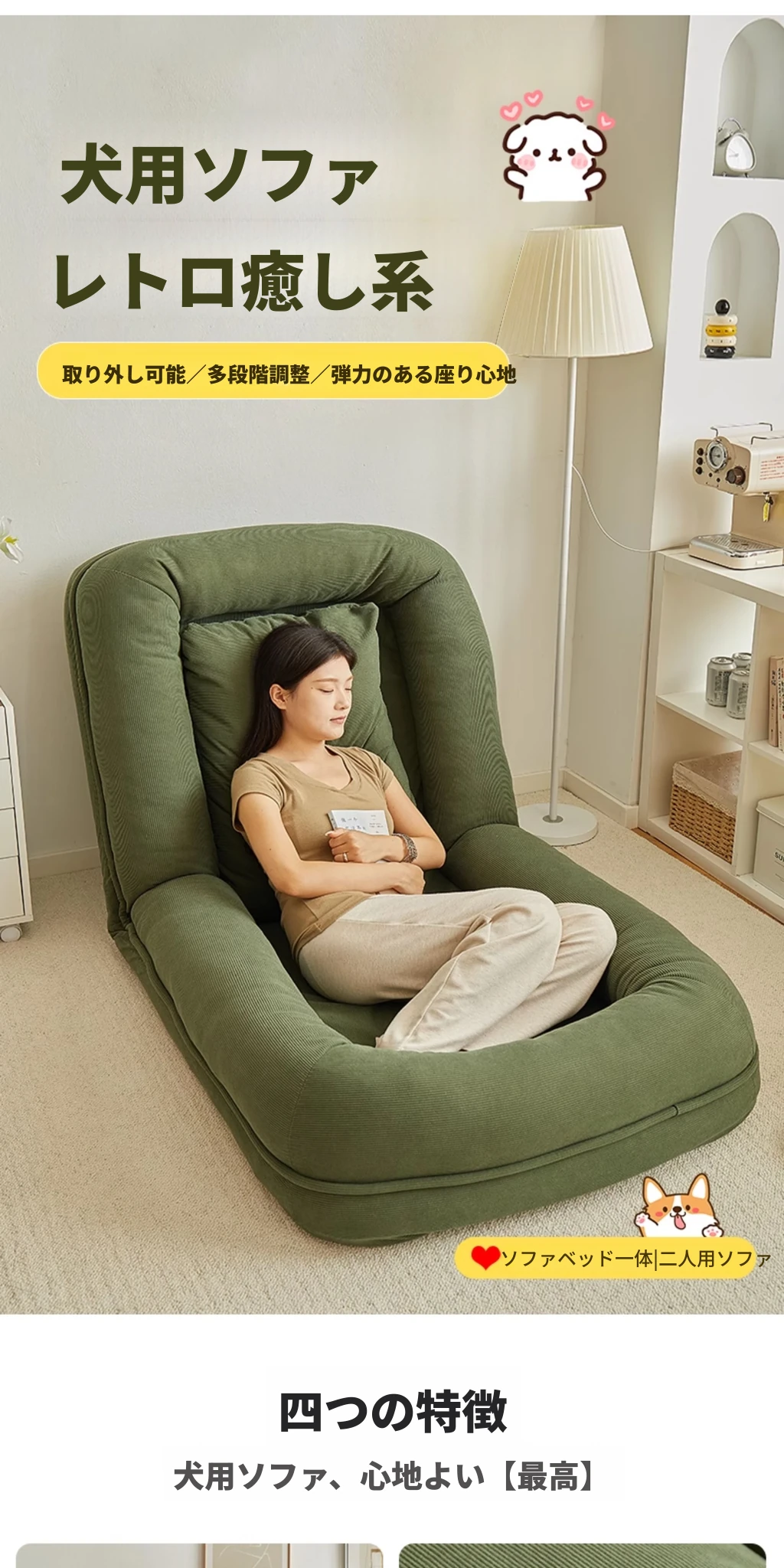 リラックスできるラウンジソファ!寝転んでも眠れる大人用の犬型ハウス、和室スタイルのタタミマット、女性向けシングルサイズ、小さな部屋にぴったりな折りたたみベッド。快適さと便利さを兼ね備えた一品です!