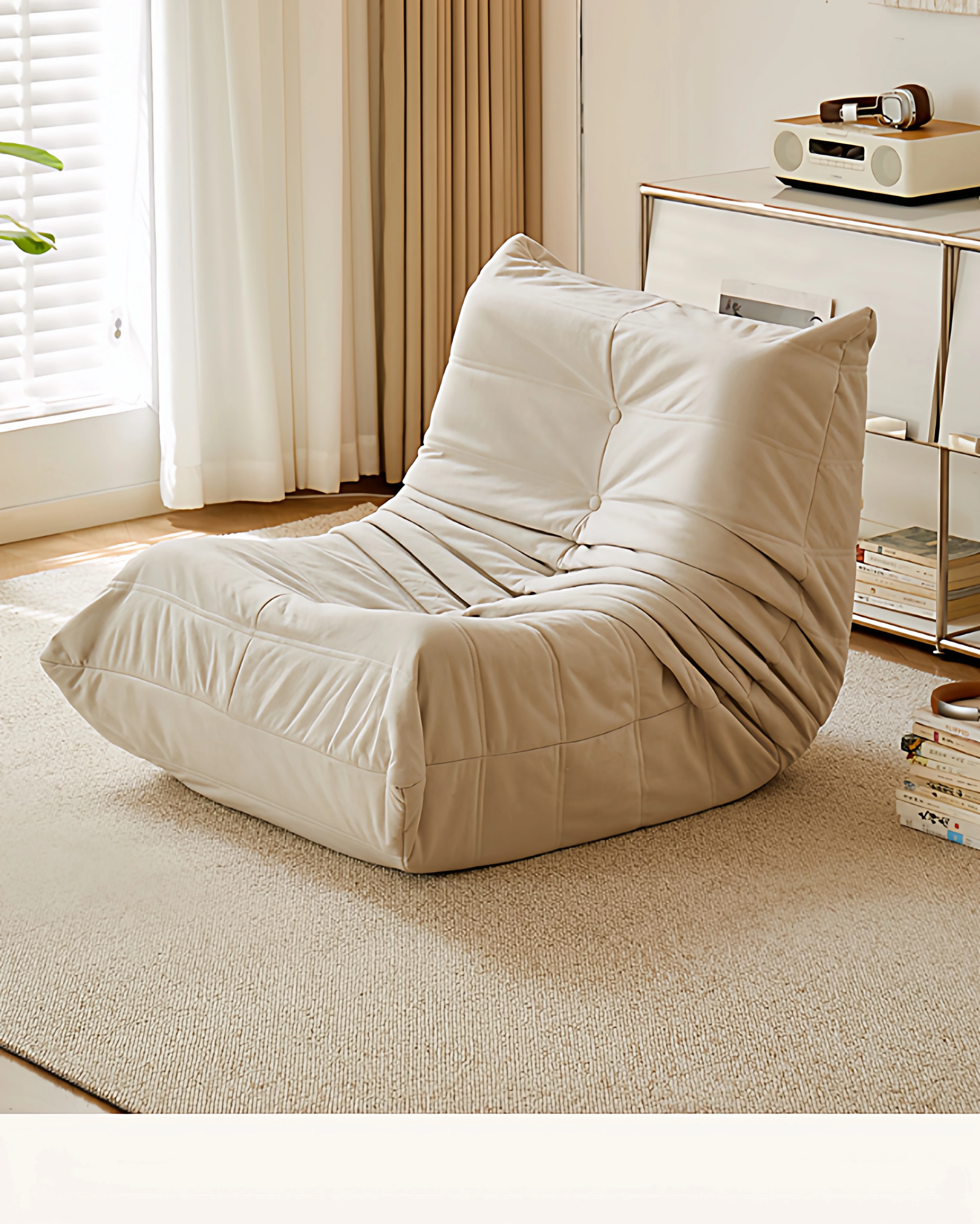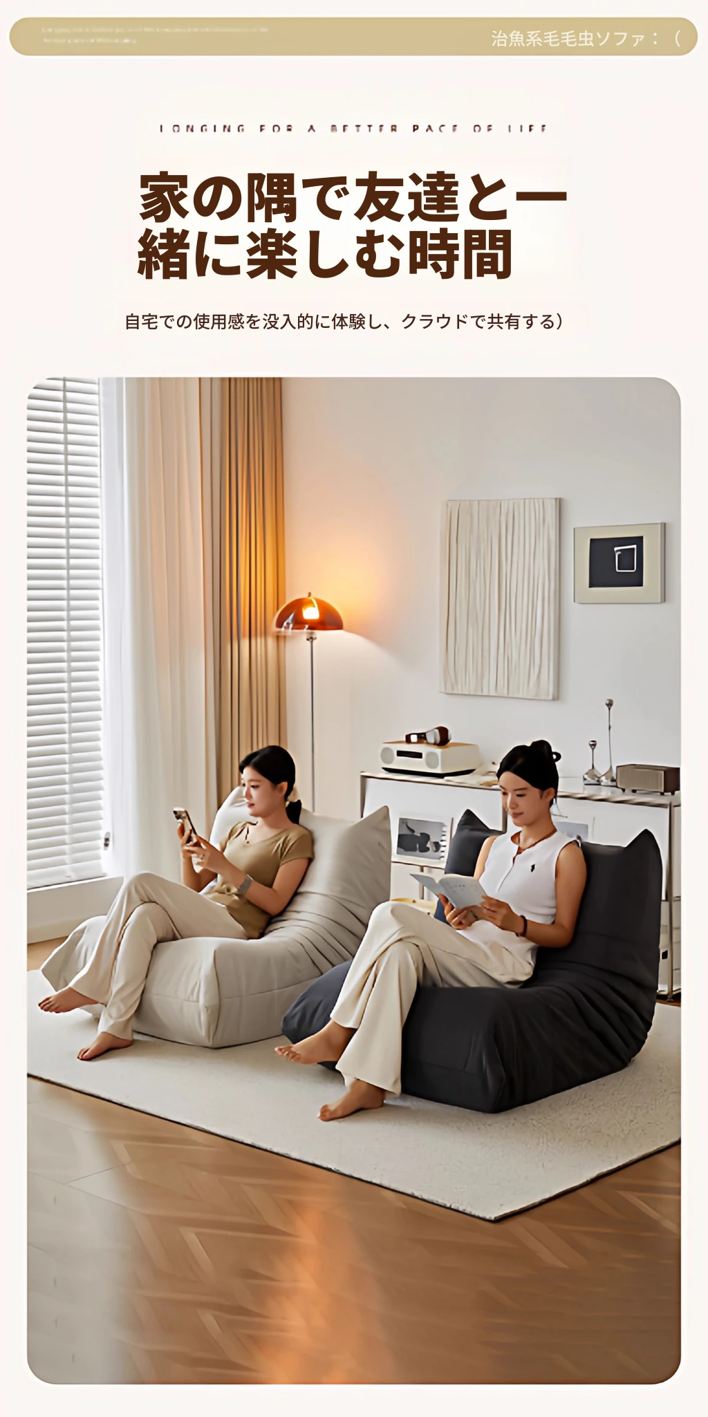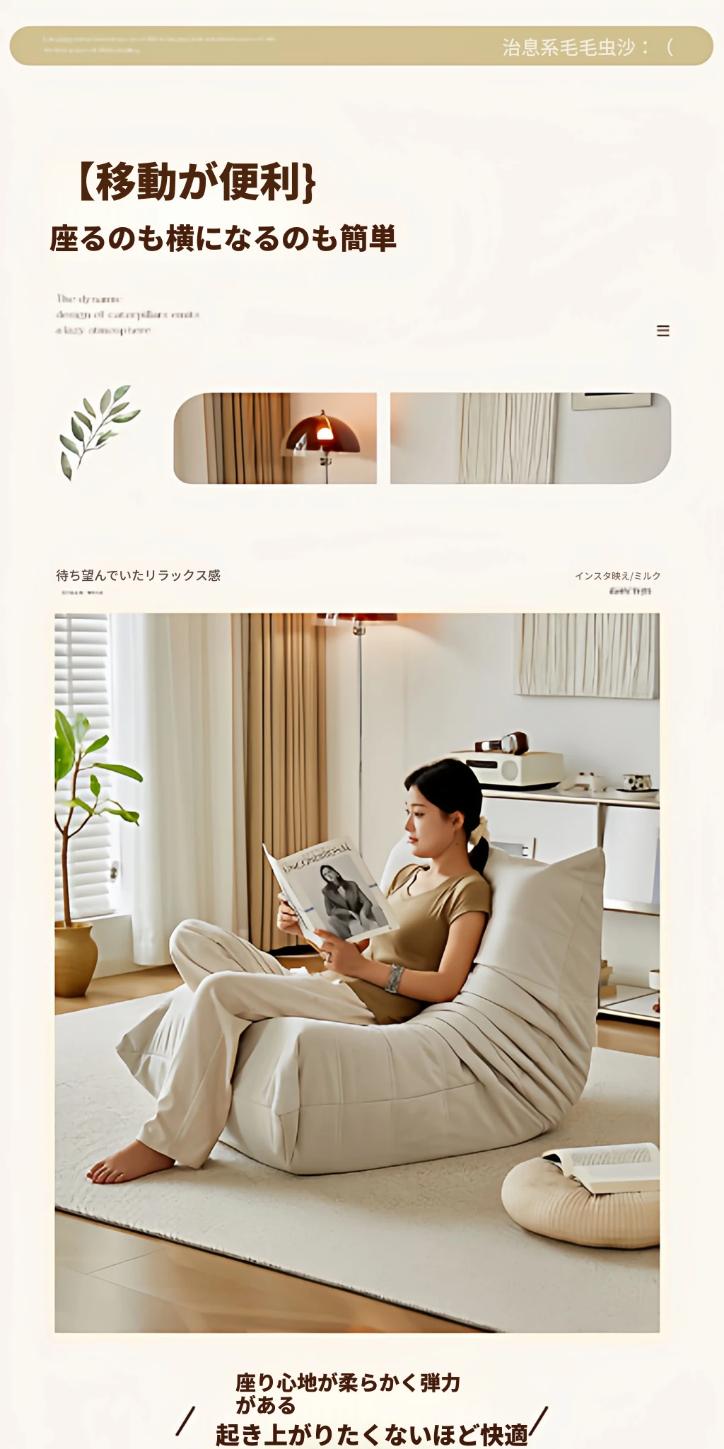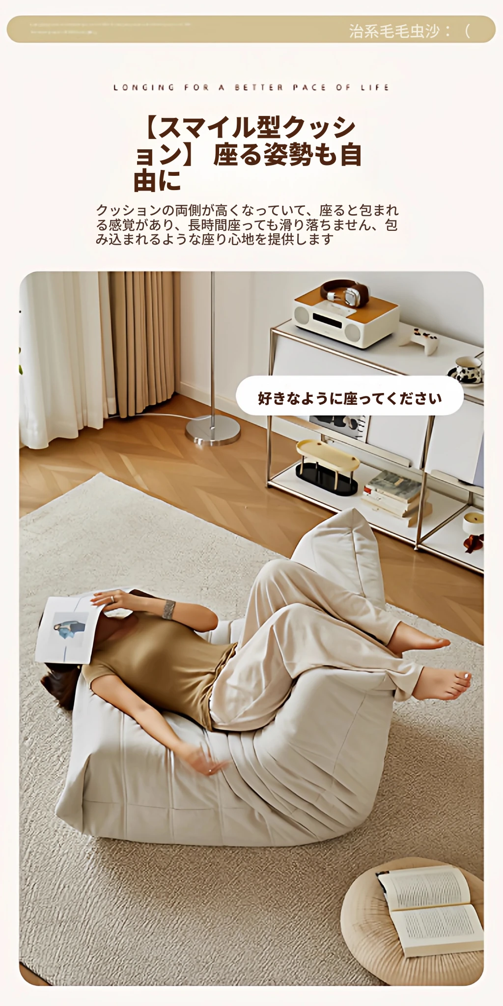 ふわふわミミズのリラックスソファ - 寝転んでリラックスできる、一人用のベッドルーム向け小型ソファ。畳スタイルの座椅子で、バルコニーやリビングでのくつろぎのひとときに最適!