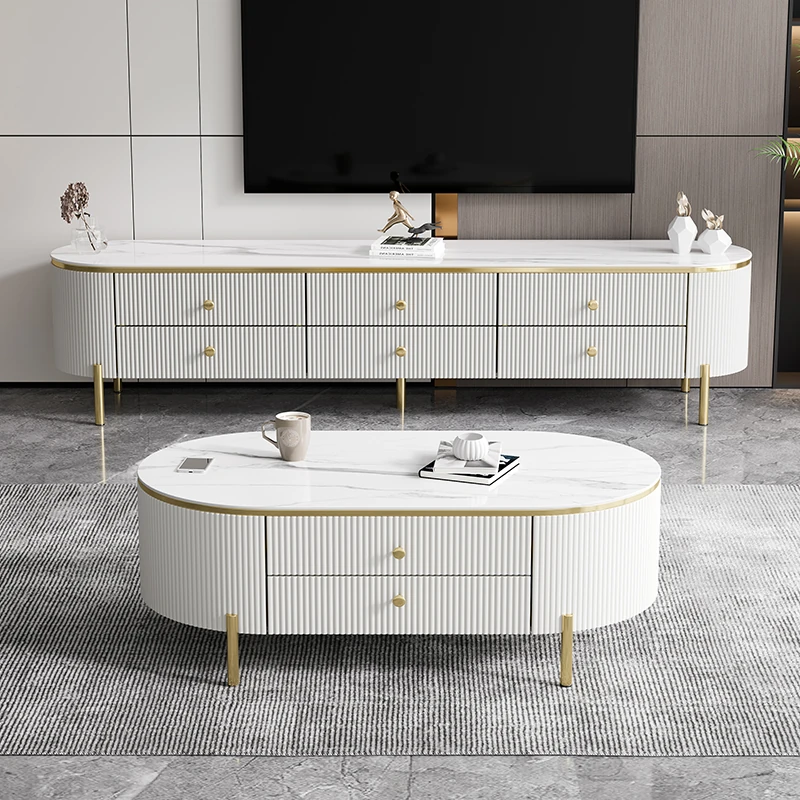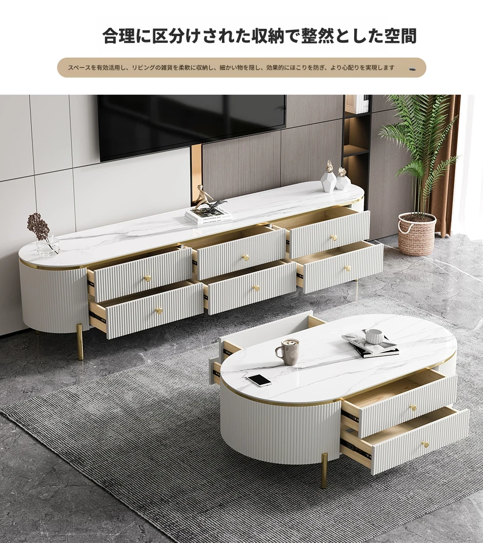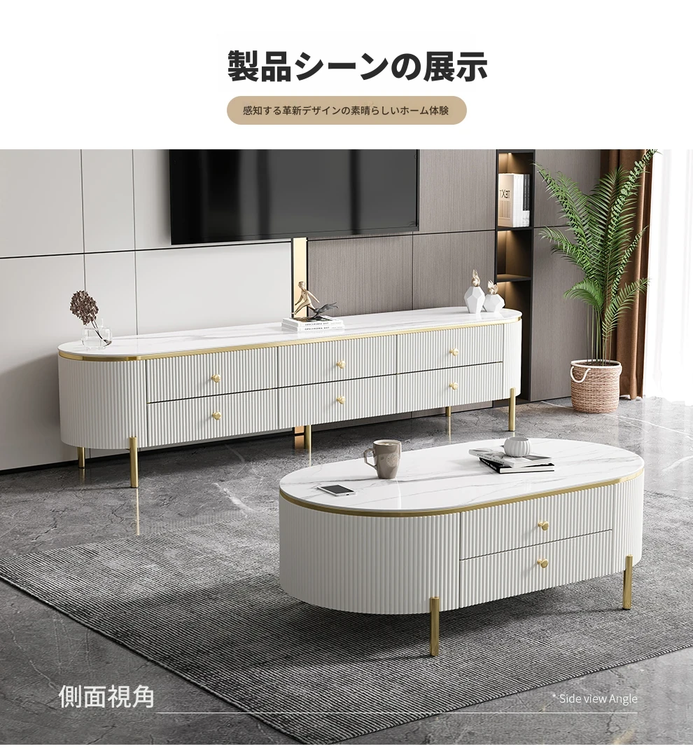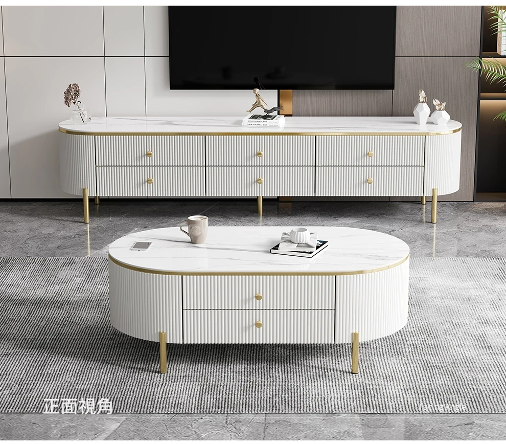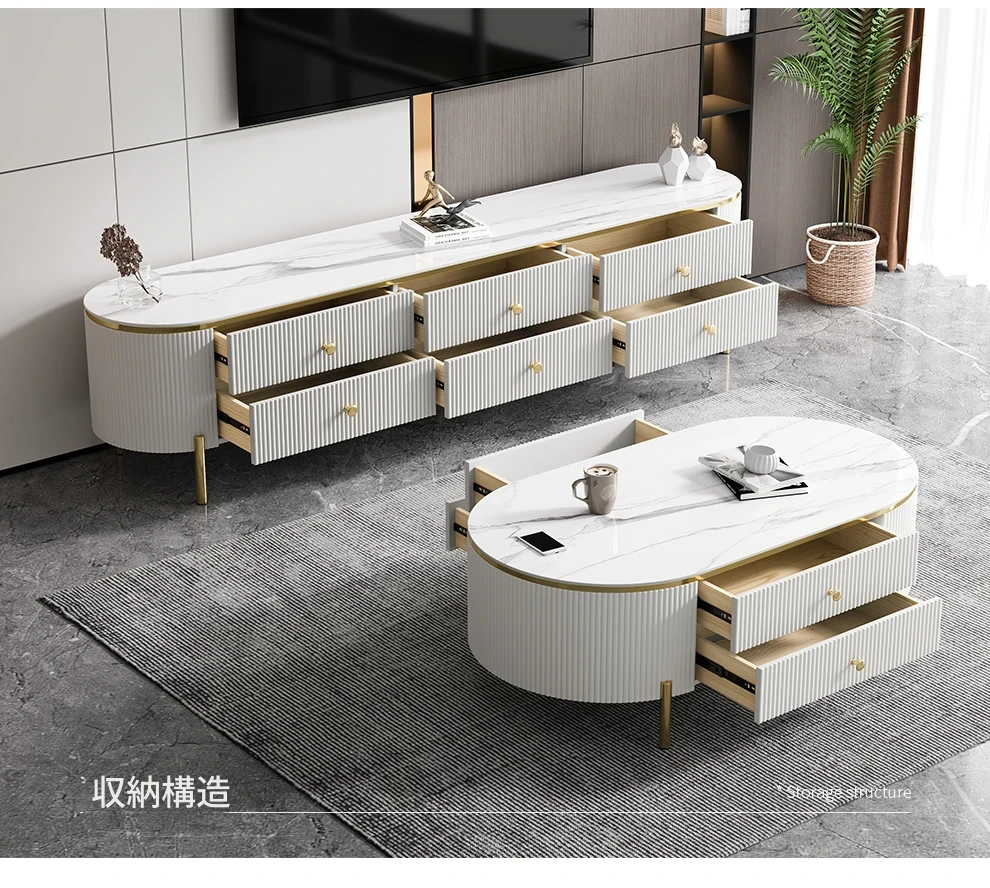 軽やかで贅沢なミニマリストデザインのクリーム色リビングルーム用小型コーヒーテーブル&テレビキャビネットセット。シンプルで現代的な新作、大理石風の美しいテーブルでお部屋をスタイリッシュに演出!