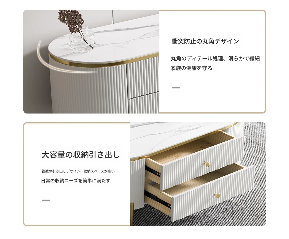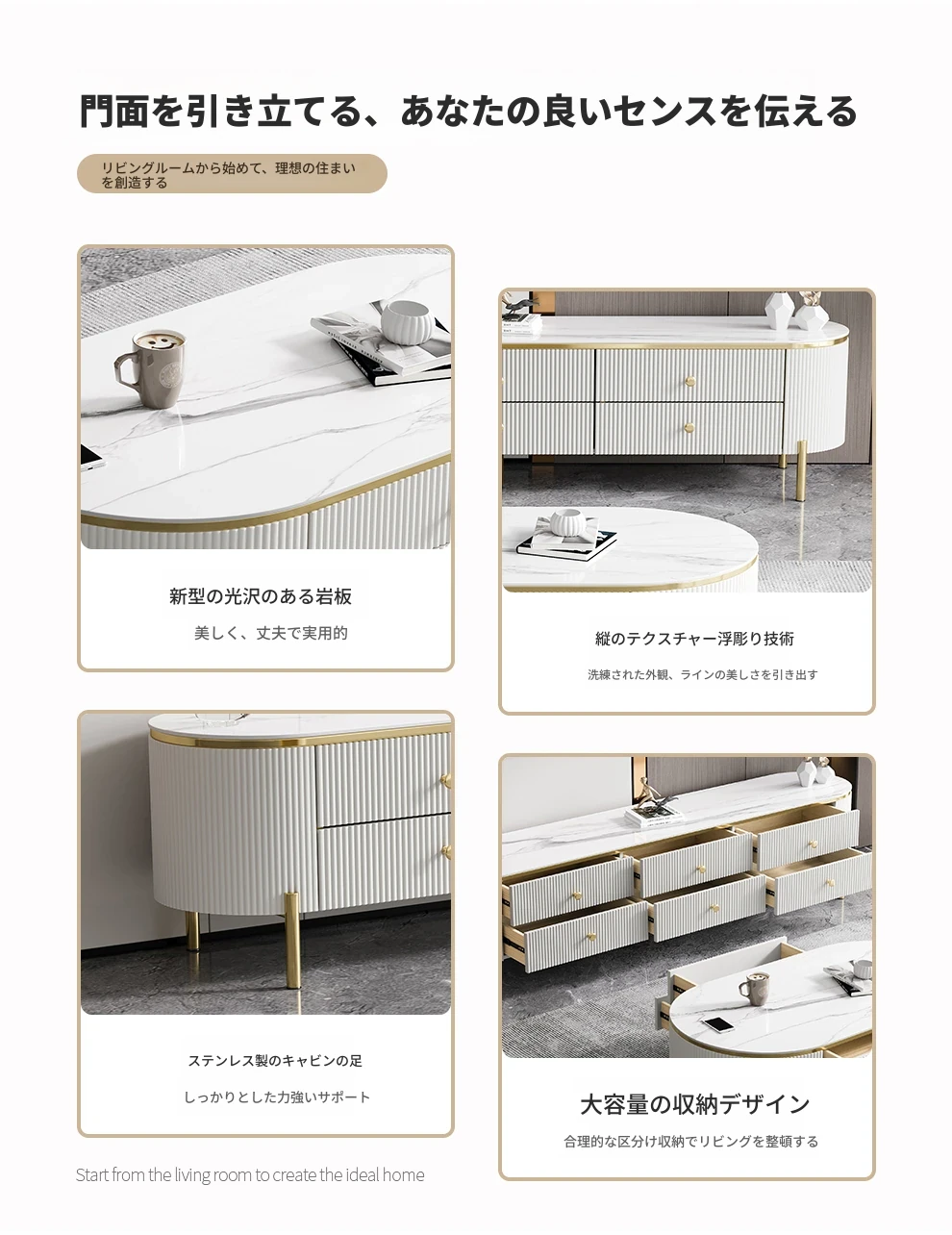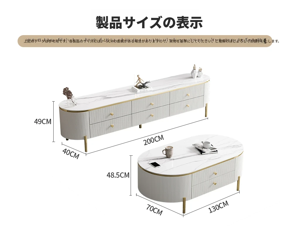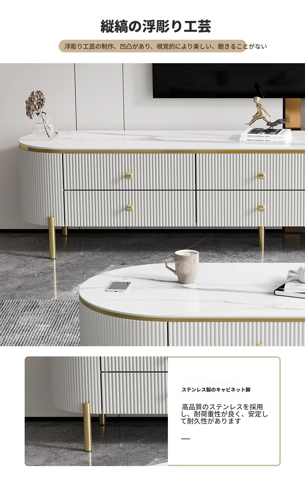 軽やかで贅沢なミニマリストデザインのクリーム色リビングルーム用小型コーヒーテーブル&テレビキャビネットセット。シンプルで現代的な新作、大理石風の美しいテーブルでお部屋をスタイリッシュに演出!
