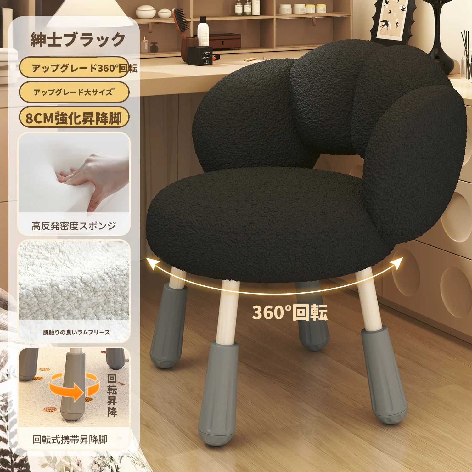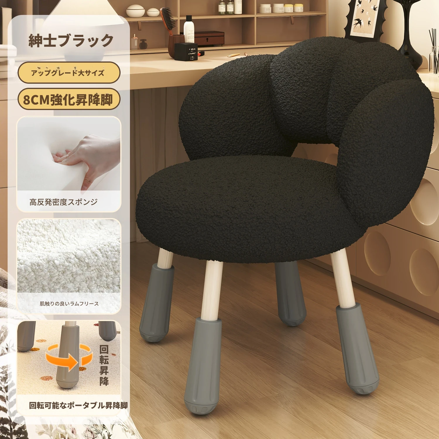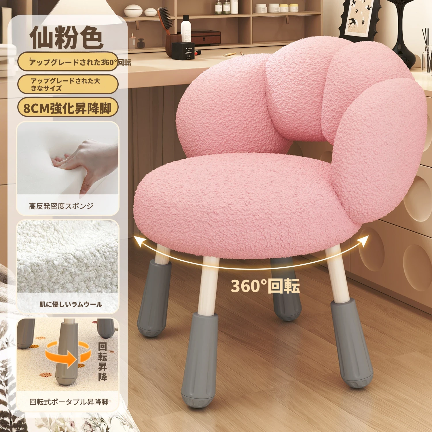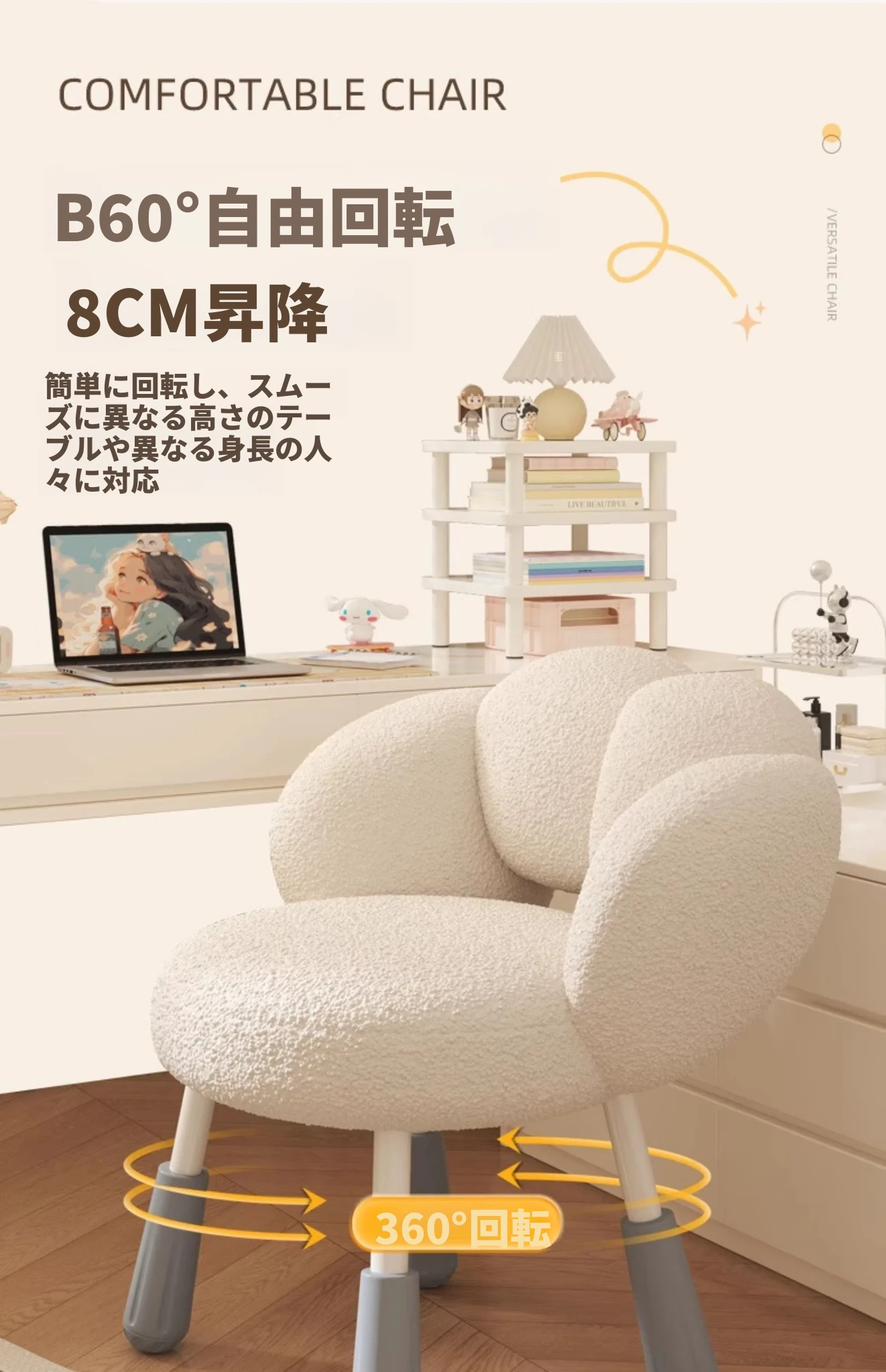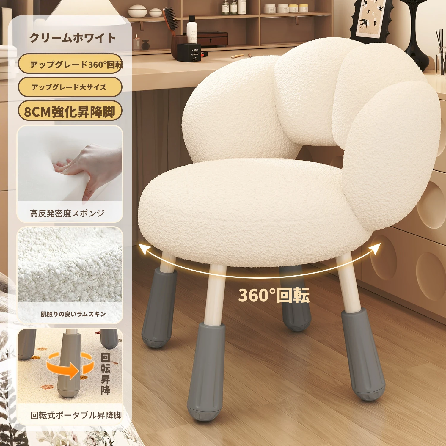 イーリスのコスメティックスツール、クリーム風デザインの回転椅子。ラムフリース素材で、小さな部屋にぴったりの可愛いデザイン。女の子のための書斎やコンピューターチェアとしても最適です!