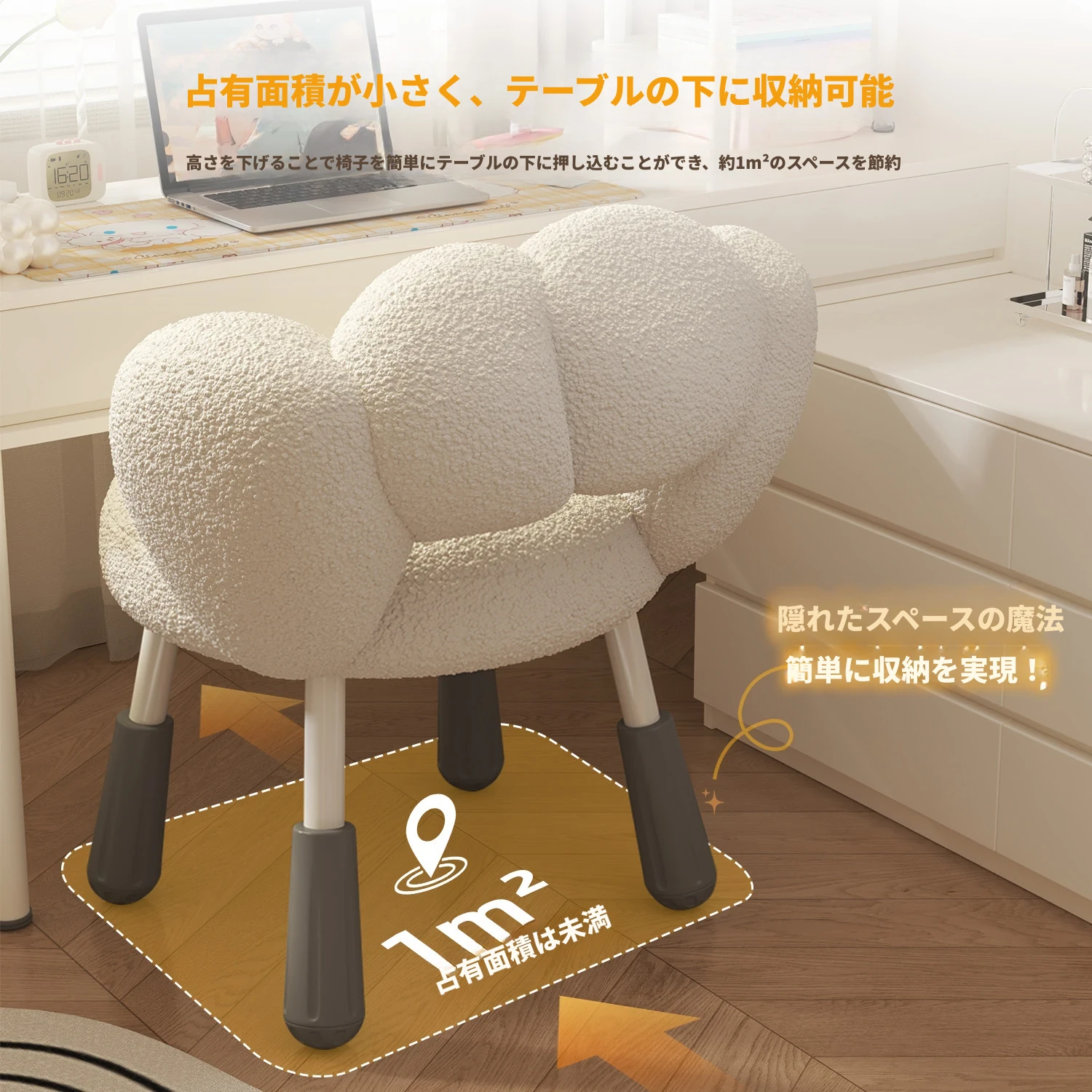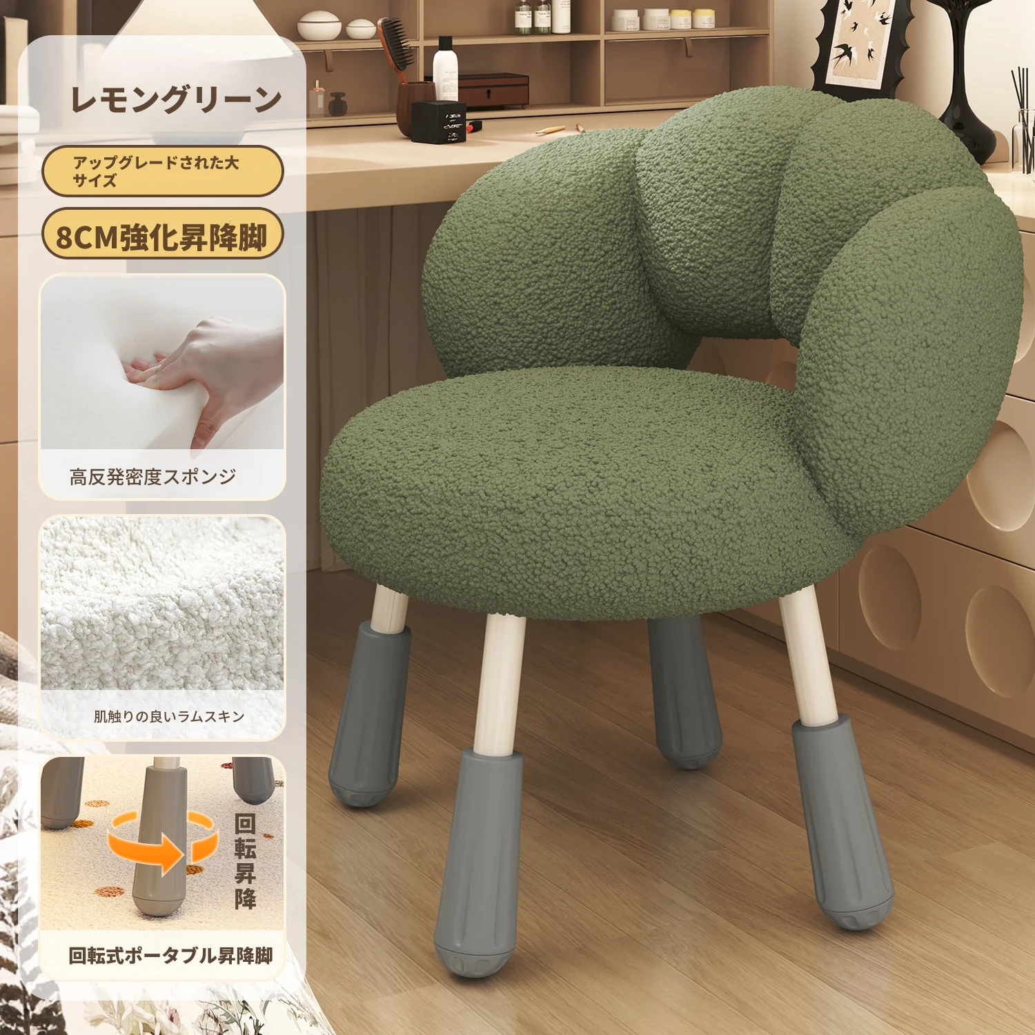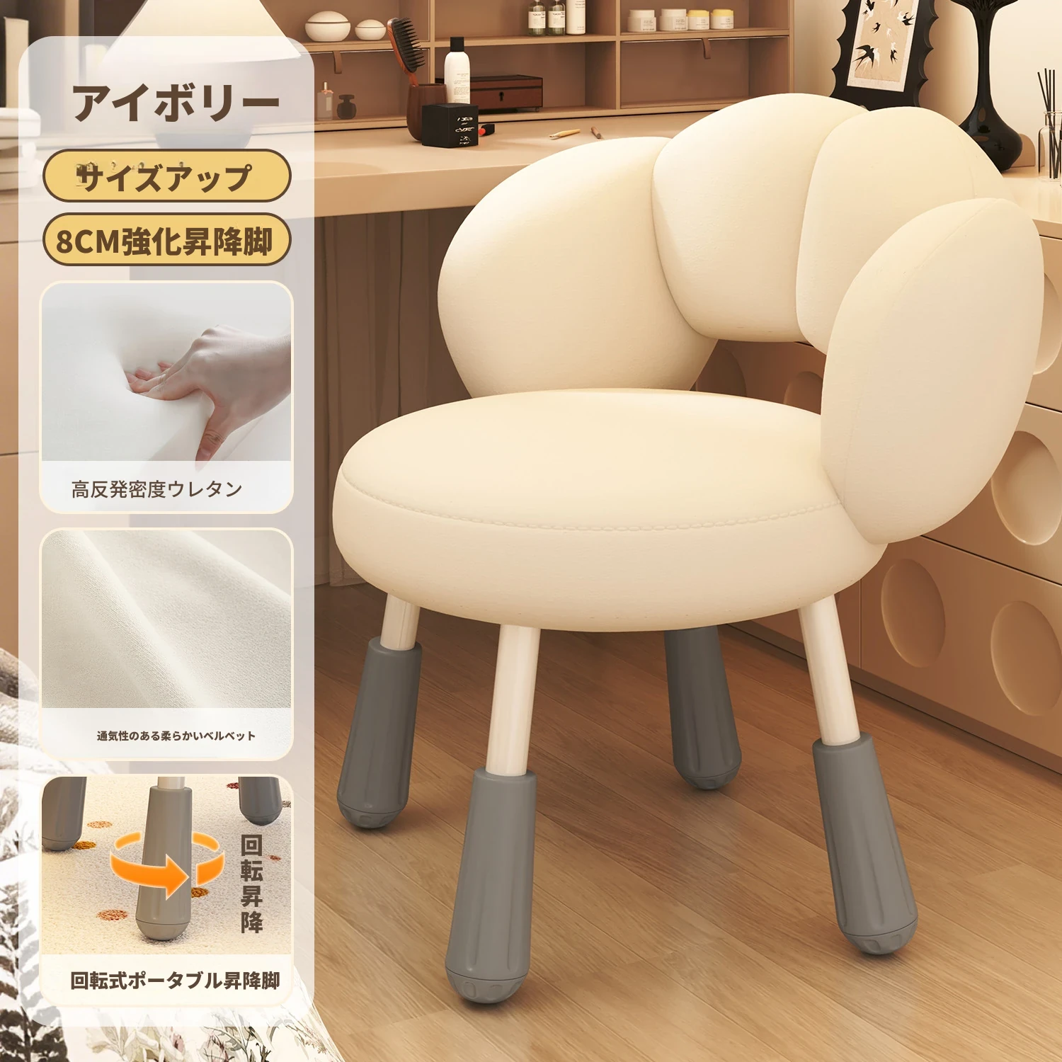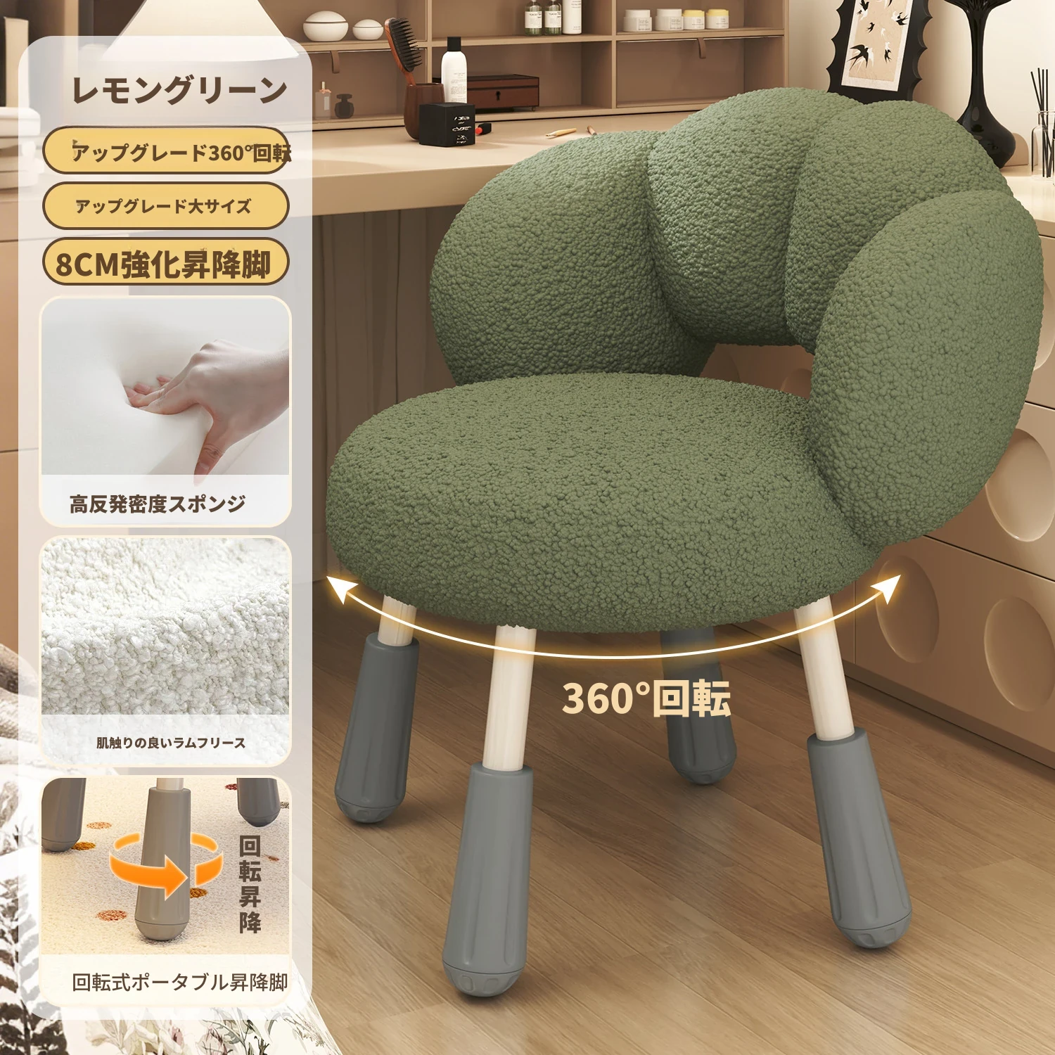 イーリスのコスメティックスツール、クリーム風デザインの回転椅子。ラムフリース素材で、小さな部屋にぴったりの可愛いデザイン。女の子のための書斎やコンピューターチェアとしても最適です!