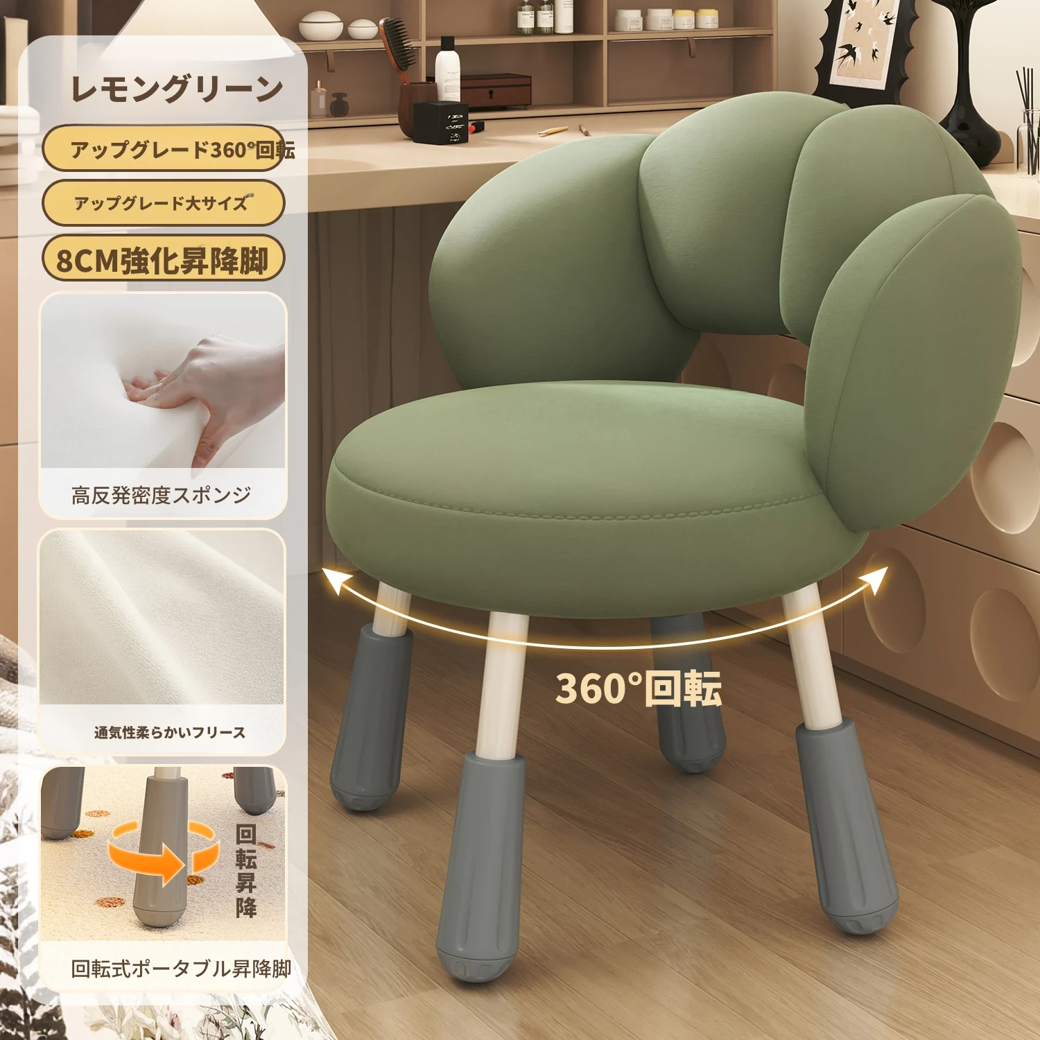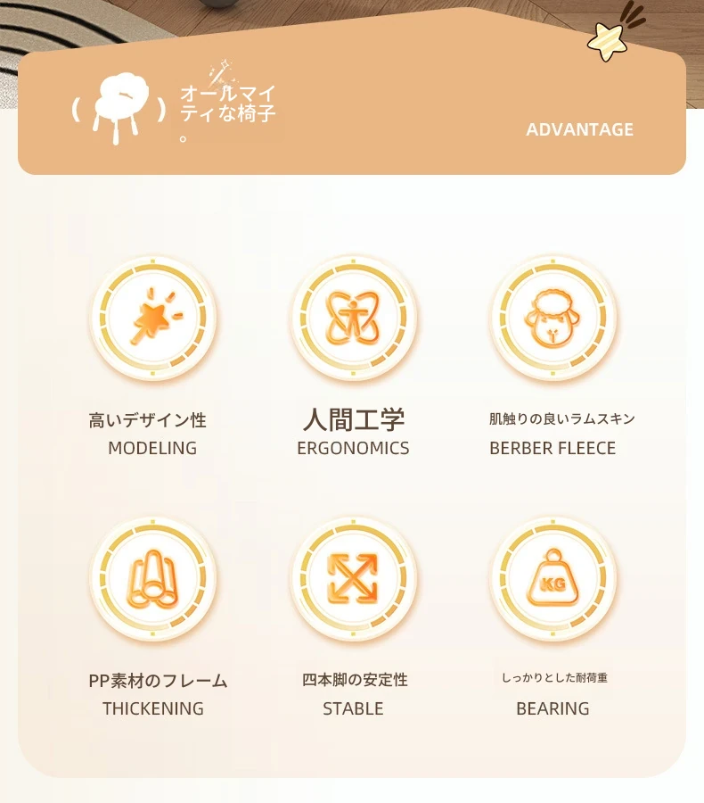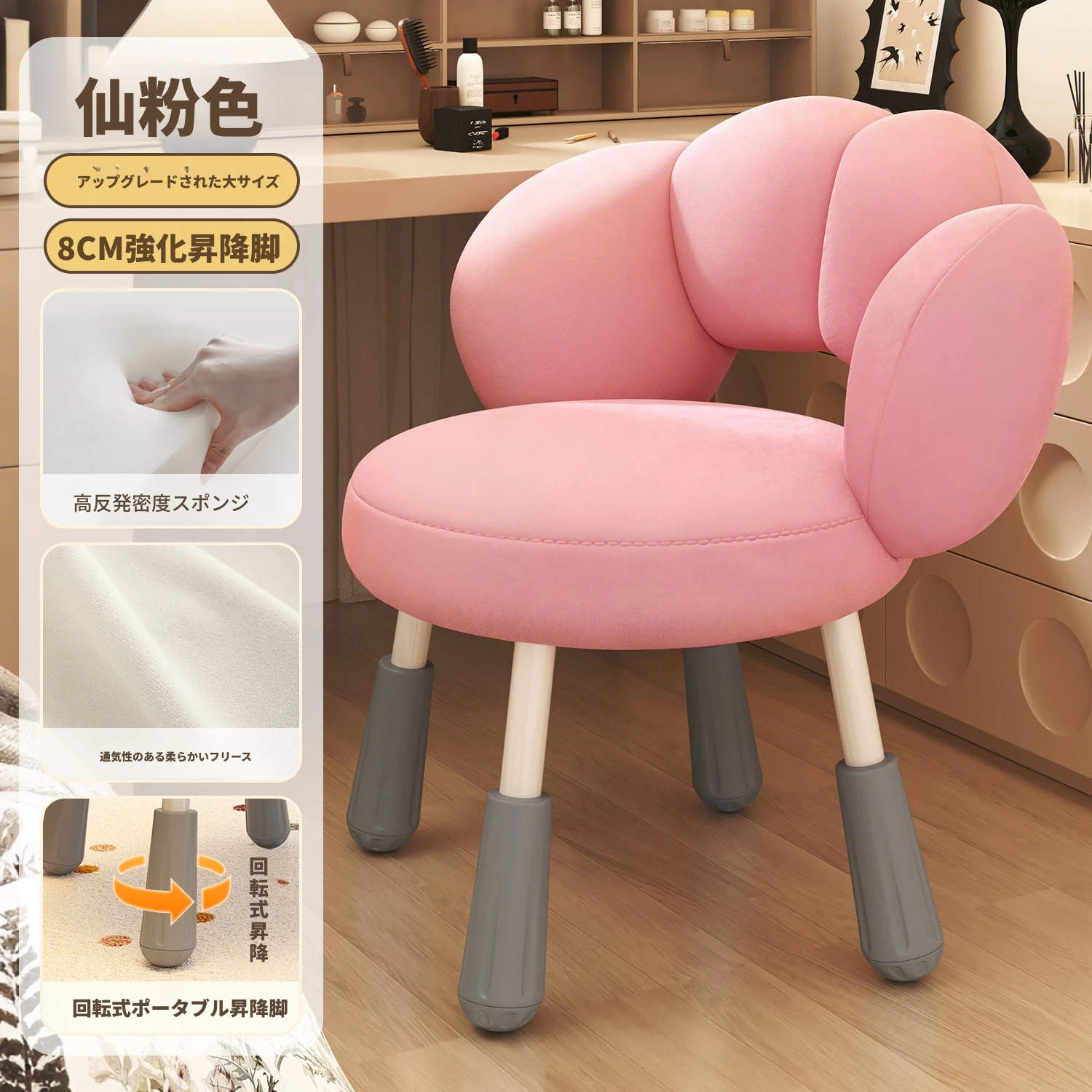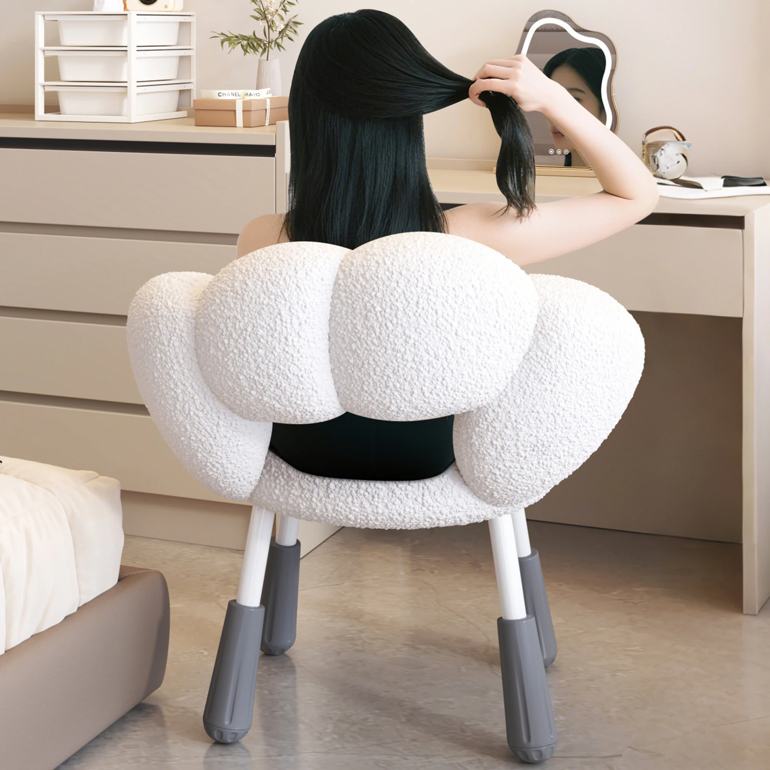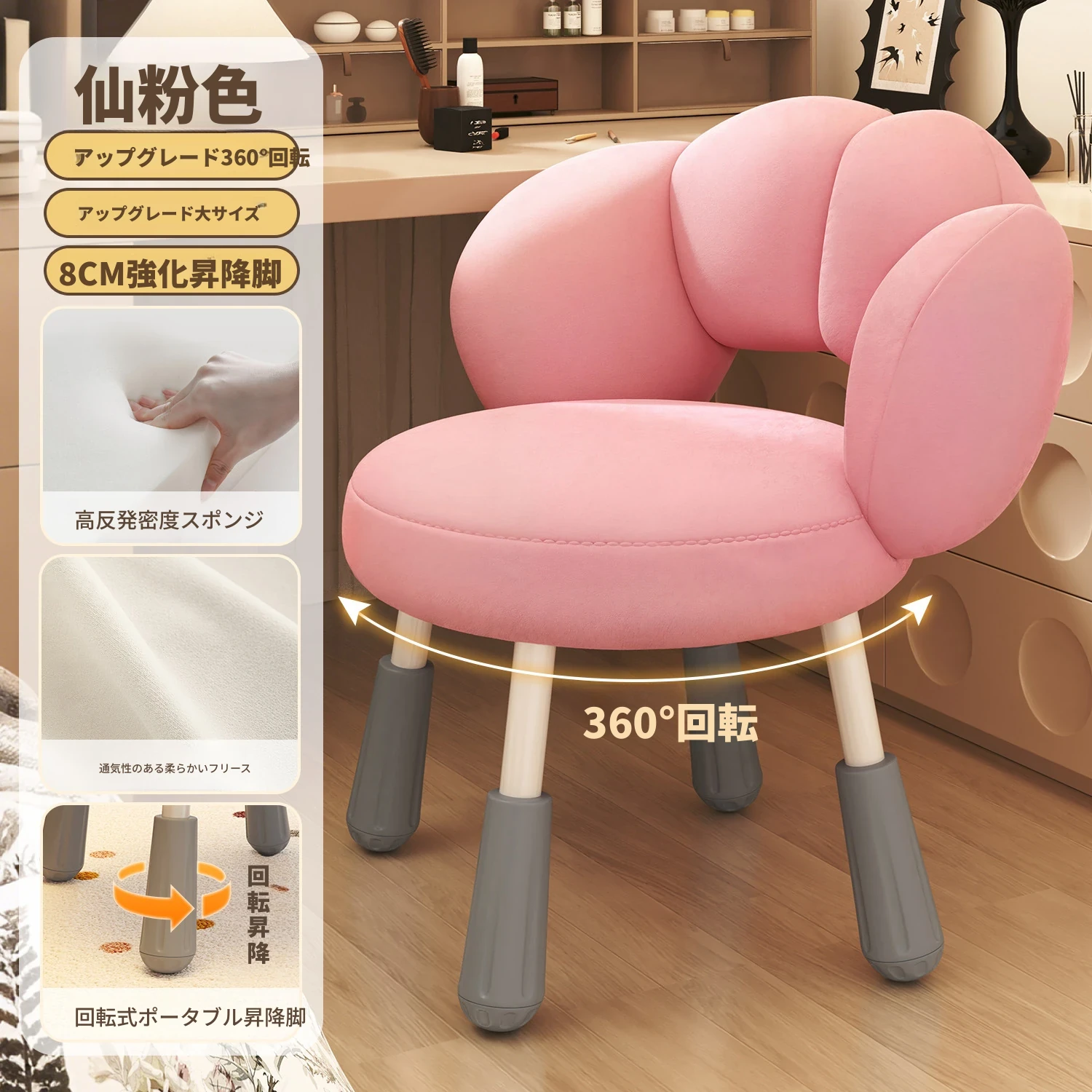 イーリスのコスメティックスツール、クリーム風デザインの回転椅子。ラムフリース素材で、小さな部屋にぴったりの可愛いデザイン。女の子のための書斎やコンピューターチェアとしても最適です!