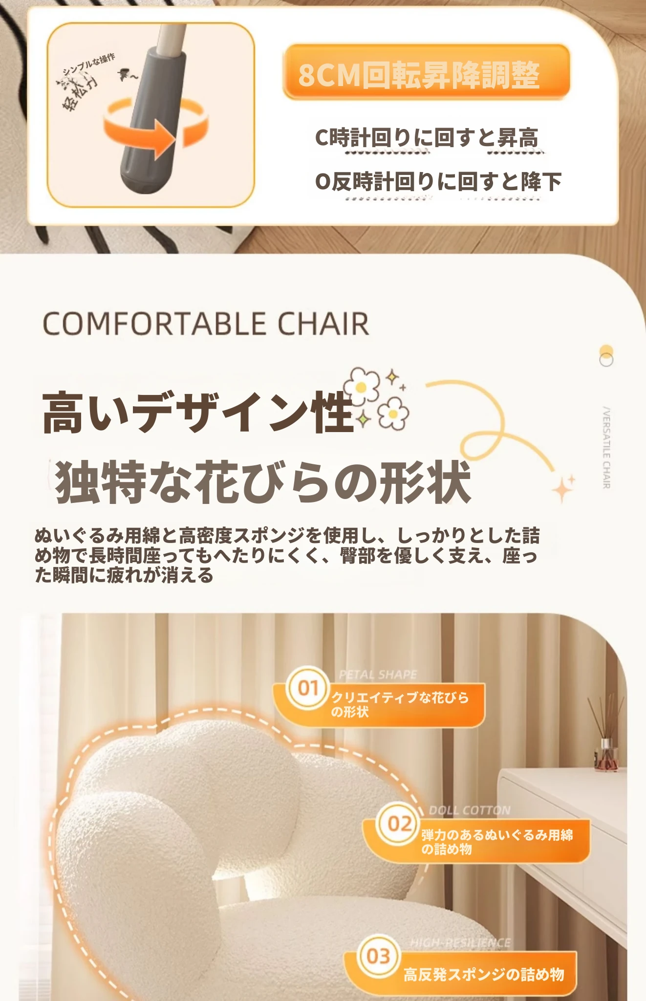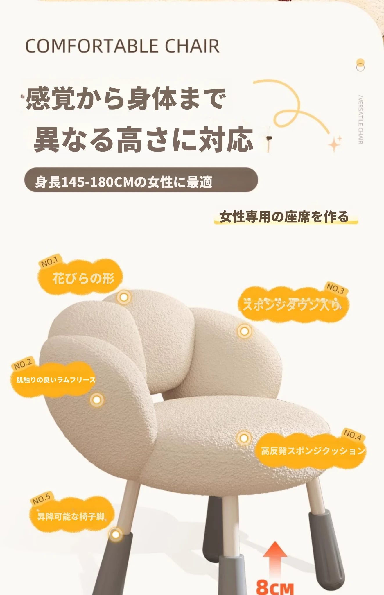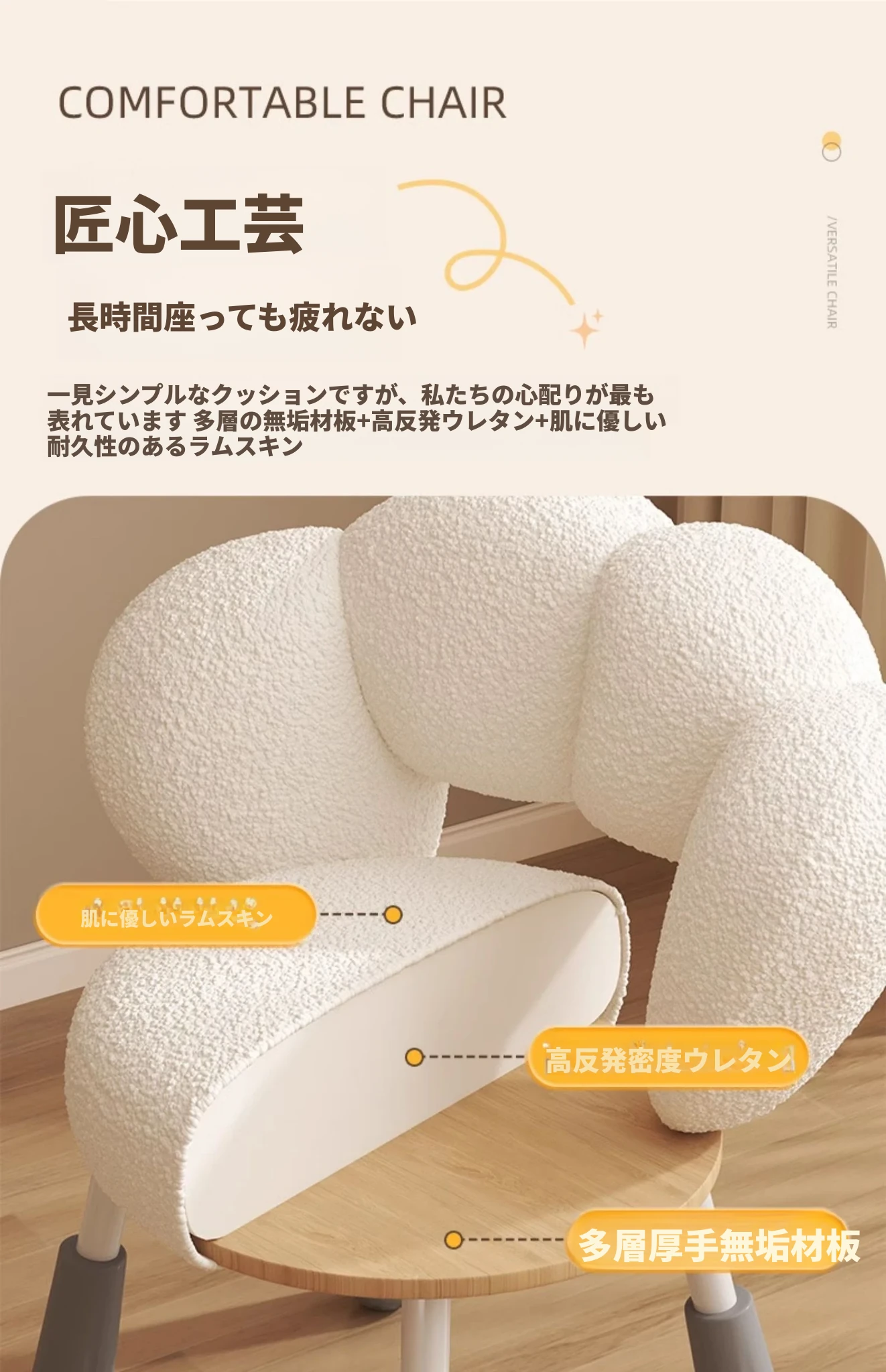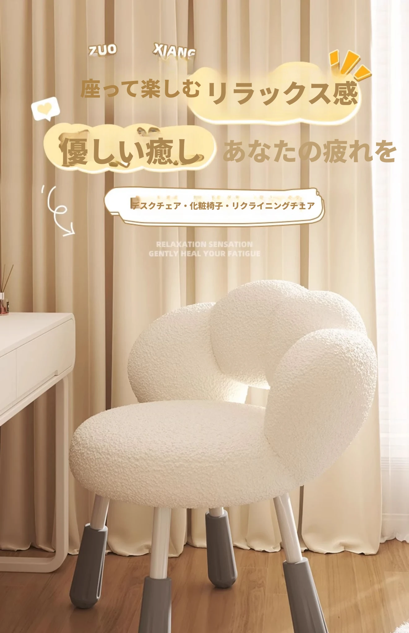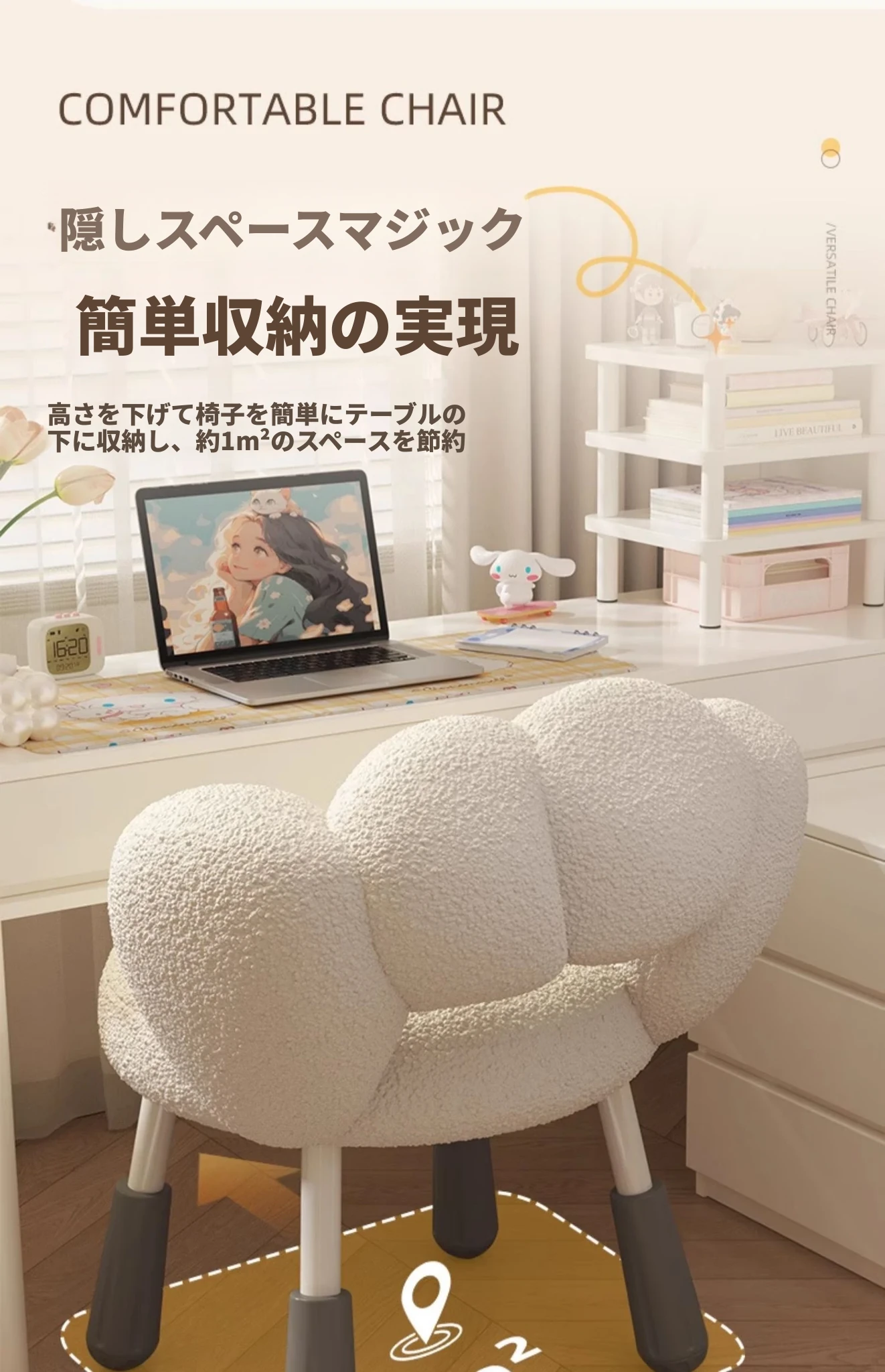 イーリスのコスメティックスツール、クリーム風デザインの回転椅子。ラムフリース素材で、小さな部屋にぴったりの可愛いデザイン。女の子のための書斎やコンピューターチェアとしても最適です!
