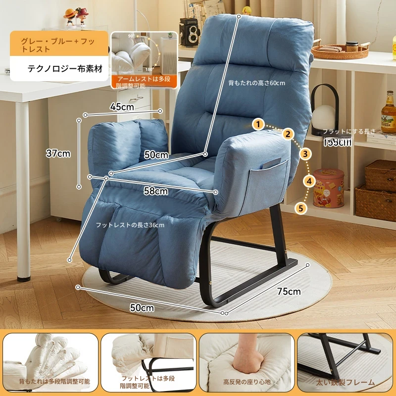 ブルー【背もたれ調整可能+フットレスト調整可能+アームレスト5段階調整】