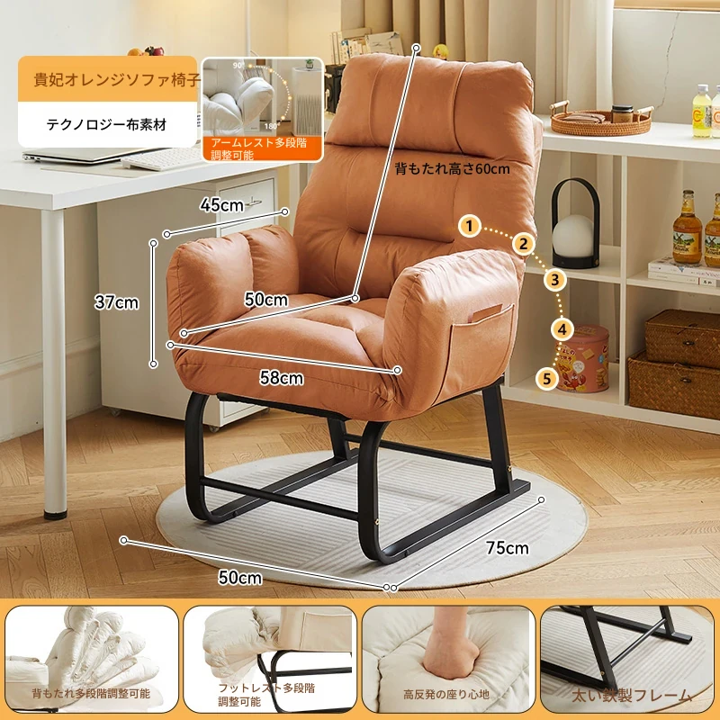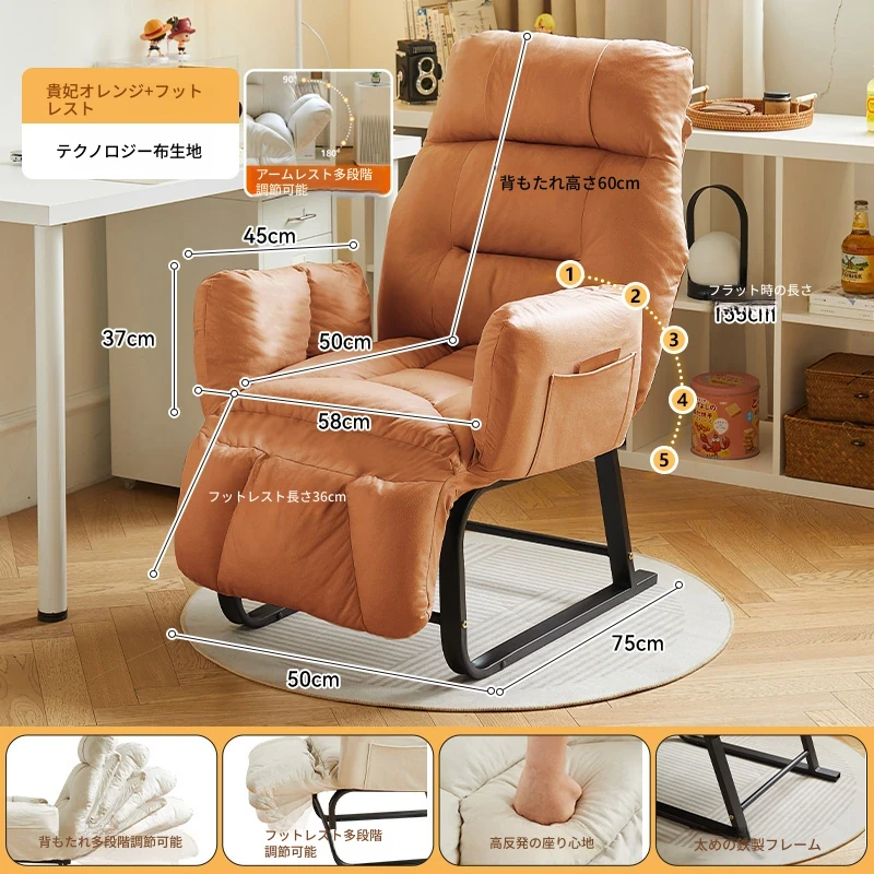 オレンジ【背もたれ調整可能+フットレスト調整可能+アームレスト5段階調整】