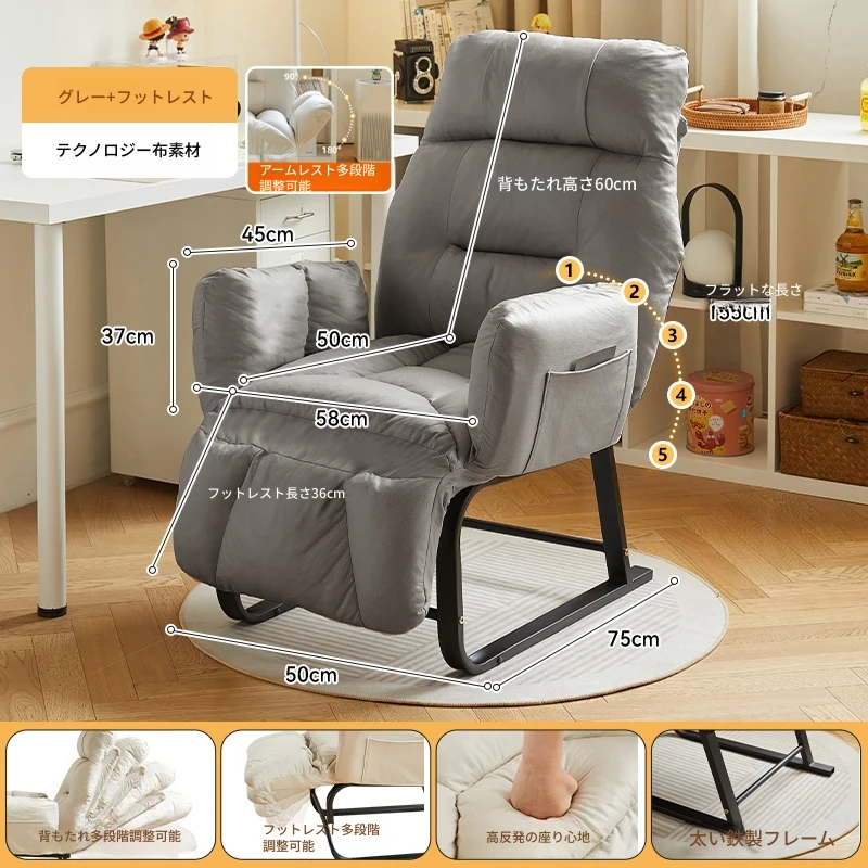グレー【背もたれ調整可能+フットレスト調整可能+アームレスト5段階調整】