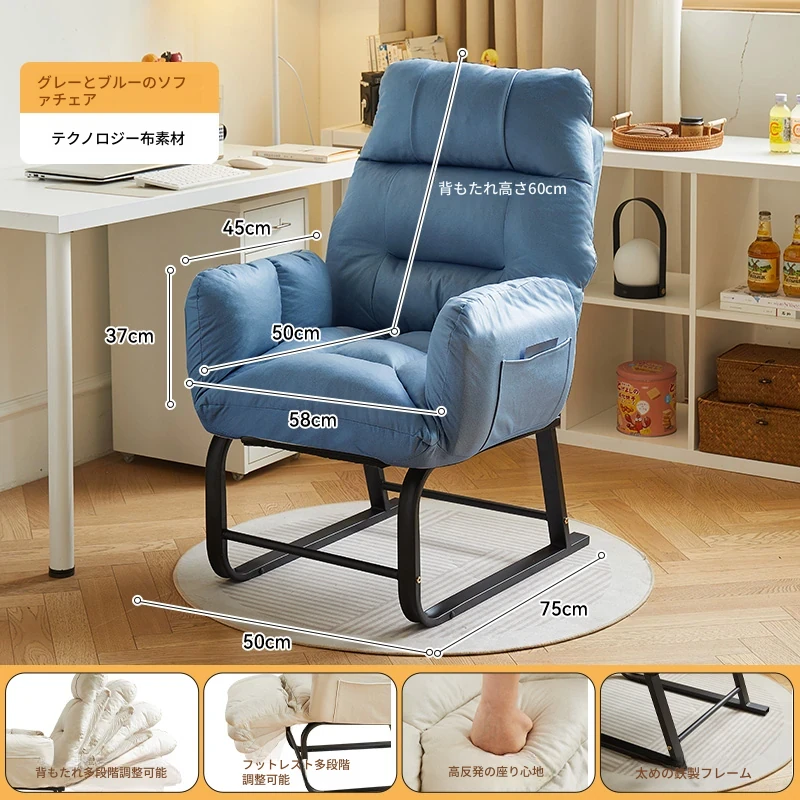 ブルー【背もたれ調整可能+アームレスト5段階調整】