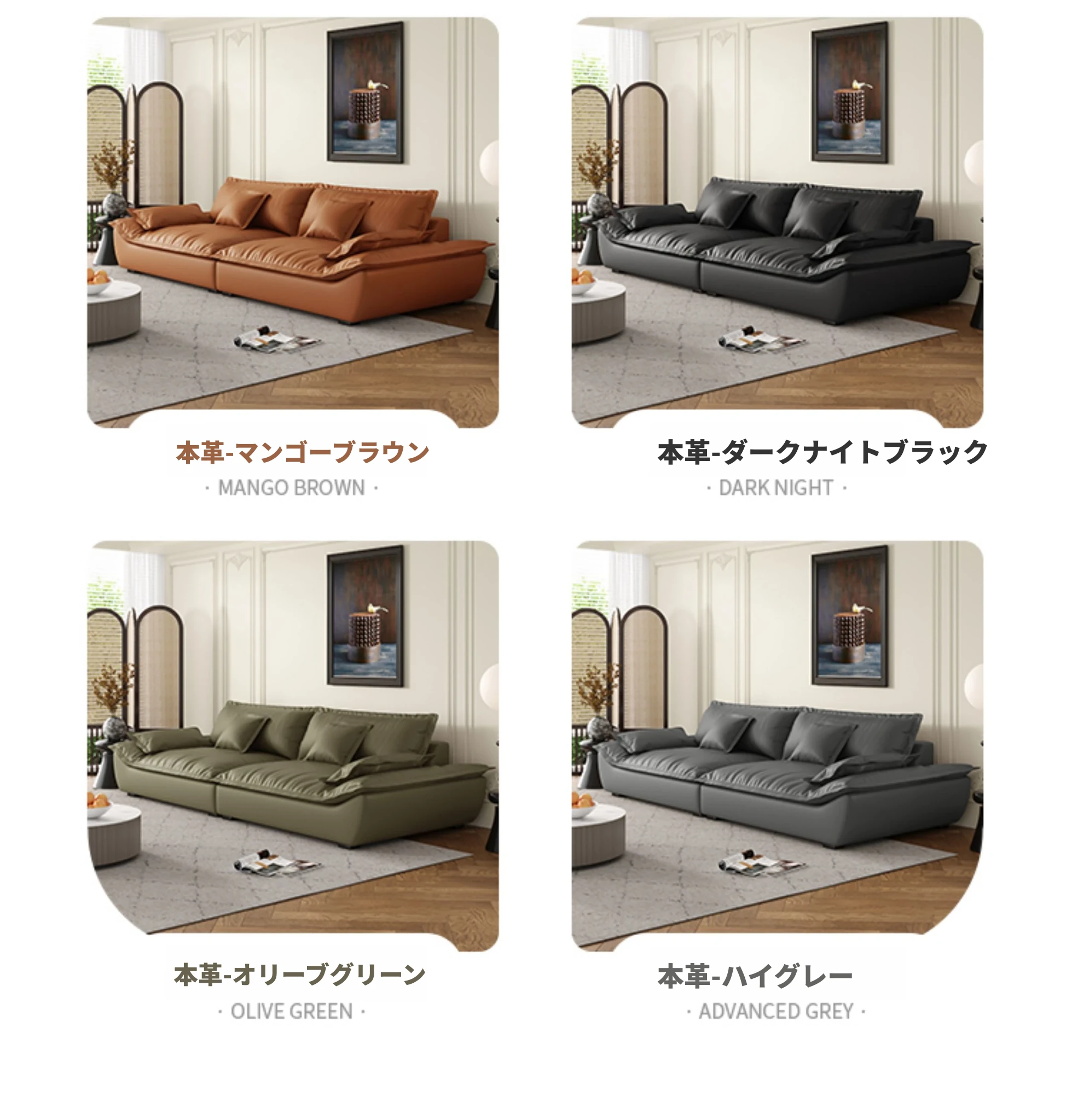 【輸入本革+ダウンクッション】四人用2.6メートル(幅1メートル)