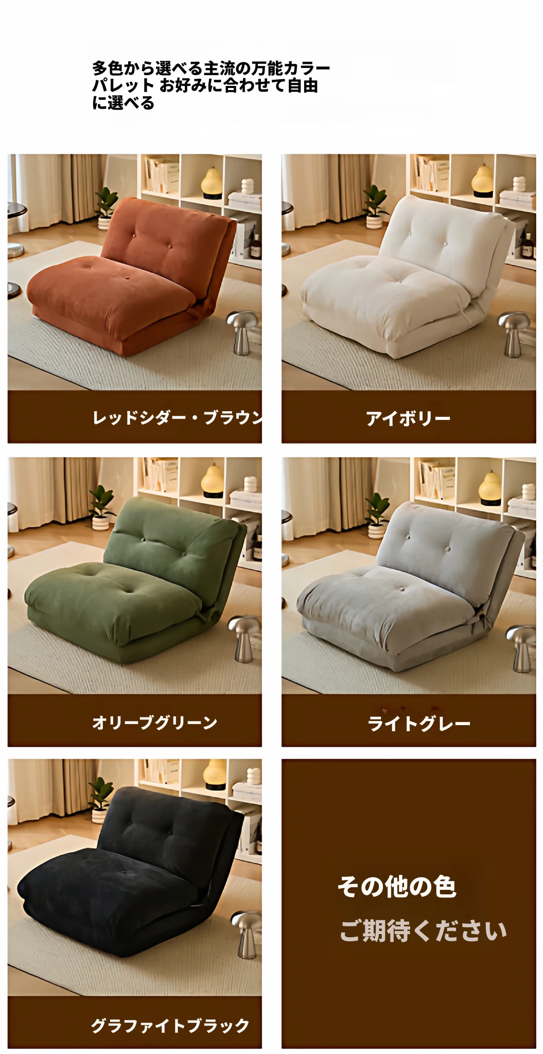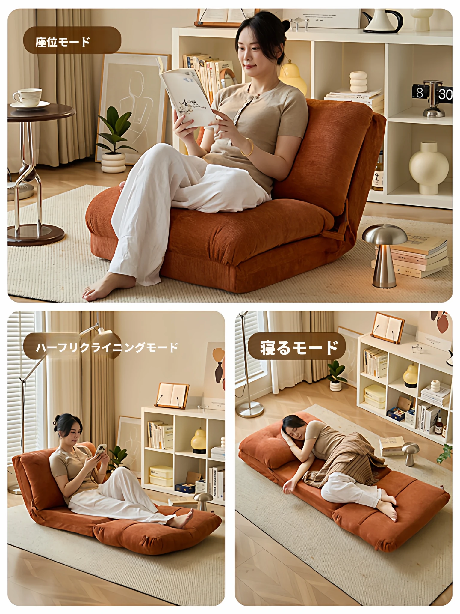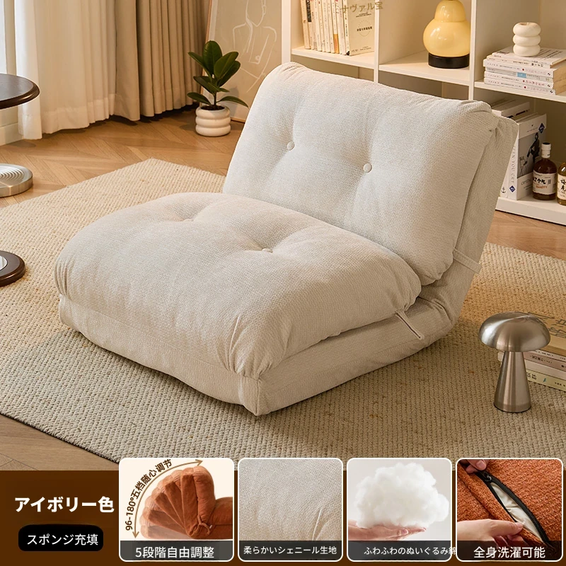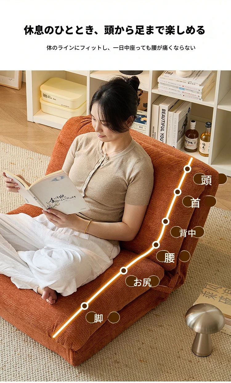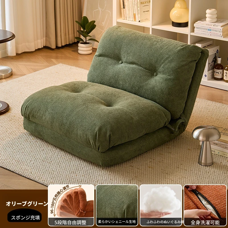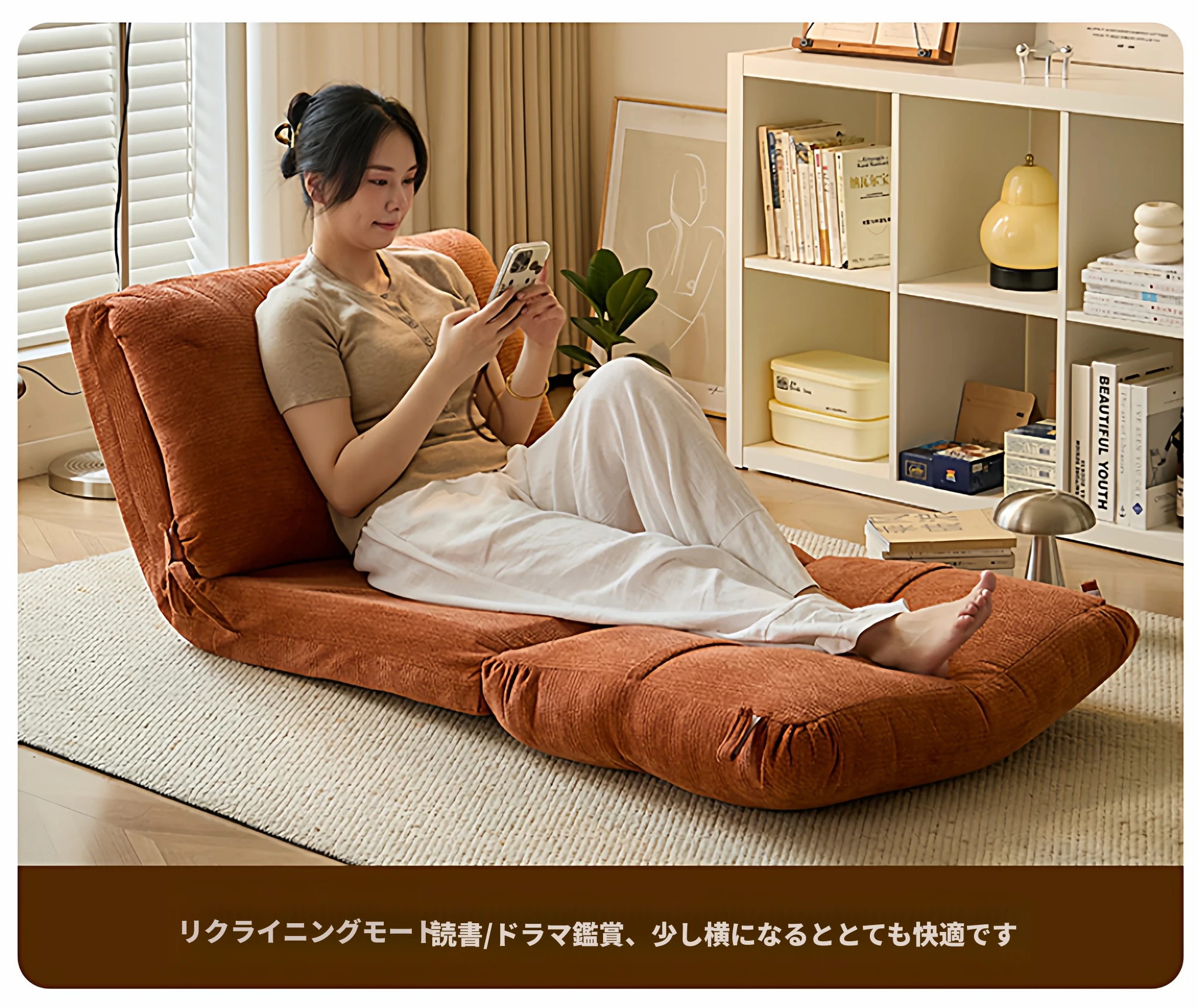 リラックスできるソファ!寝転んでもOK、寝てもOK!寝室やリビングにぴったりの背もたれ付きチェア。地べたで使えるカジュアルなデザインで、畳やバルコニー、窓際にも最適な一人用ソファです。