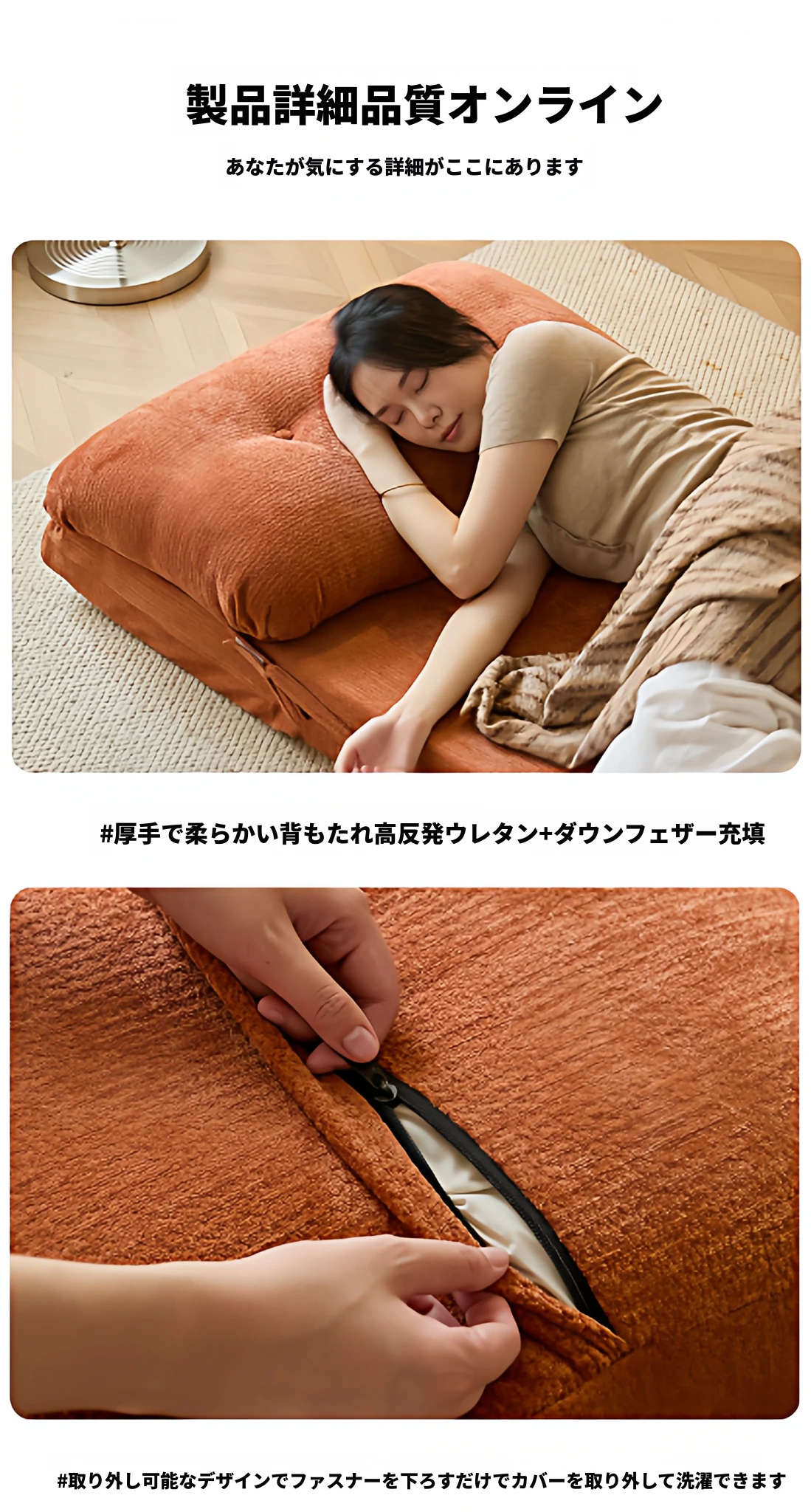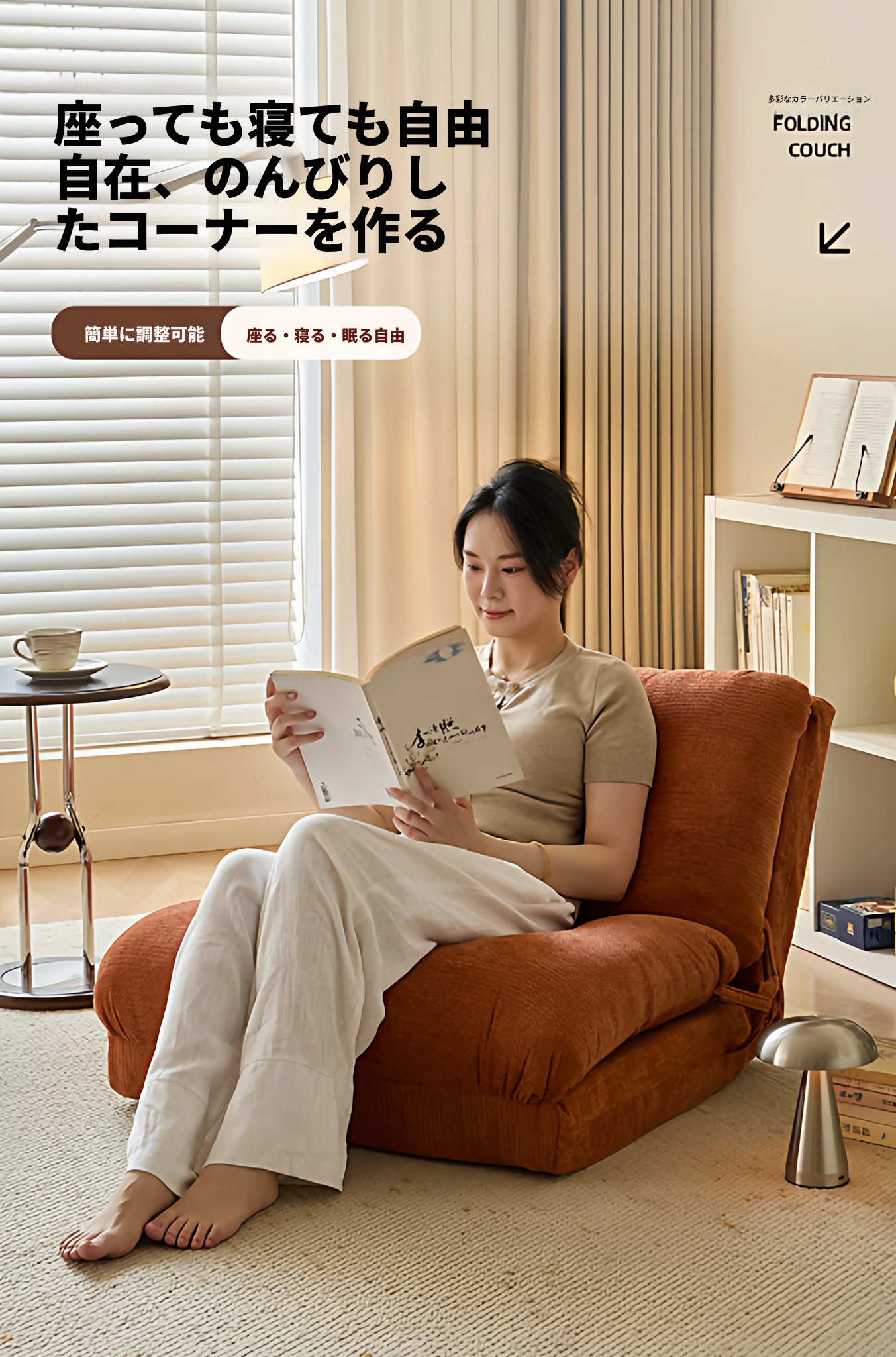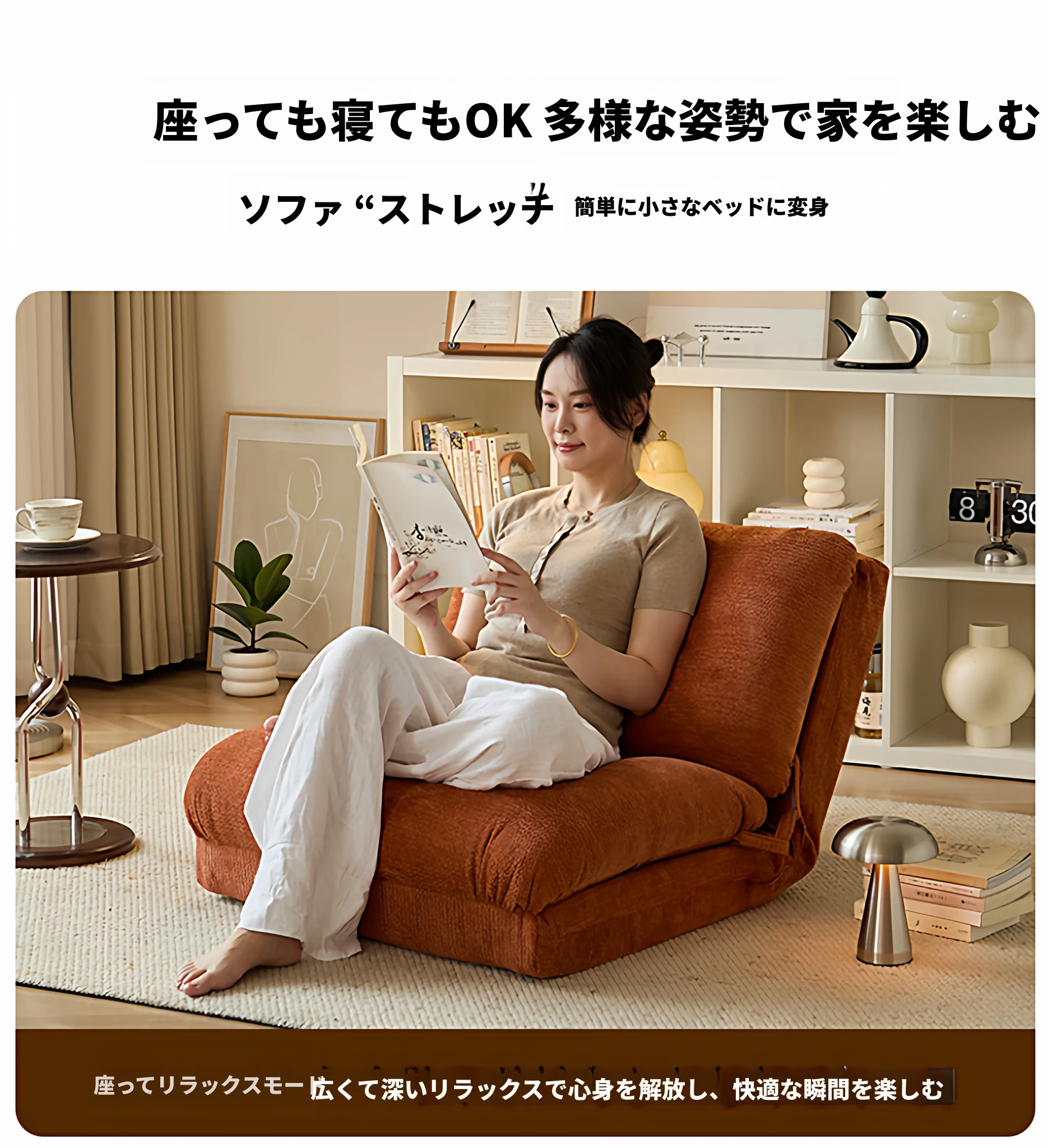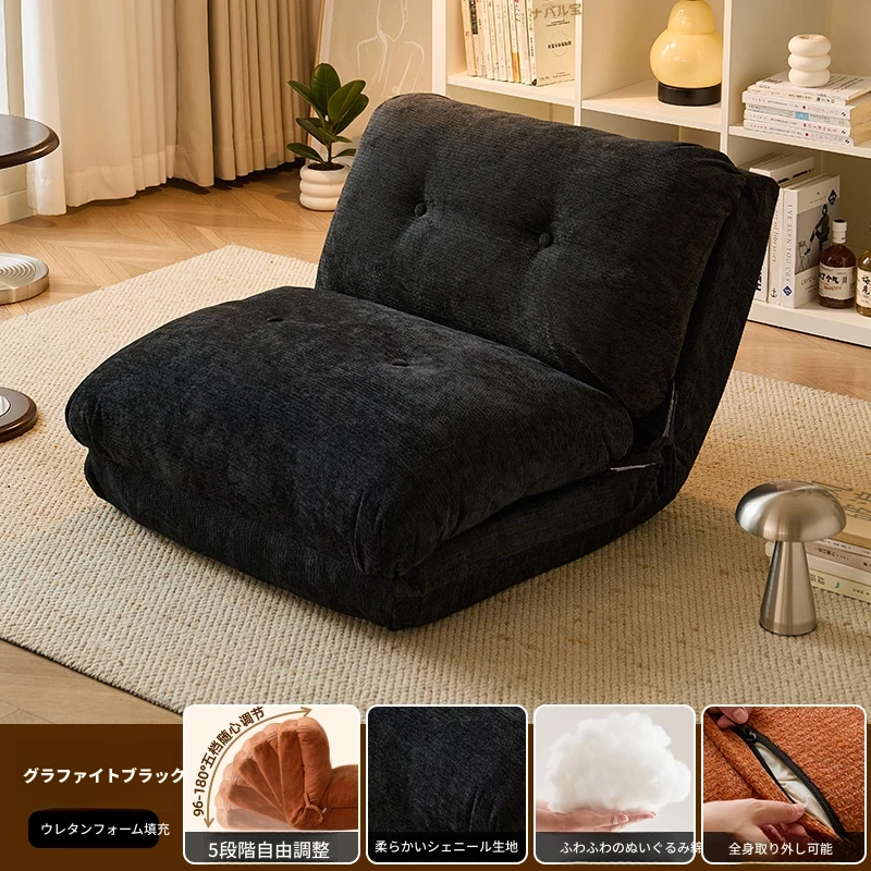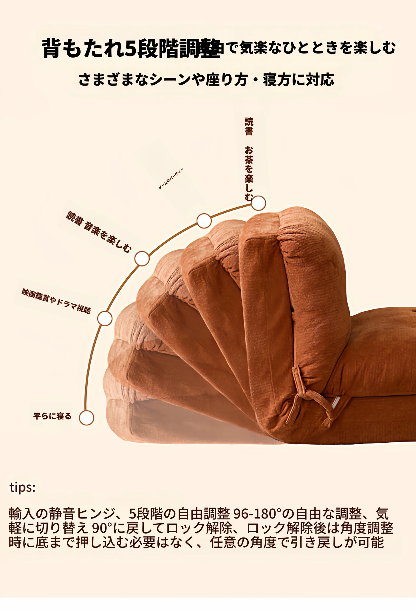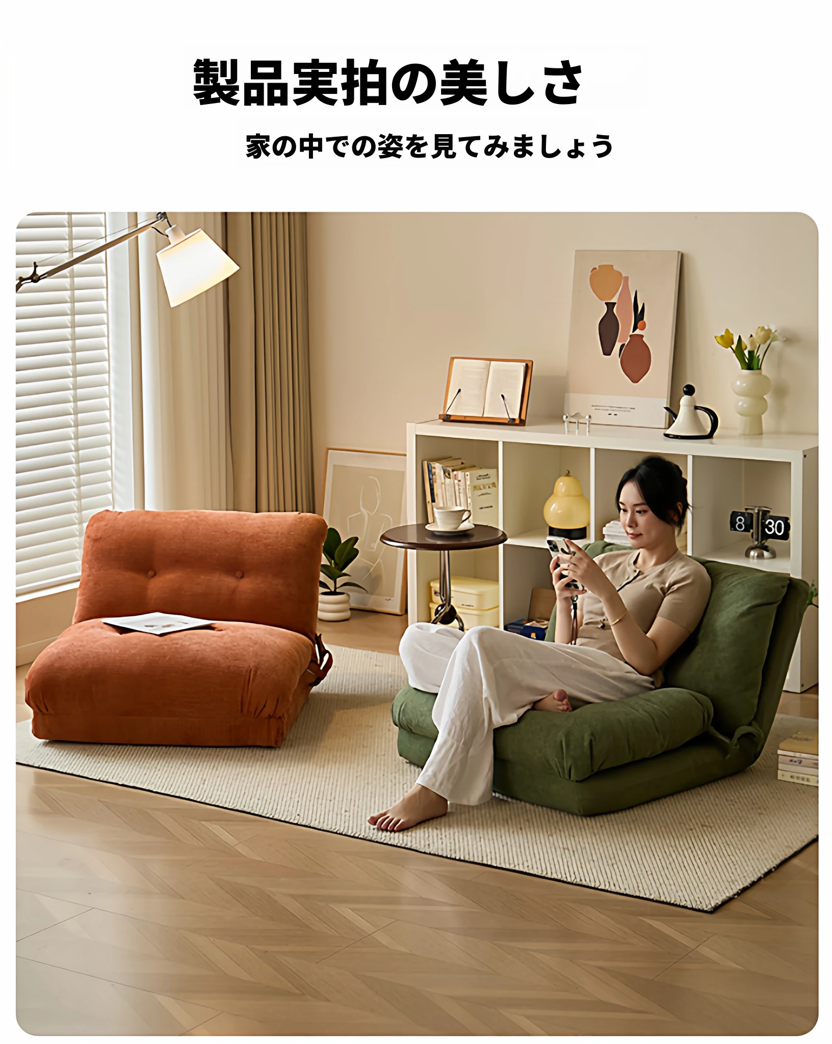 リラックスできるソファ!寝転んでもOK、寝てもOK!寝室やリビングにぴったりの背もたれ付きチェア。地べたで使えるカジュアルなデザインで、畳やバルコニー、窓際にも最適な一人用ソファです。