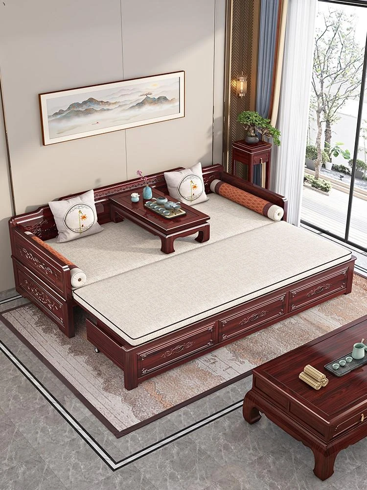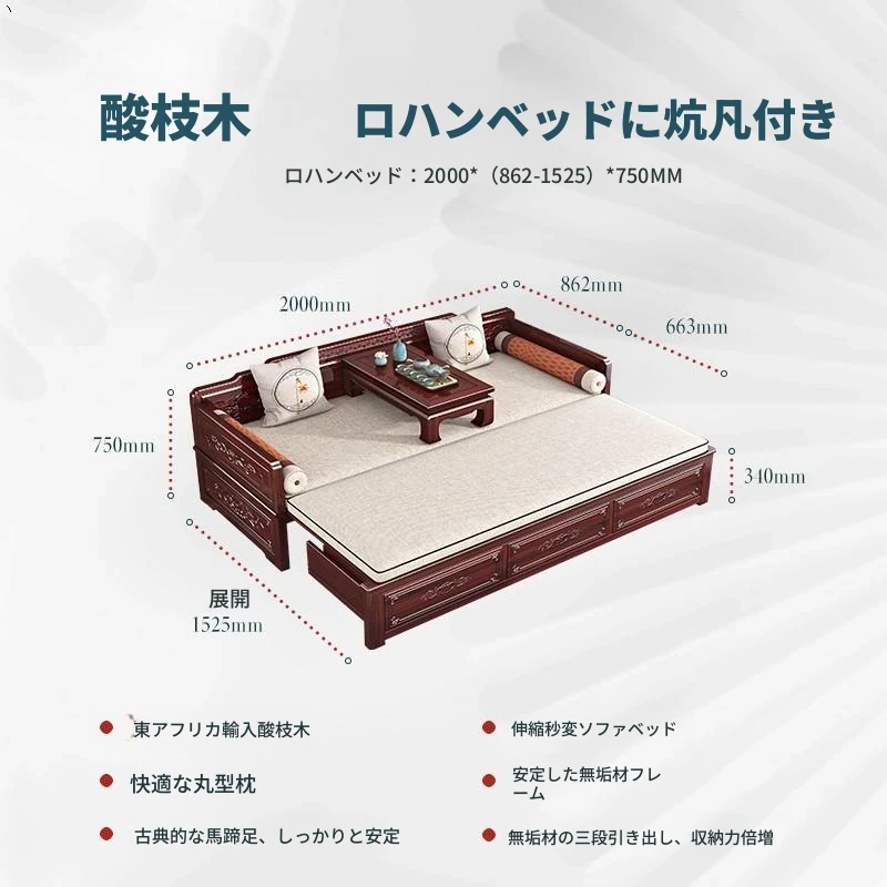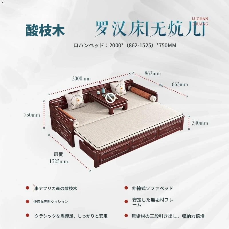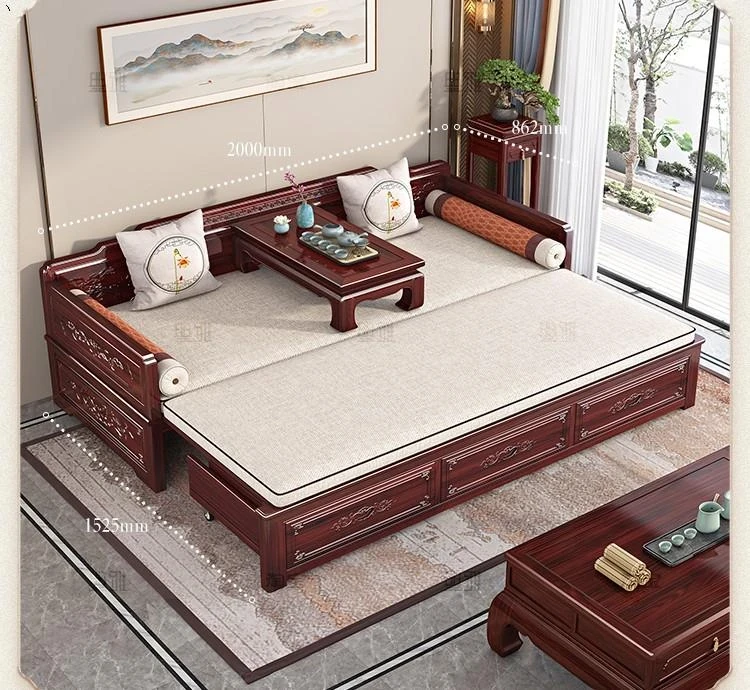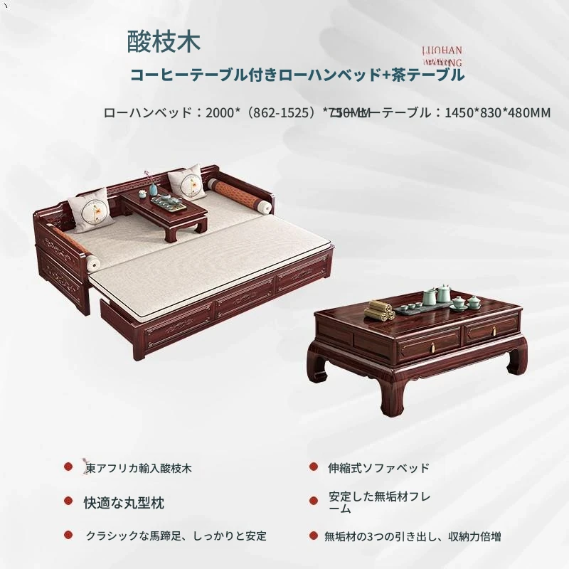 新中式ロハンベッド!プルダウン機能付きの高品質無垢材ソファベッド。小型住宅にもぴったりな酸枝木製、リビングルームでの多用途使用が可能。おしゃれな空間を演出し、快適な眠りを提供します!