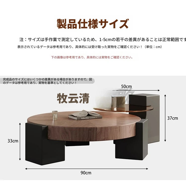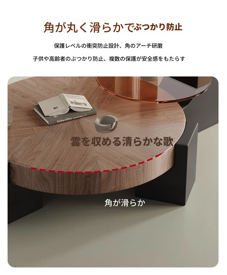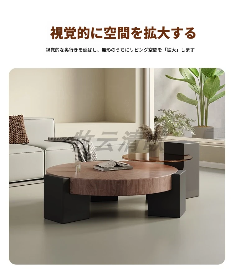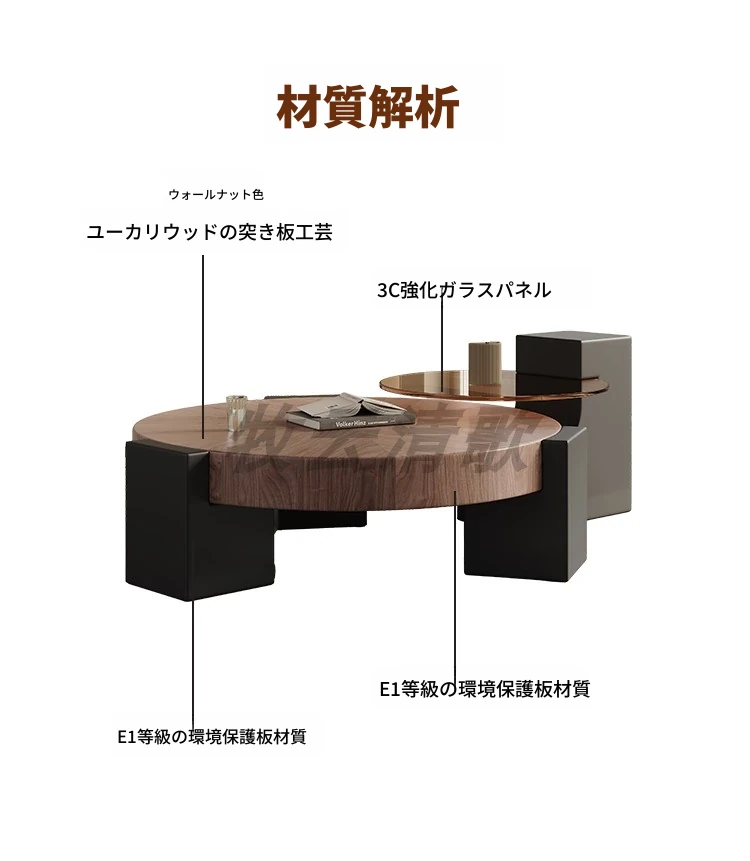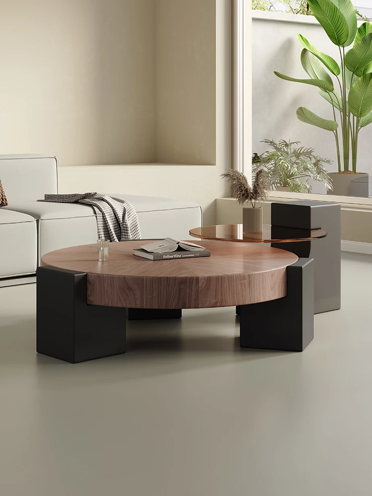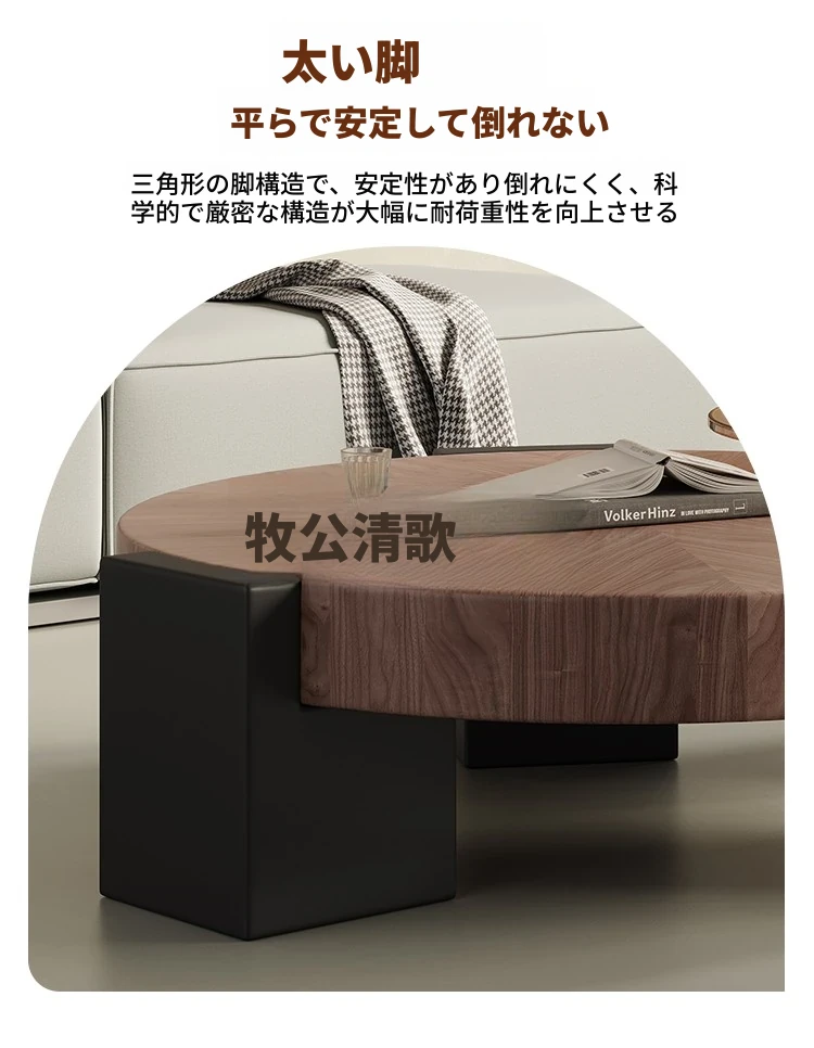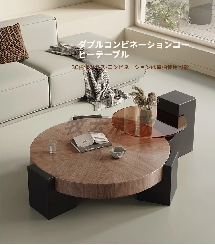 無垢材のヴィンテージ風クリエイティブラウンドテーブルセット - シンプルでモダンなデザイン、狭いリビングにも最適なウォールナット無垢材のデザイナーズコーヒーテーブル。おしゃれな空間を演出します!