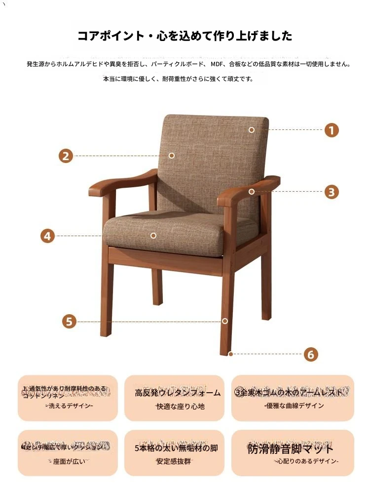 ソファチェア【ウォールナット+コーヒー布】洗えるデザイン ソフトパッド厚手/快適な長時間座り