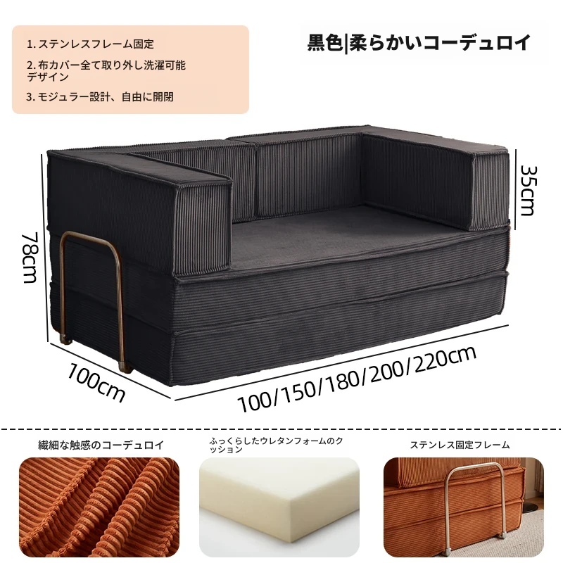 1.8m⭐ブラック⭐肌触りの良いコーデュロイ【55D高弾性スポンジタイプ+304ステンレス】