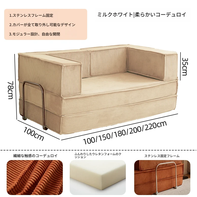 1.8m⭐オフホワイト⭐肌触りの良いコーデュロイ【55D高弾性スポンジタイプ+304ステンレス】