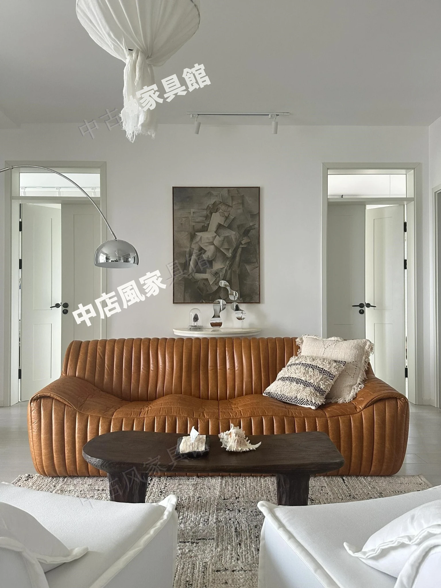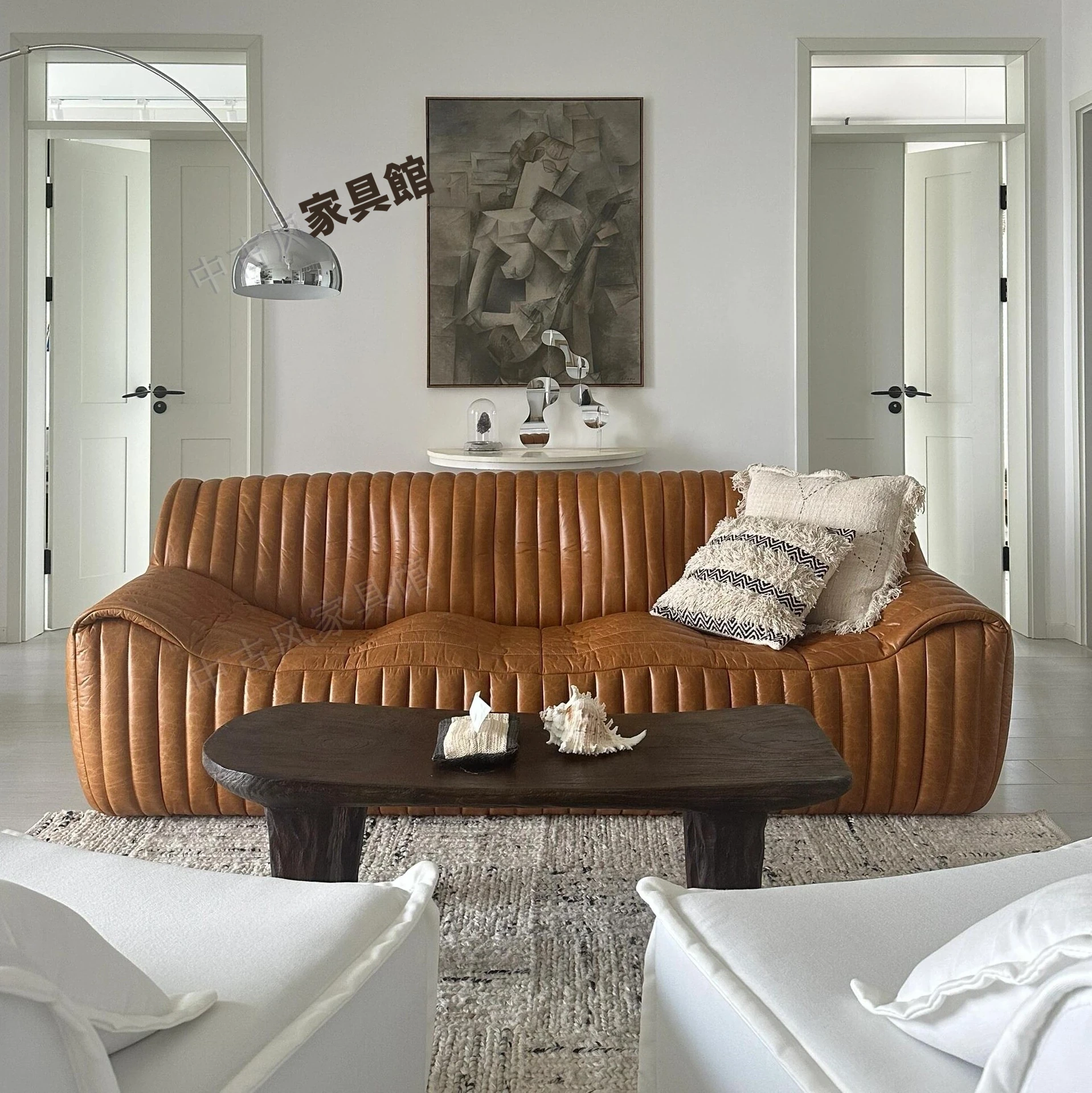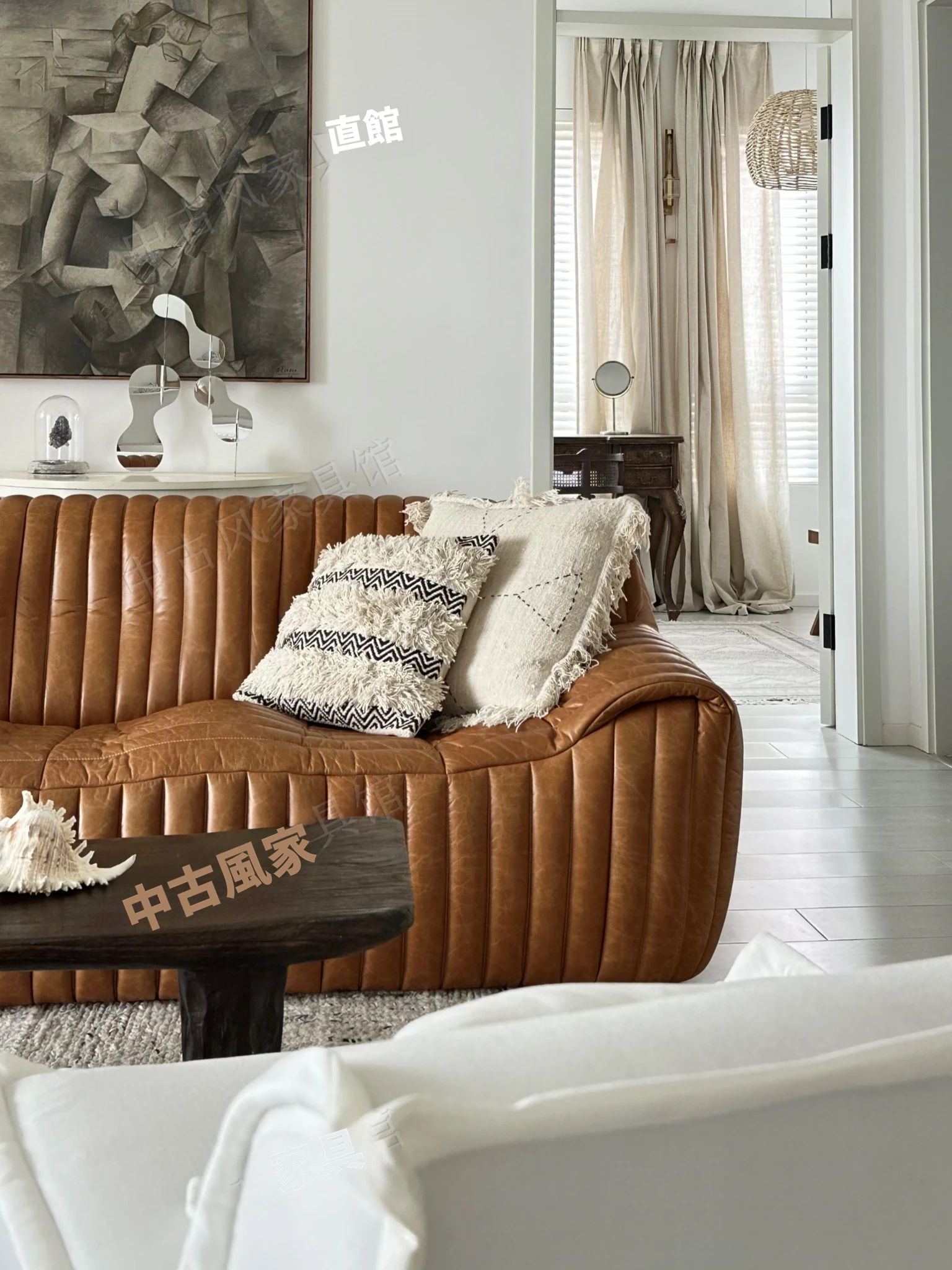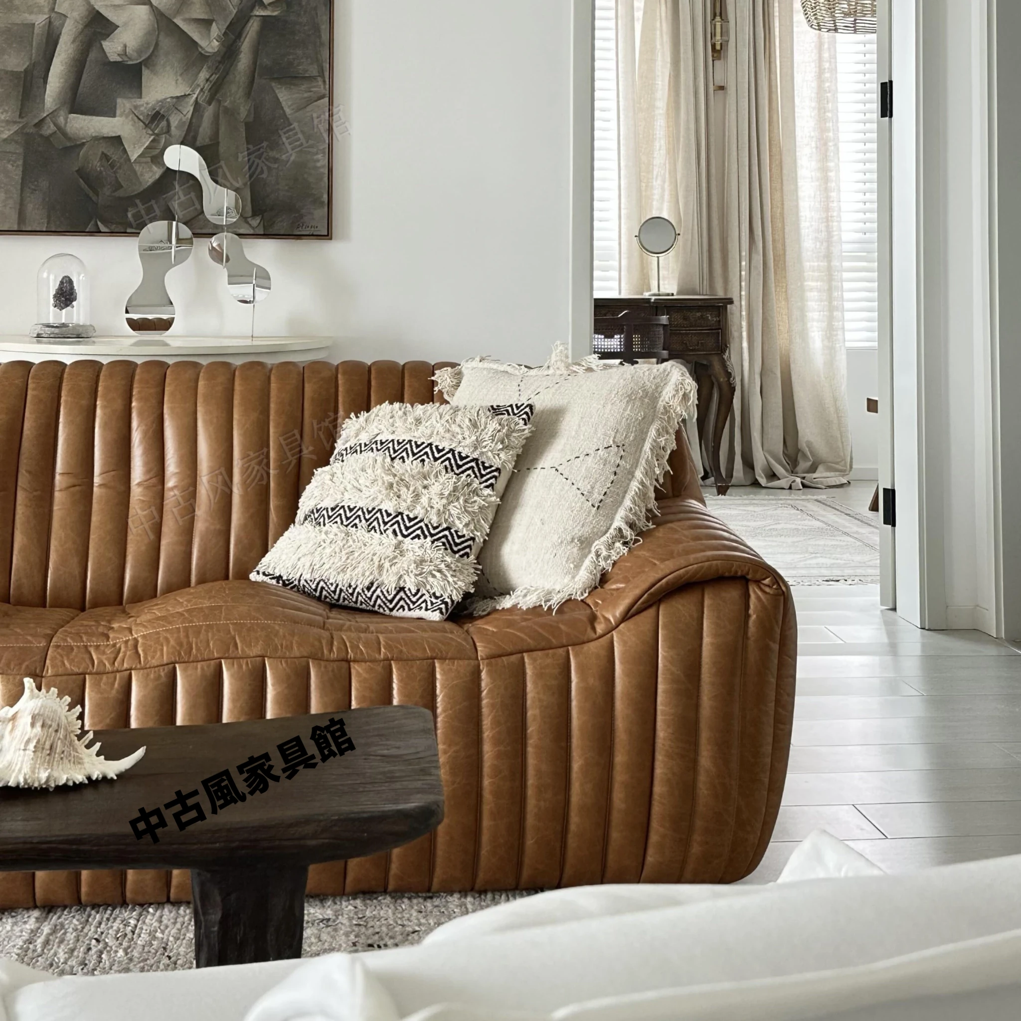 美しい中古風波浪ソファ!モダンなリビングにぴったりの直線デザイン、上質な本革使用のアメリカンレトロスタイル。3人掛けで、接客ルームにも最適です。あなたの空間を格上げする一品!