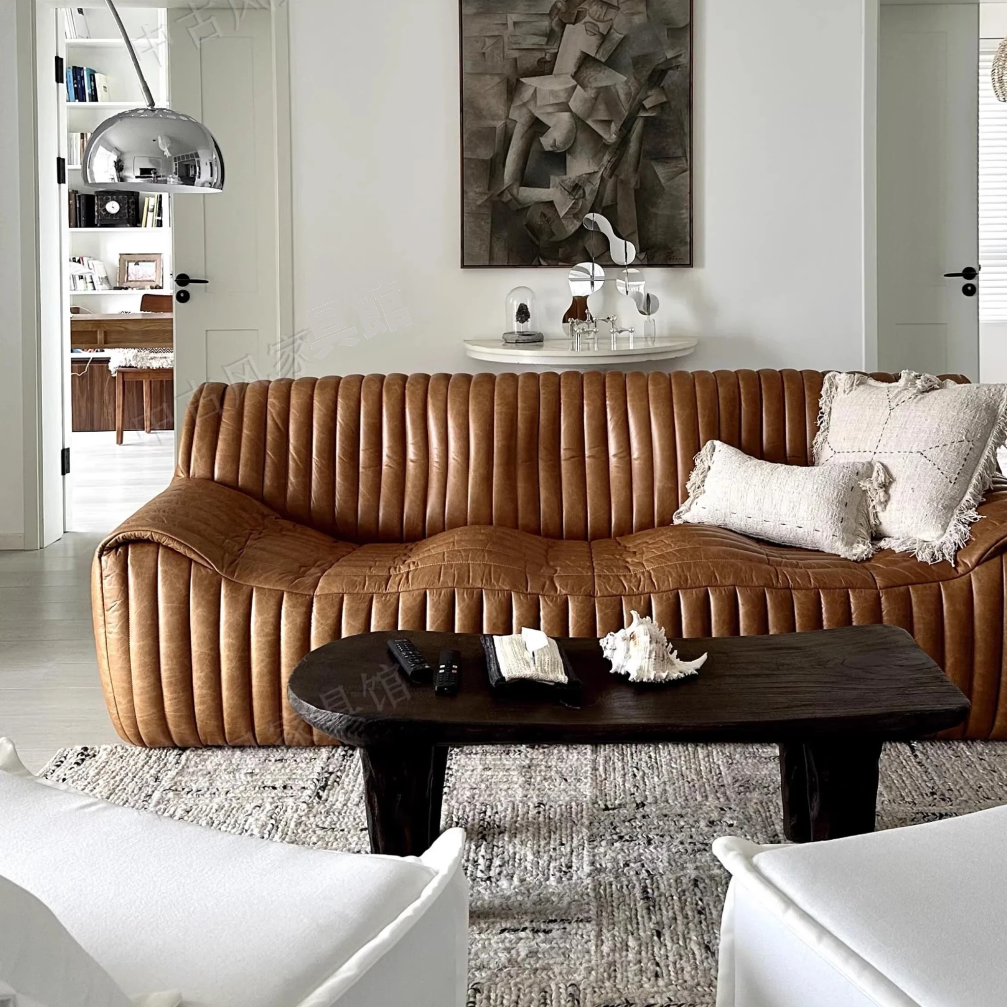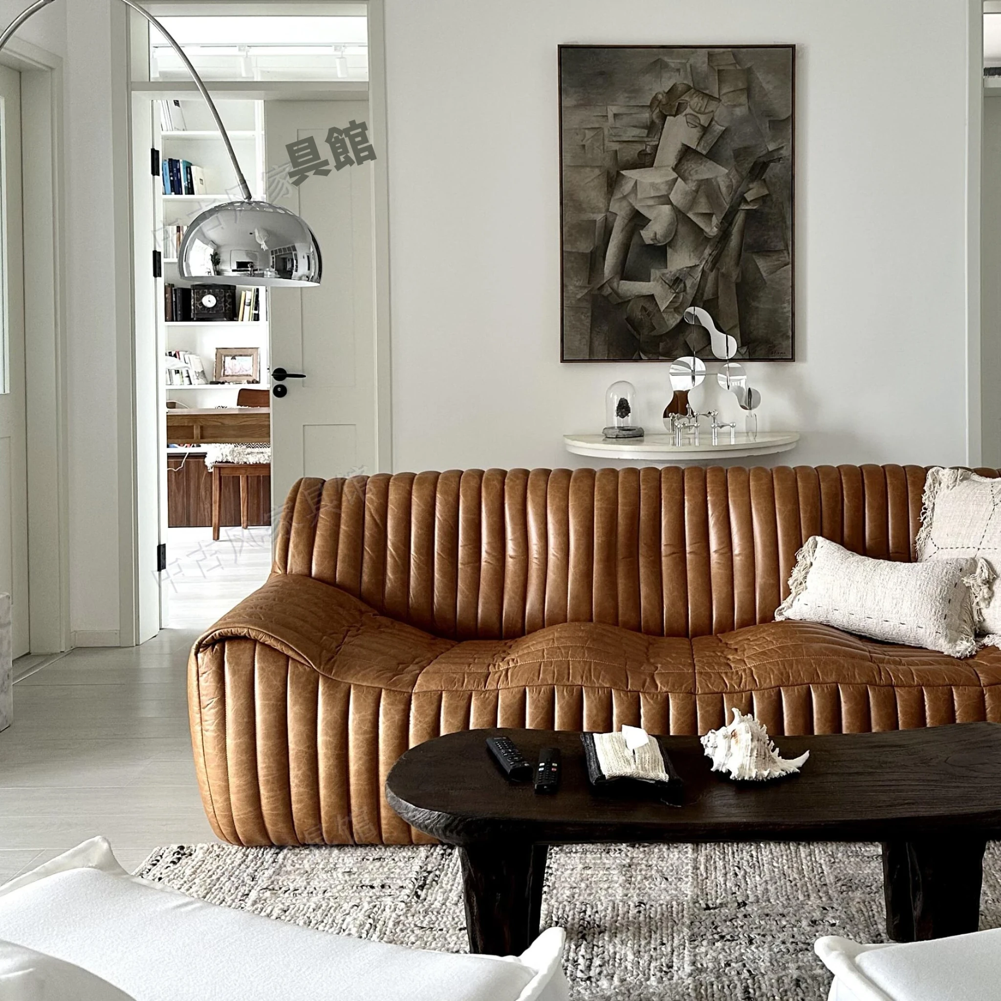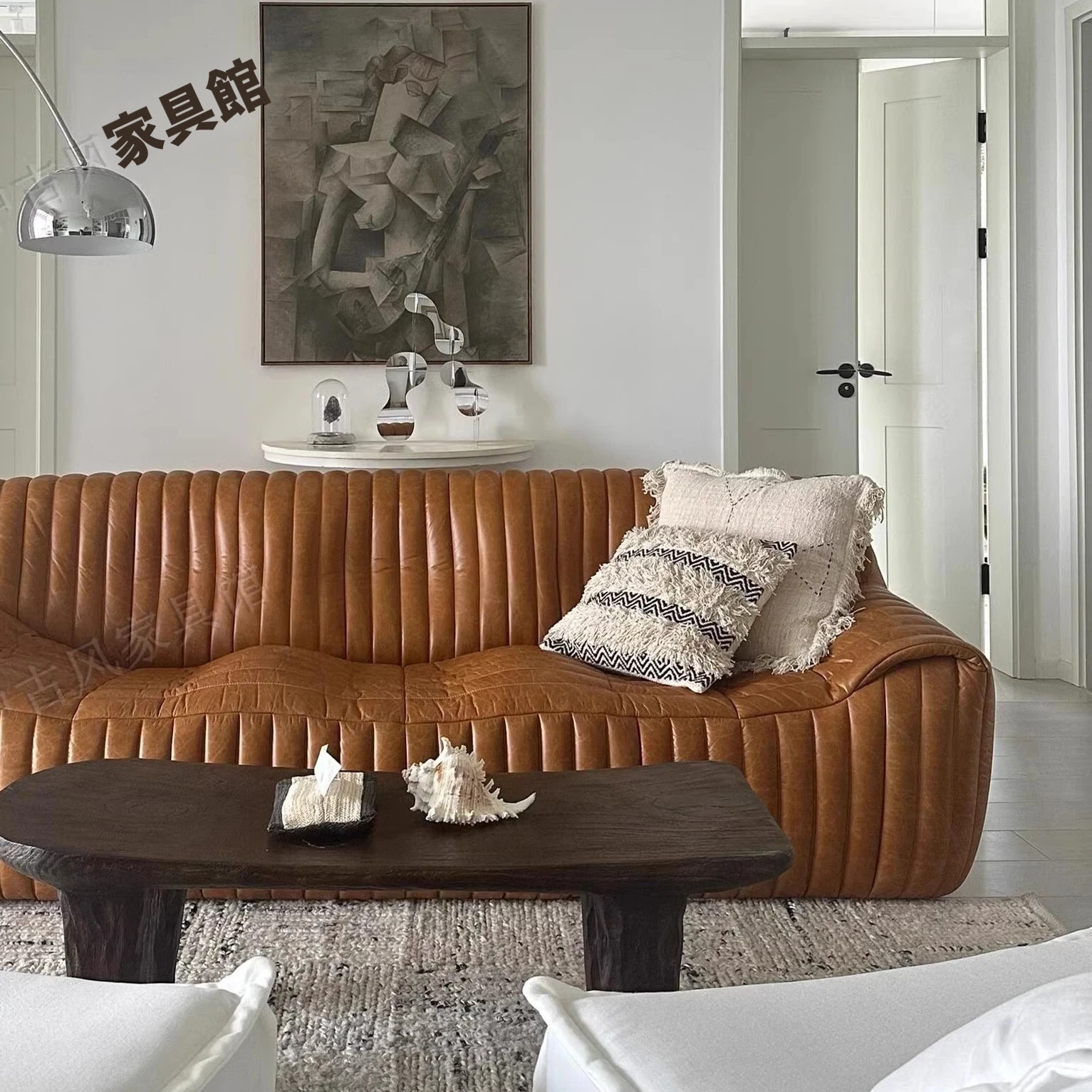 美しい中古風波浪ソファ!モダンなリビングにぴったりの直線デザイン、上質な本革使用のアメリカンレトロスタイル。3人掛けで、接客ルームにも最適です。あなたの空間を格上げする一品!