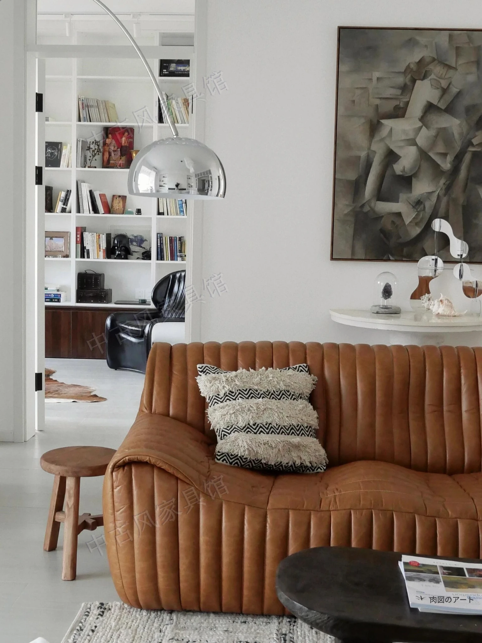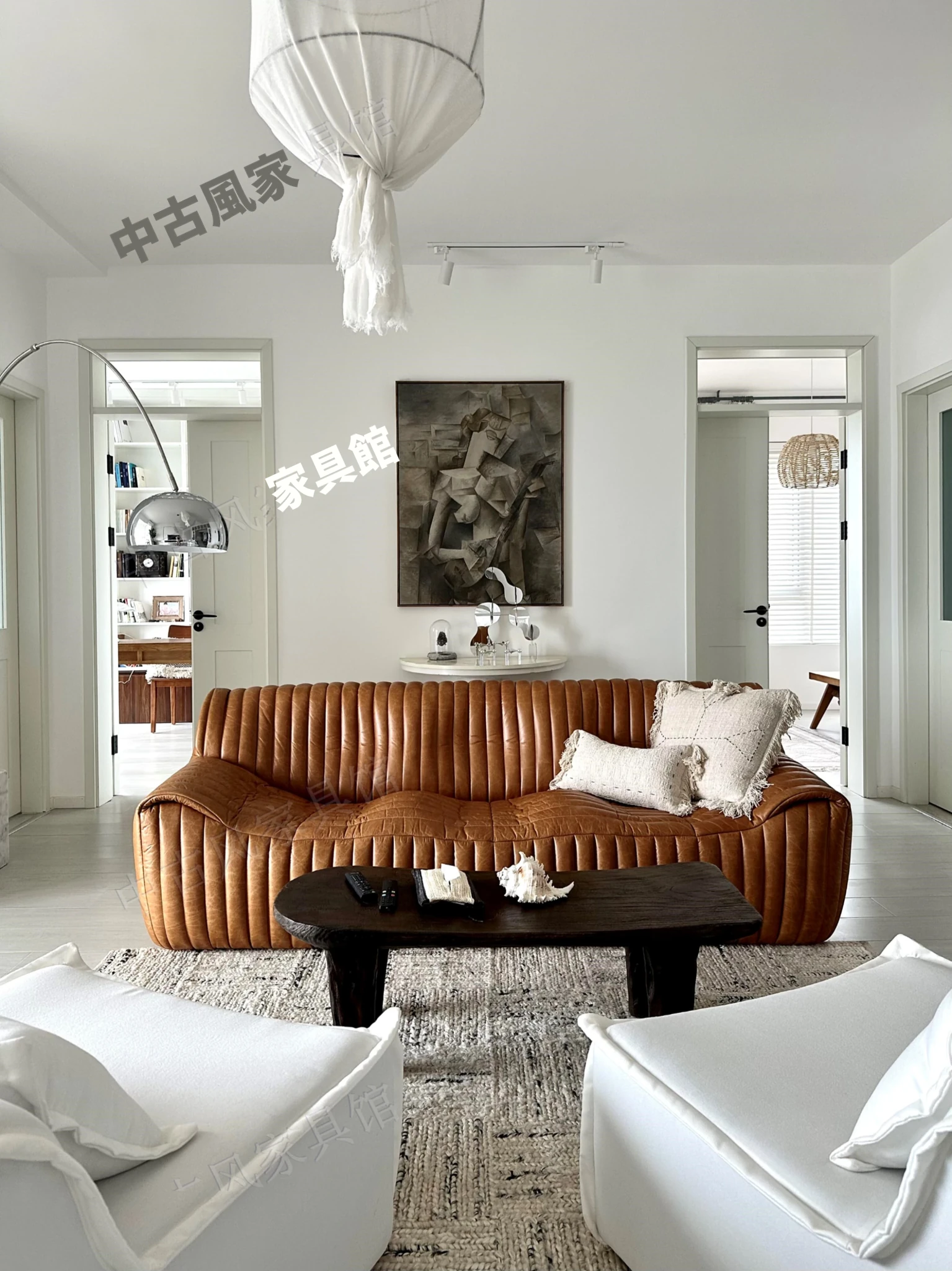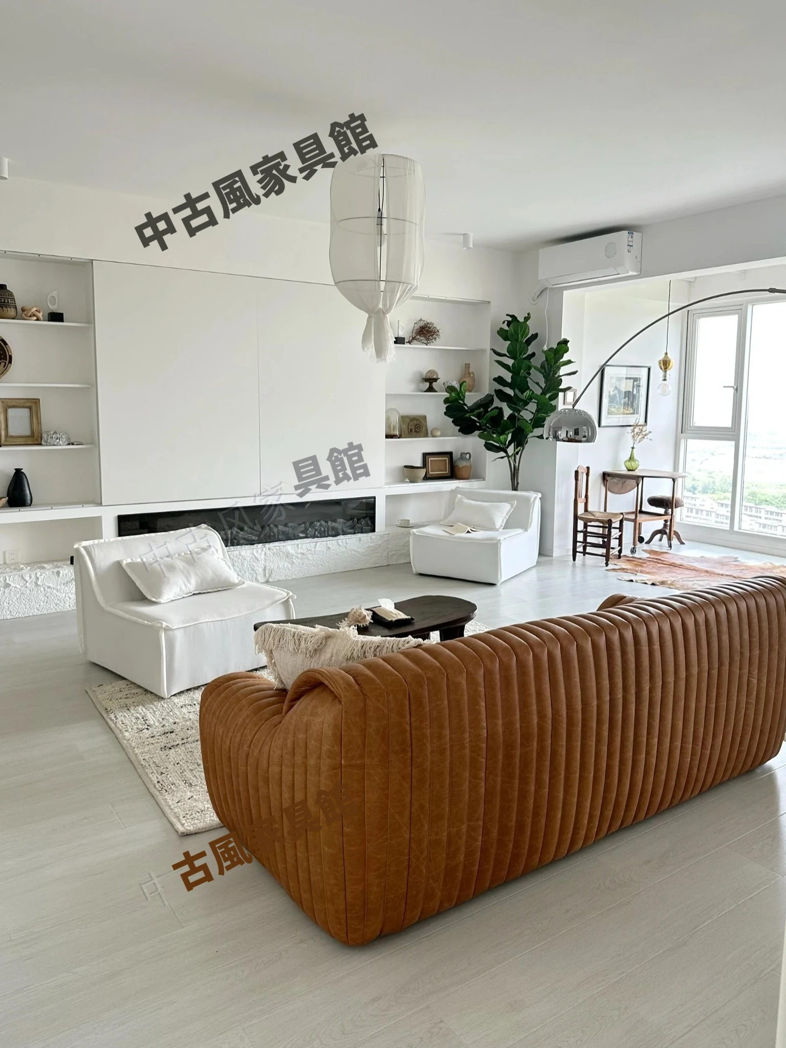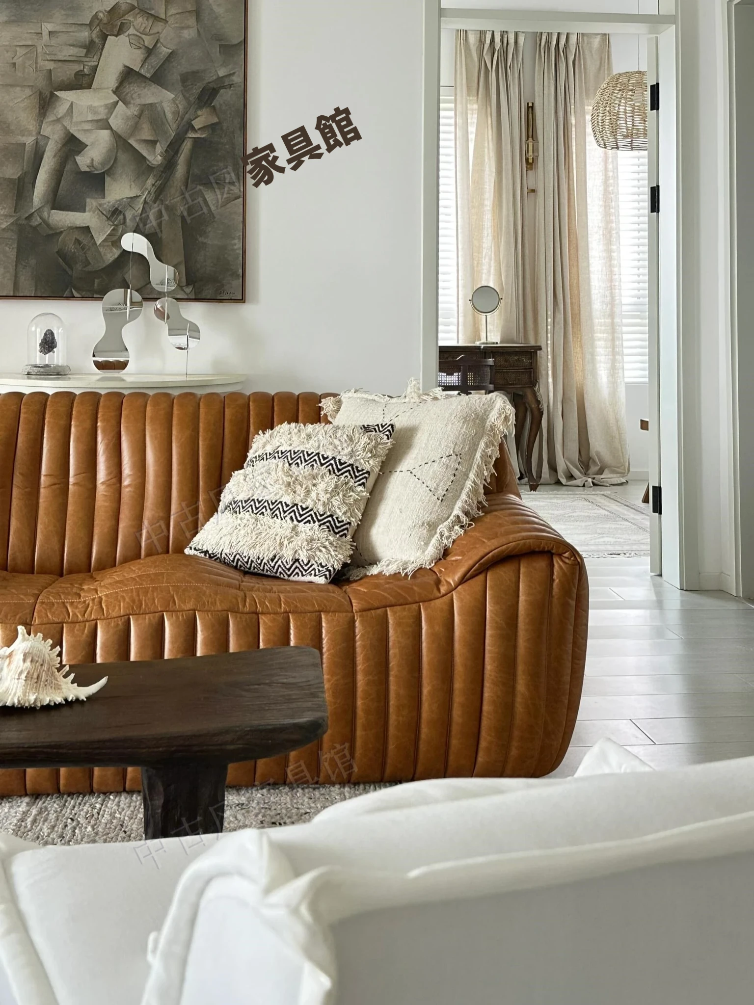 美しい中古風波浪ソファ!モダンなリビングにぴったりの直線デザイン、上質な本革使用のアメリカンレトロスタイル。3人掛けで、接客ルームにも最適です。あなたの空間を格上げする一品!