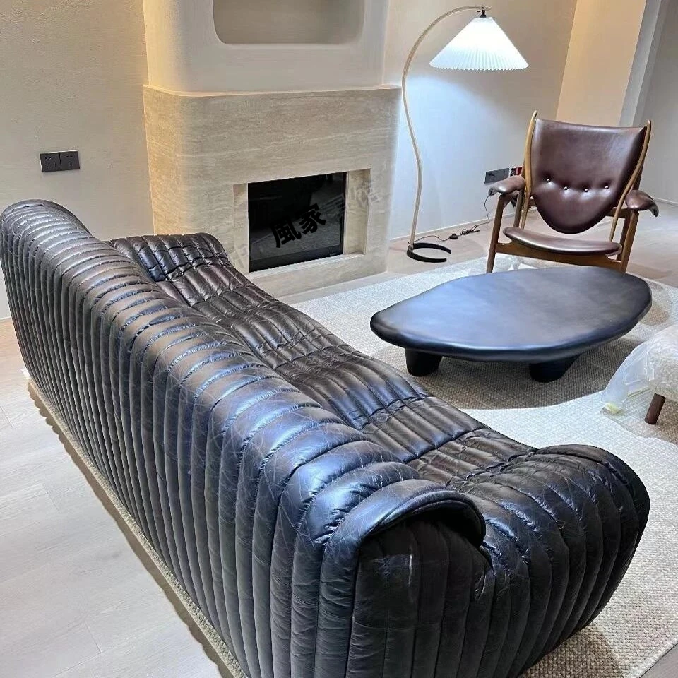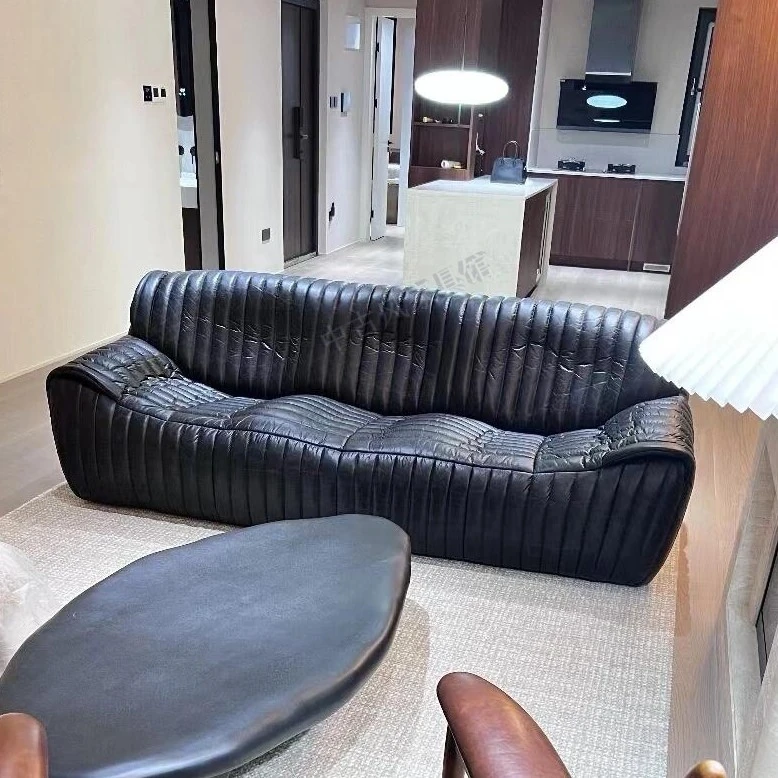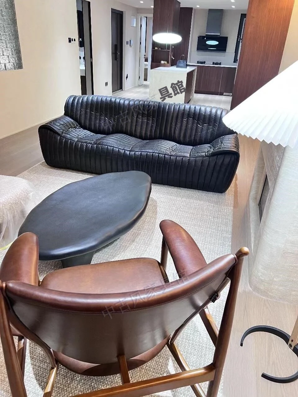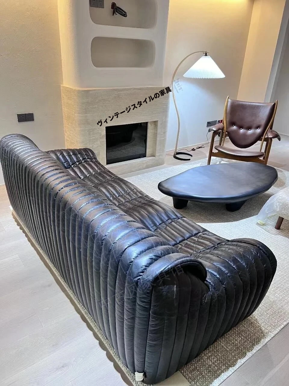 中古風波浪ソファー|現代リビングにぴったり!直線的な上質本革のユニークなアメリカンビンテージデザイン、3人掛けで接客にも最適!おしゃれな空間を演出します。