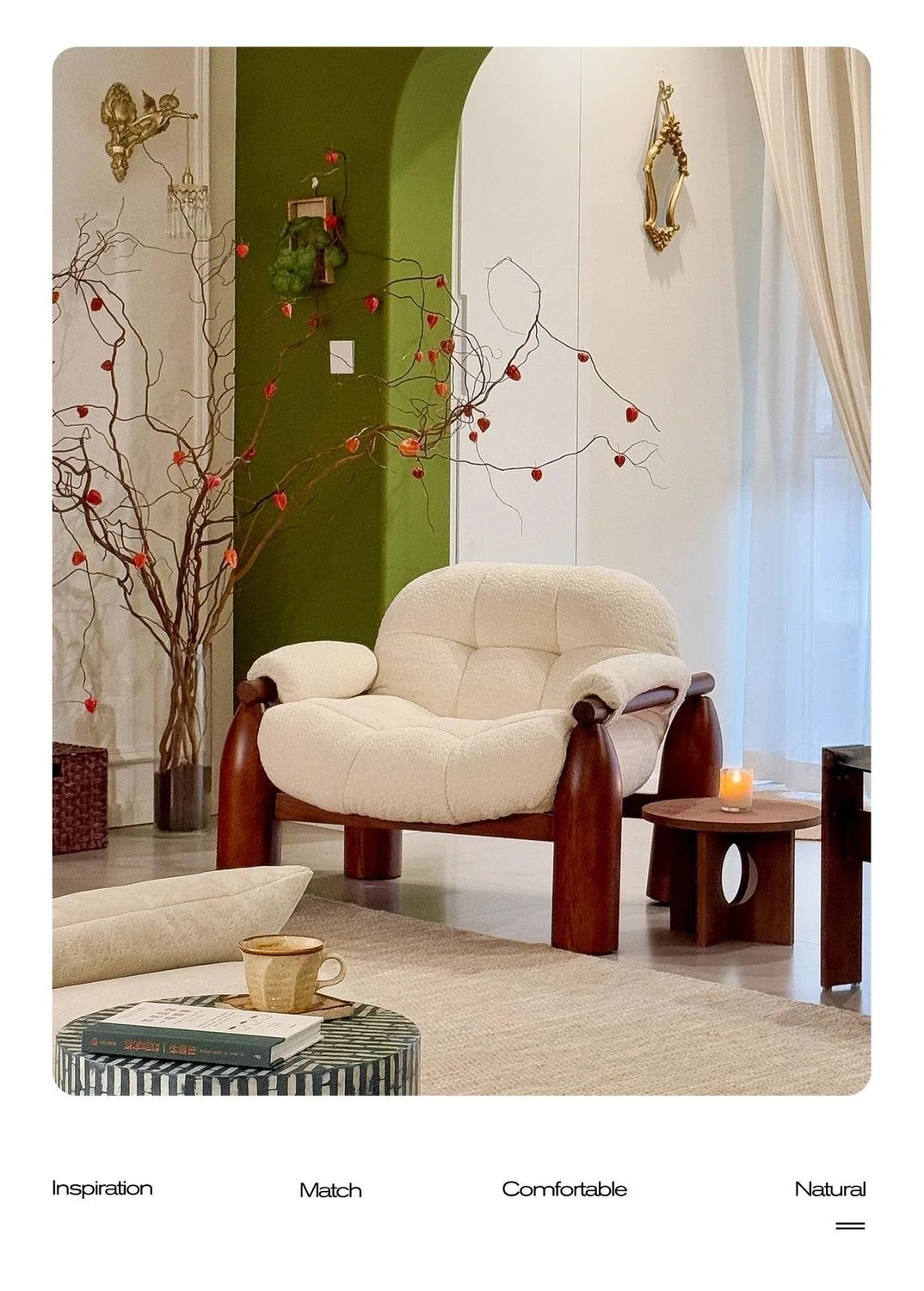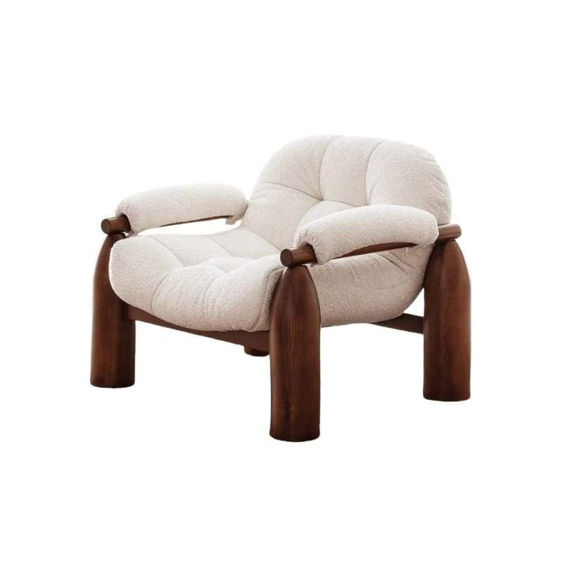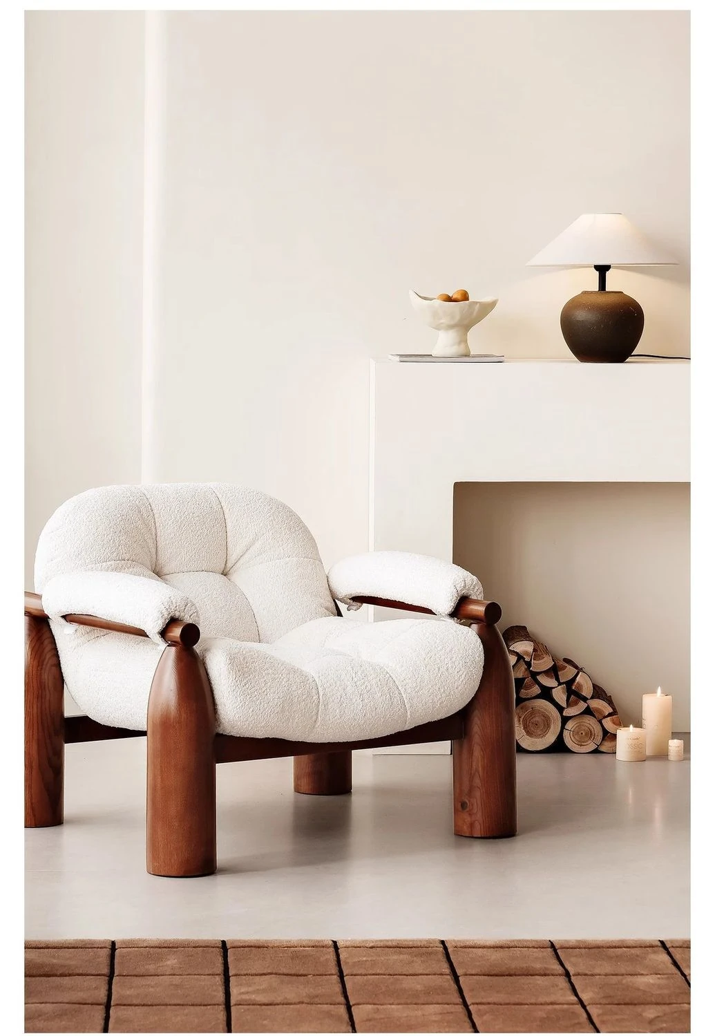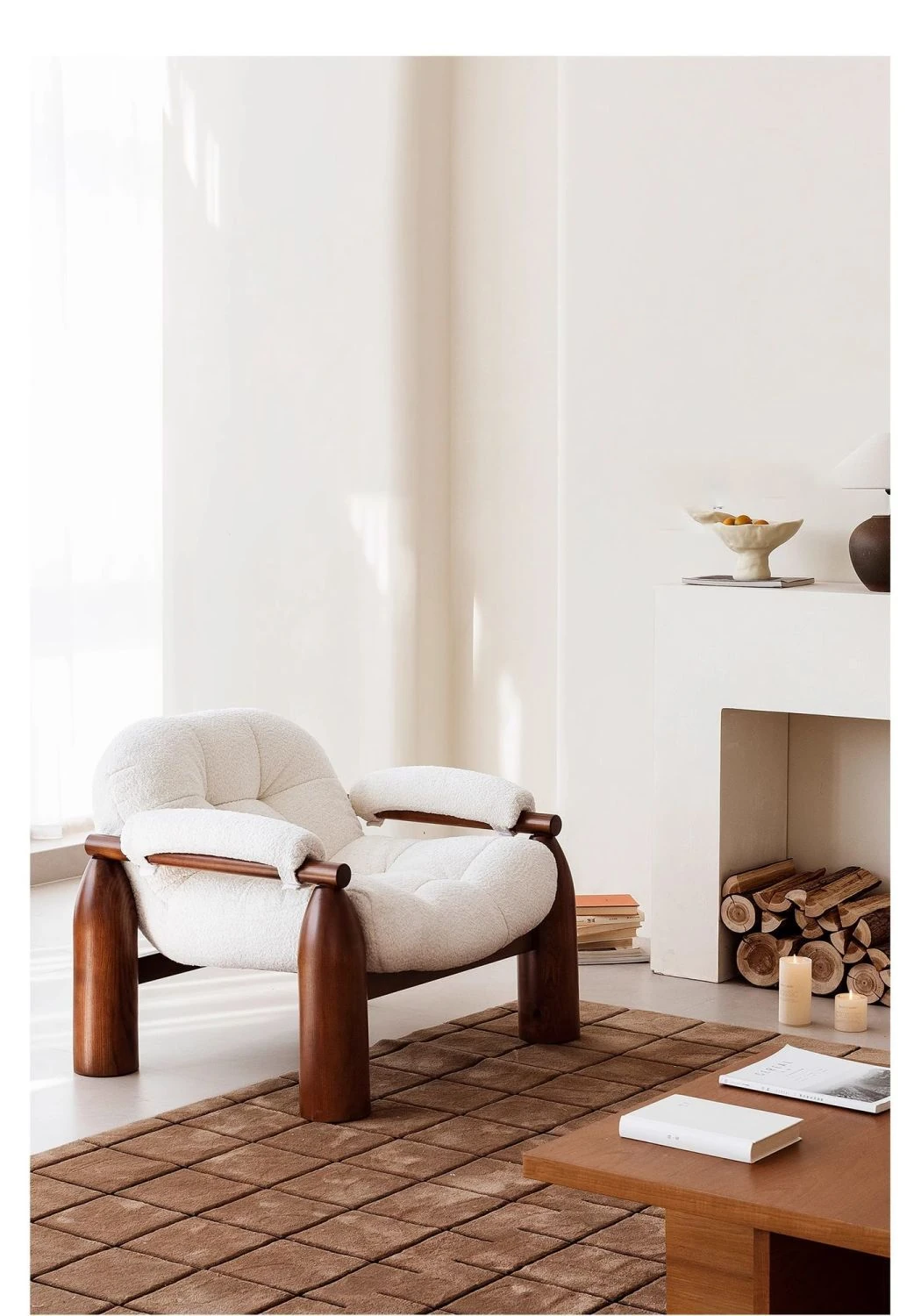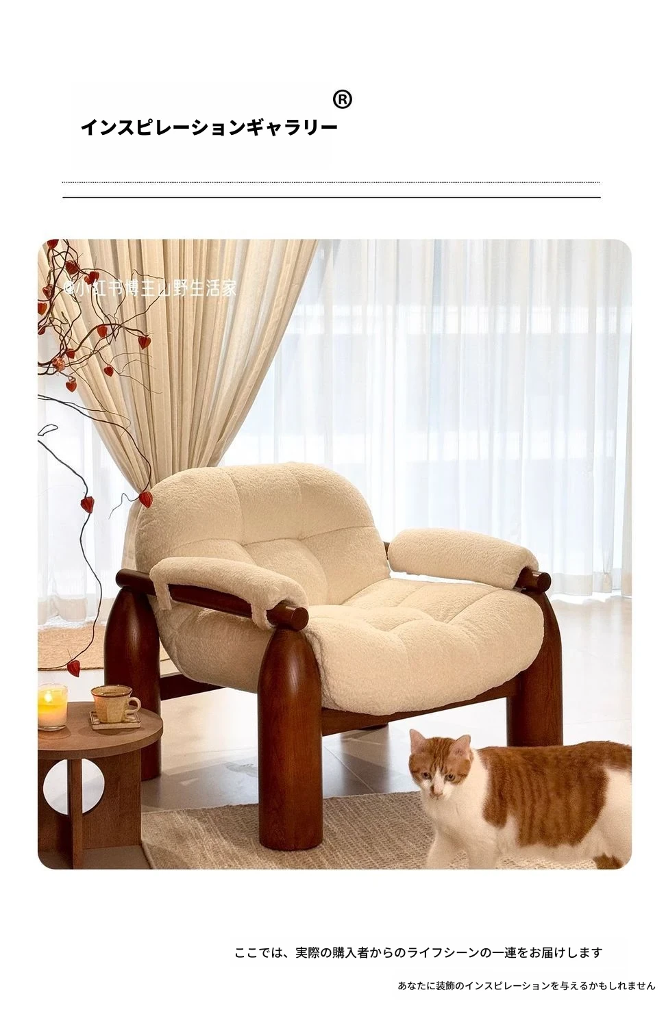 ヴィンテージ風の布製ラウンジソファチェア - デザイナーが手掛けたおしゃれな一人掛け、リビングや寝室に最適!小型住宅にもぴったりなウール素材のシープスキンチェアで、心地よいひとときを演出します。