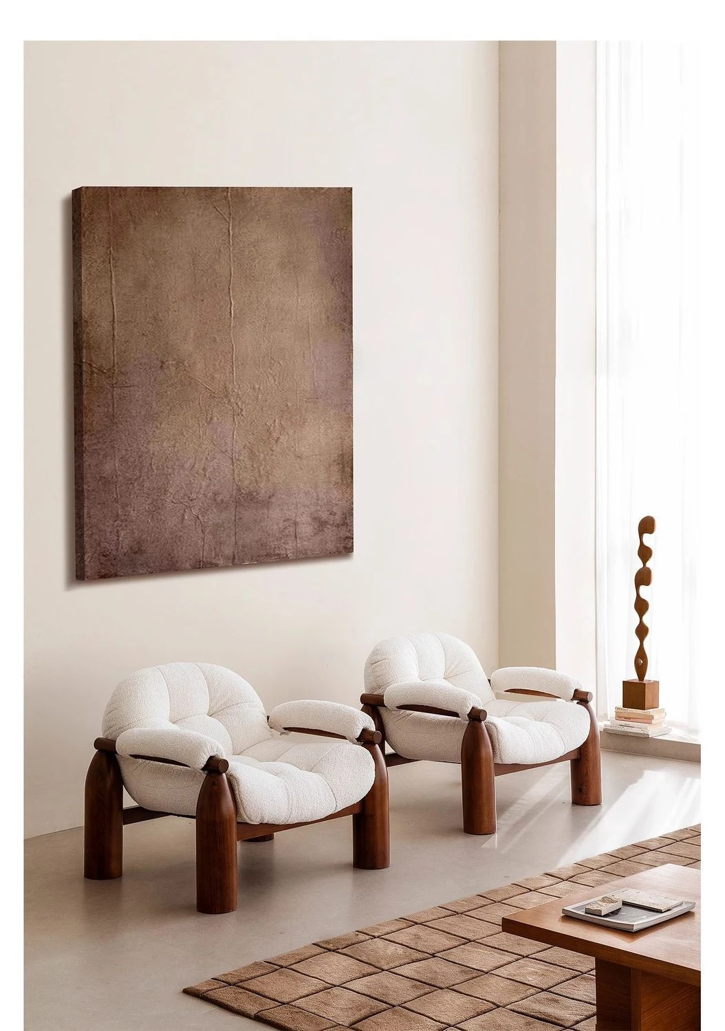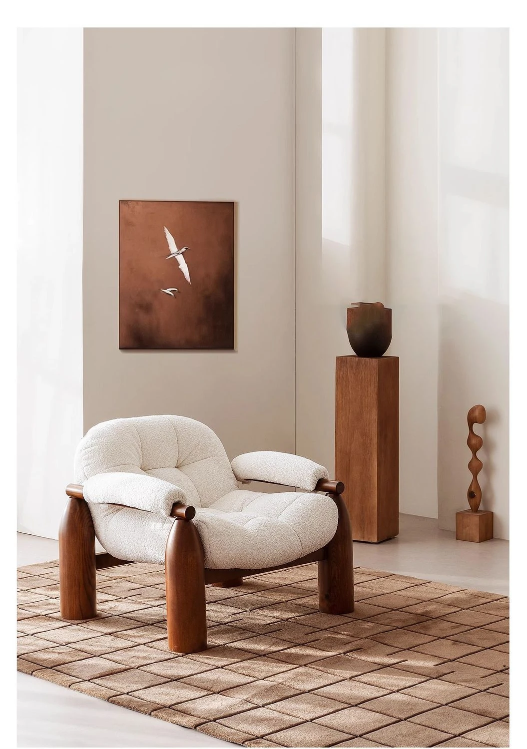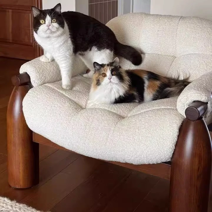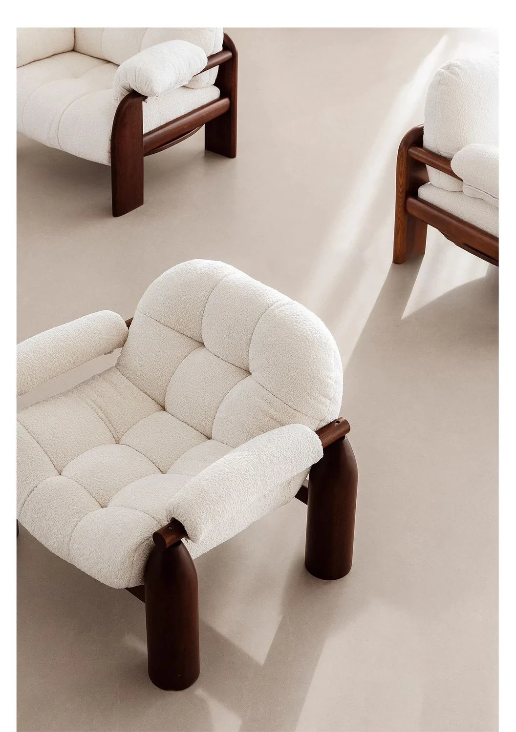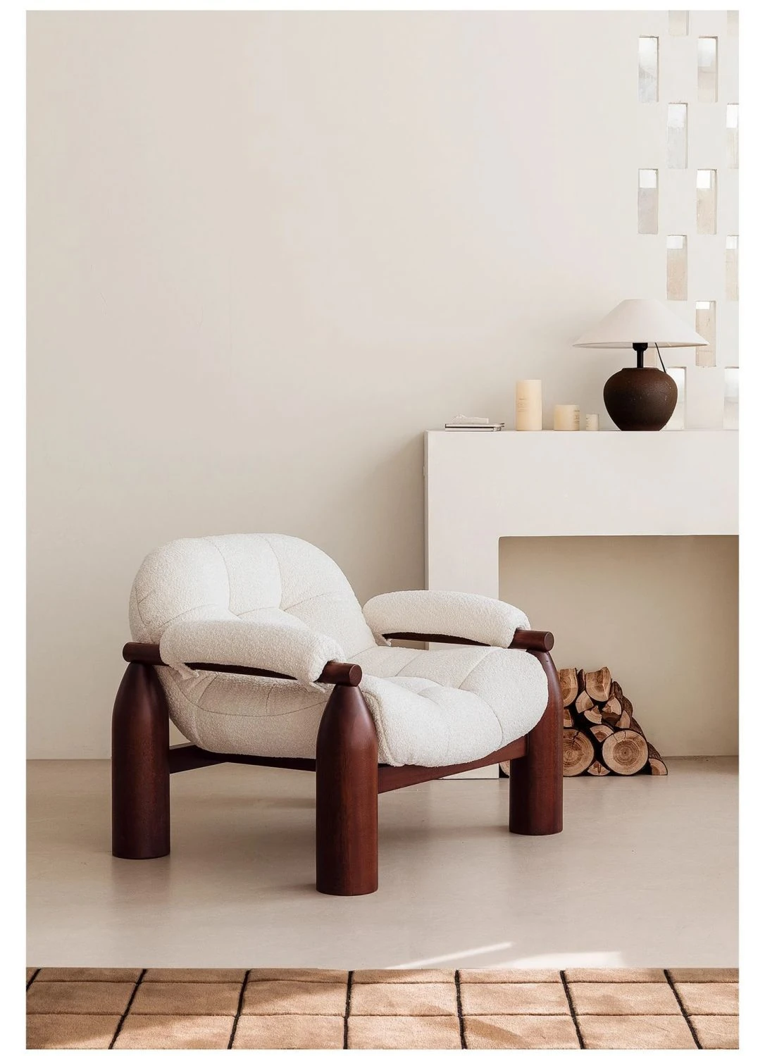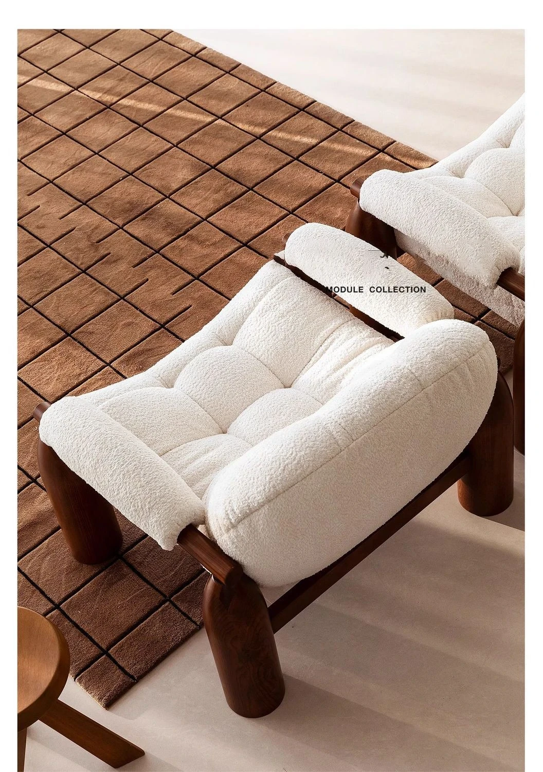 ヴィンテージ風の布製ラウンジソファチェア - デザイナーが手掛けたおしゃれな一人掛け、リビングや寝室に最適!小型住宅にもぴったりなウール素材のシープスキンチェアで、心地よいひとときを演出します。